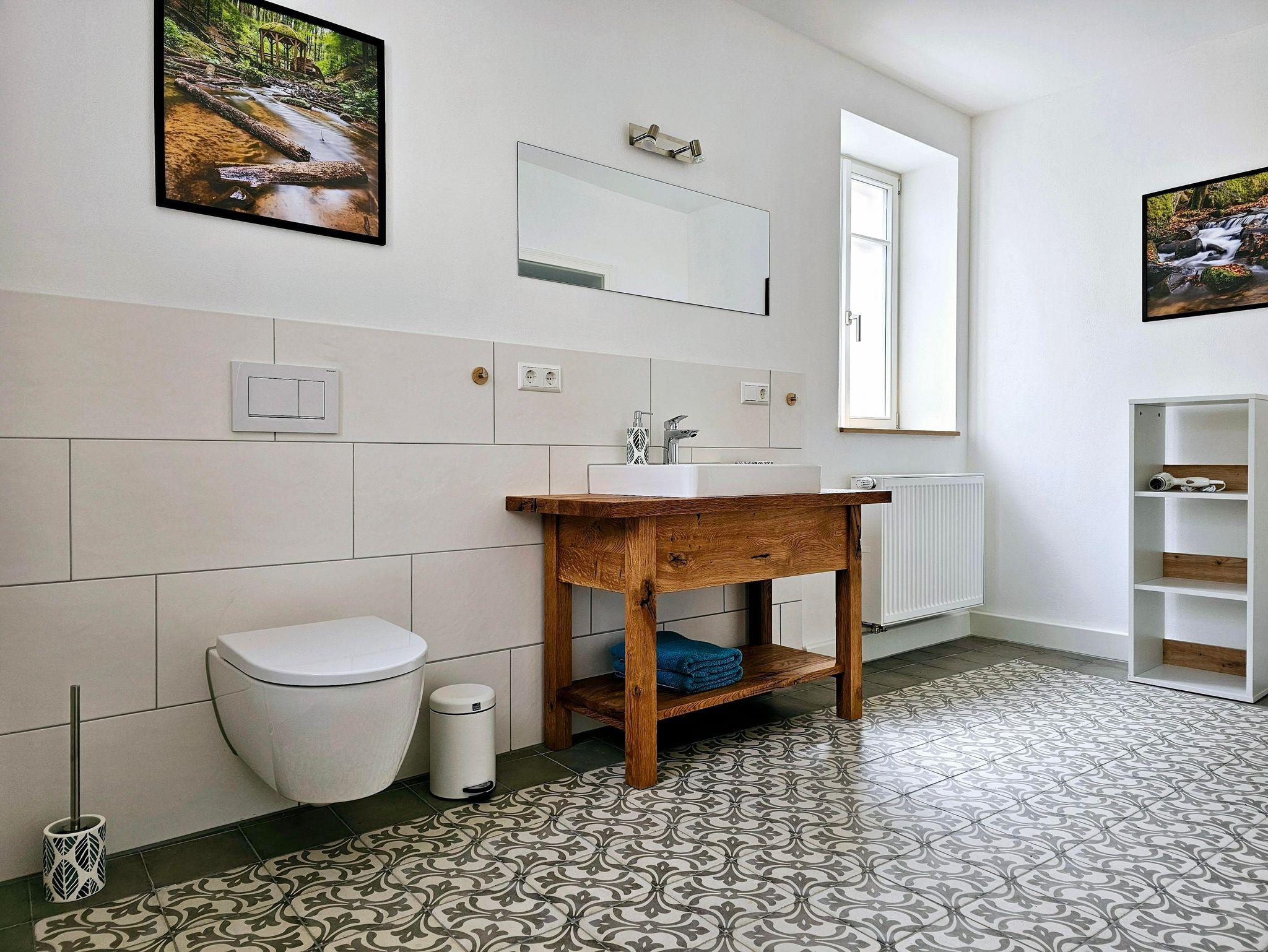 Im vorderen Bereich der Wohnung ist ein großzügiges Badezimmer mit ebenerdiger Dusche, Waschbecken und Toilette. Haarföhn und Handtücher liegen für unsere Gäste selbstverständlich bereit.