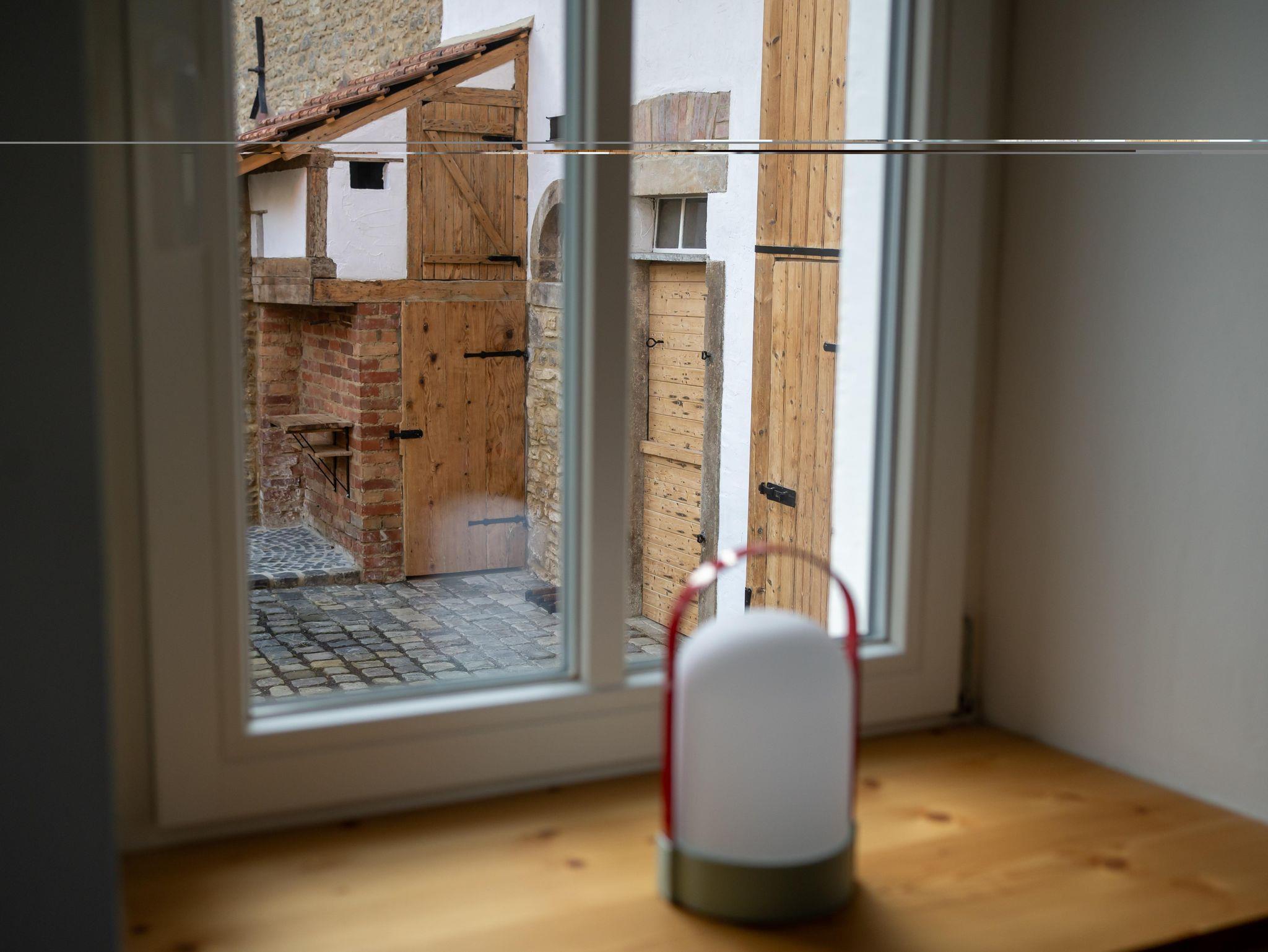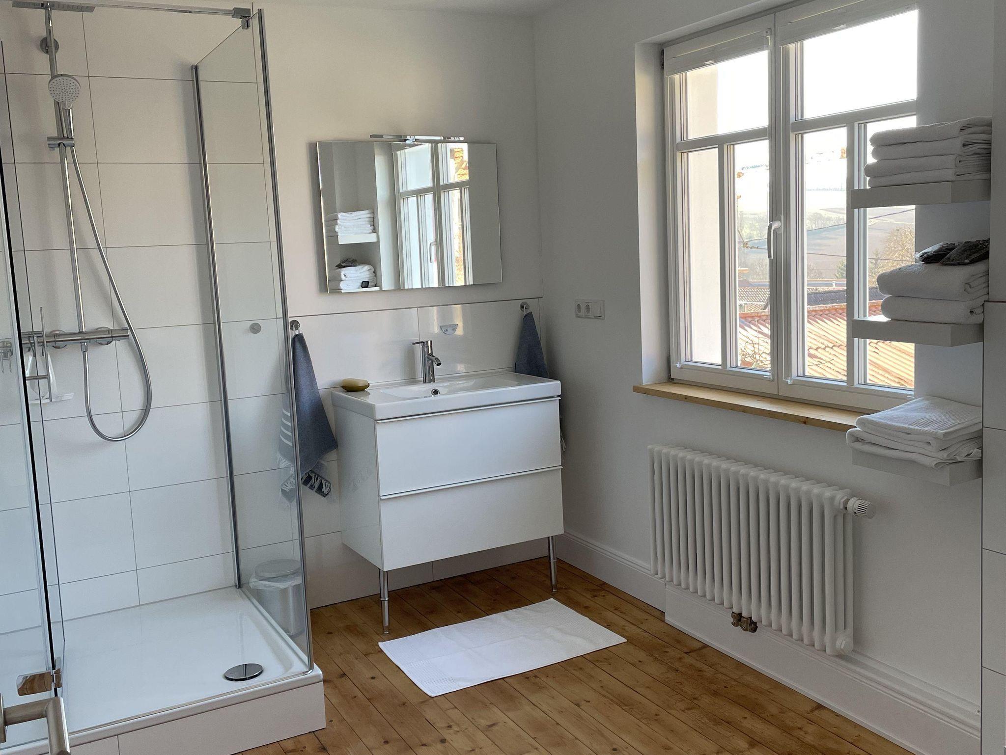Über eine steile Treppe gelangen Sie in den Schlafbereich, im dem komplett restaurierter Dielenboden verlegt ist. . Das große Schlafzimmer ist mit einem 180 cm x 200 cm Doppelbett ausgestattet und bietet aus jedem Fenster einen Blick auf die alten Dorfhäuser. Im zweiten Schlafzimmer befinden sich zwei Einzelbetten mit 90 cm x 200 cm. Alle Betten haben Komforthöhe. Neben den Betten stehen Ihnen in den Schlafzimmern ausreichend Schrankfläche zum Verstauen Ihres Gepäcks sowie im großen Schlafzimmer ein Schreibtisch zur Verfügung. Das helle und morderne Bad mit Tageslichtfenster befindet sich ebenfalls im 1. OG.