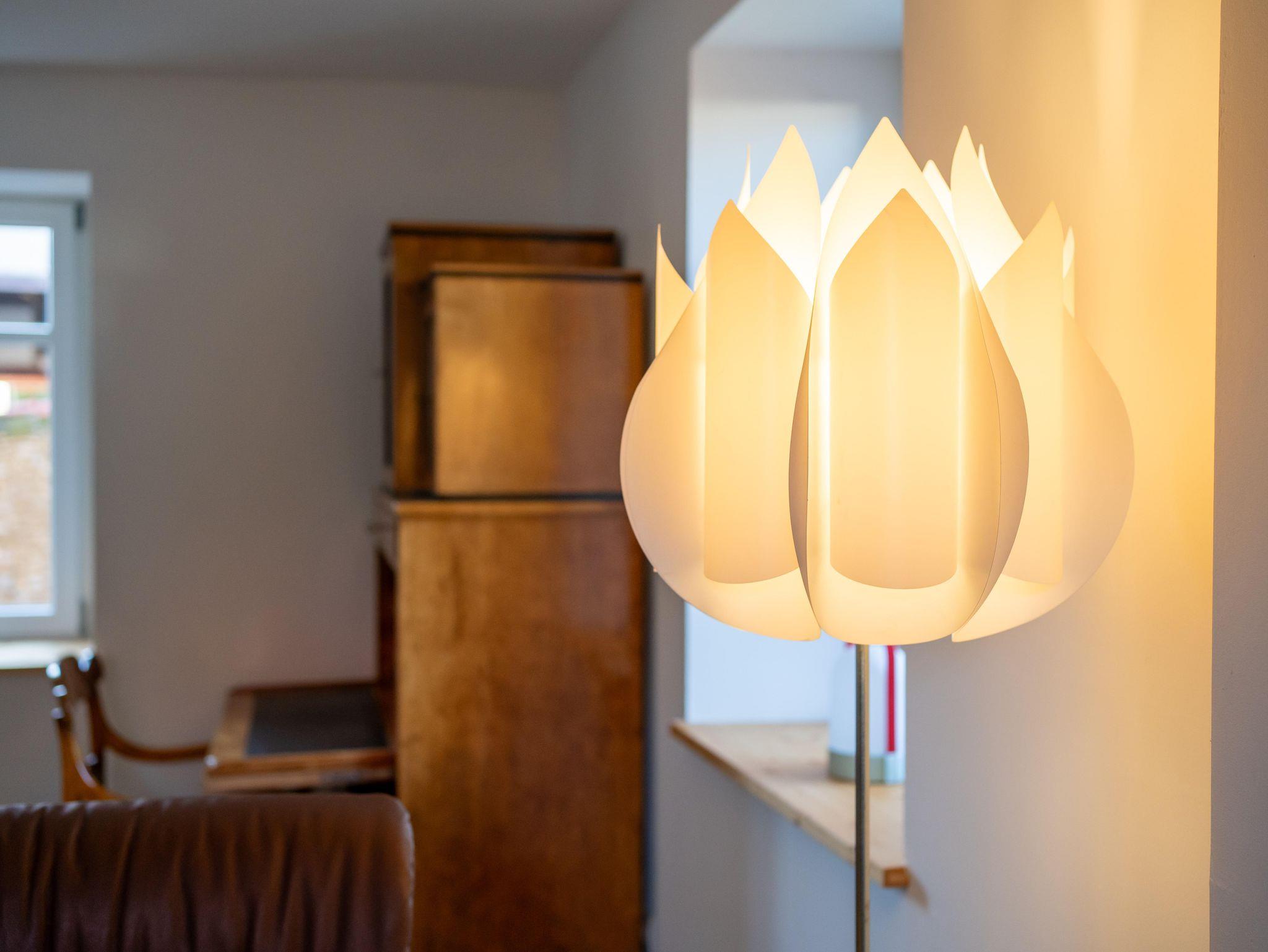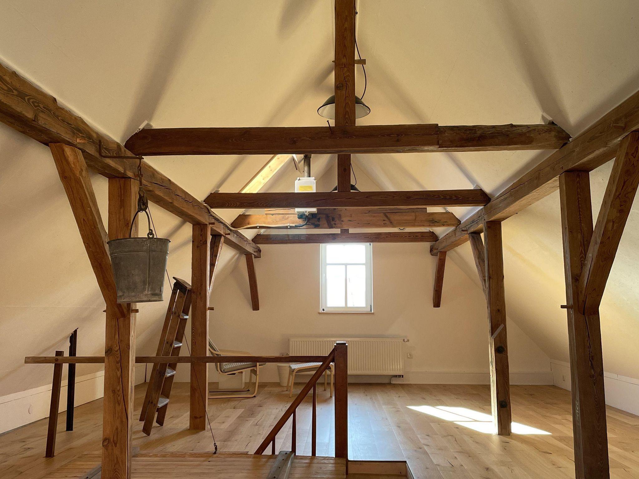 Über eine weitere Treppe gelangen Sie in das ausgebaute Atelier im Dachboden, welches mit Deckenbalken und gemütlichen Sitzen zum Entspannen einlädt.