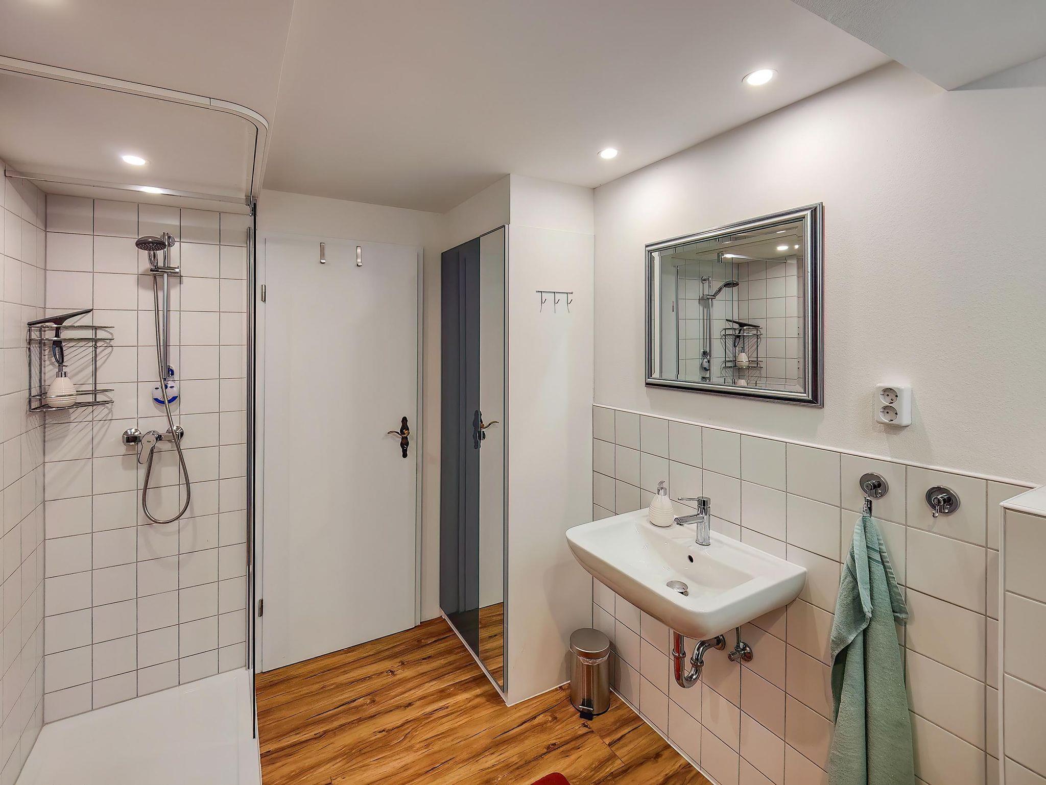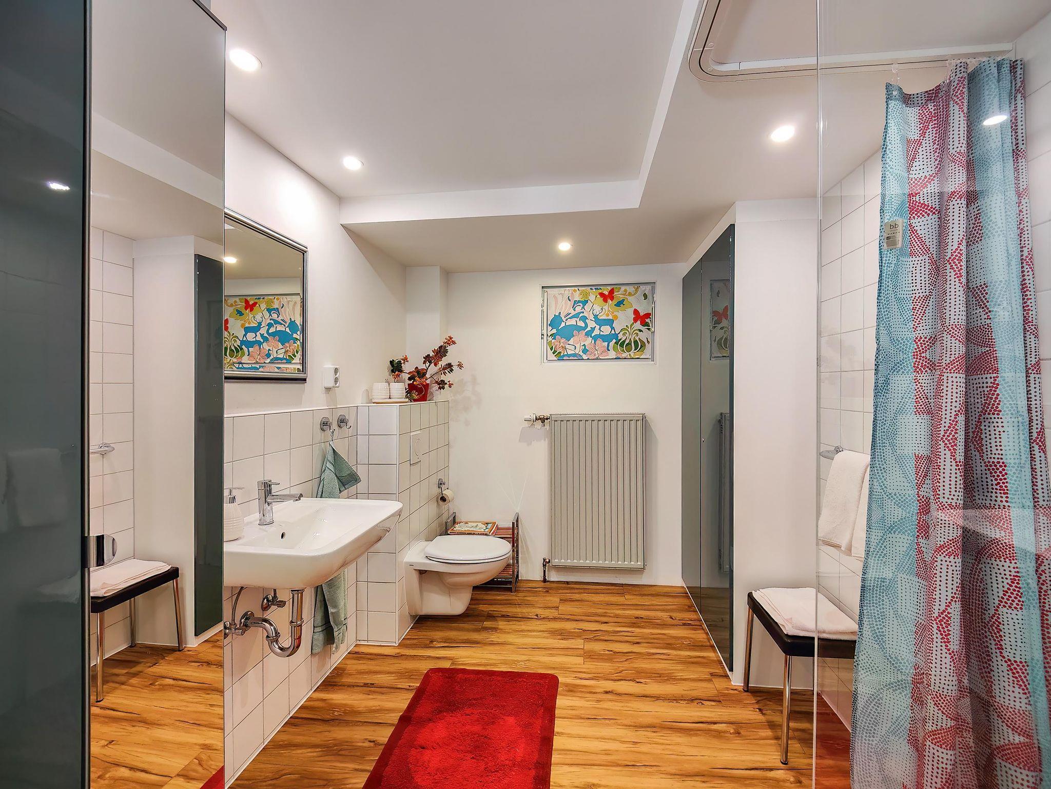 Ausstattung Bad: WC, Dusche , Waschbecken, Ganzkörperspiegel, Badetücher, Handtücher, Seife, Duschgel, Duschhauben, Föhn