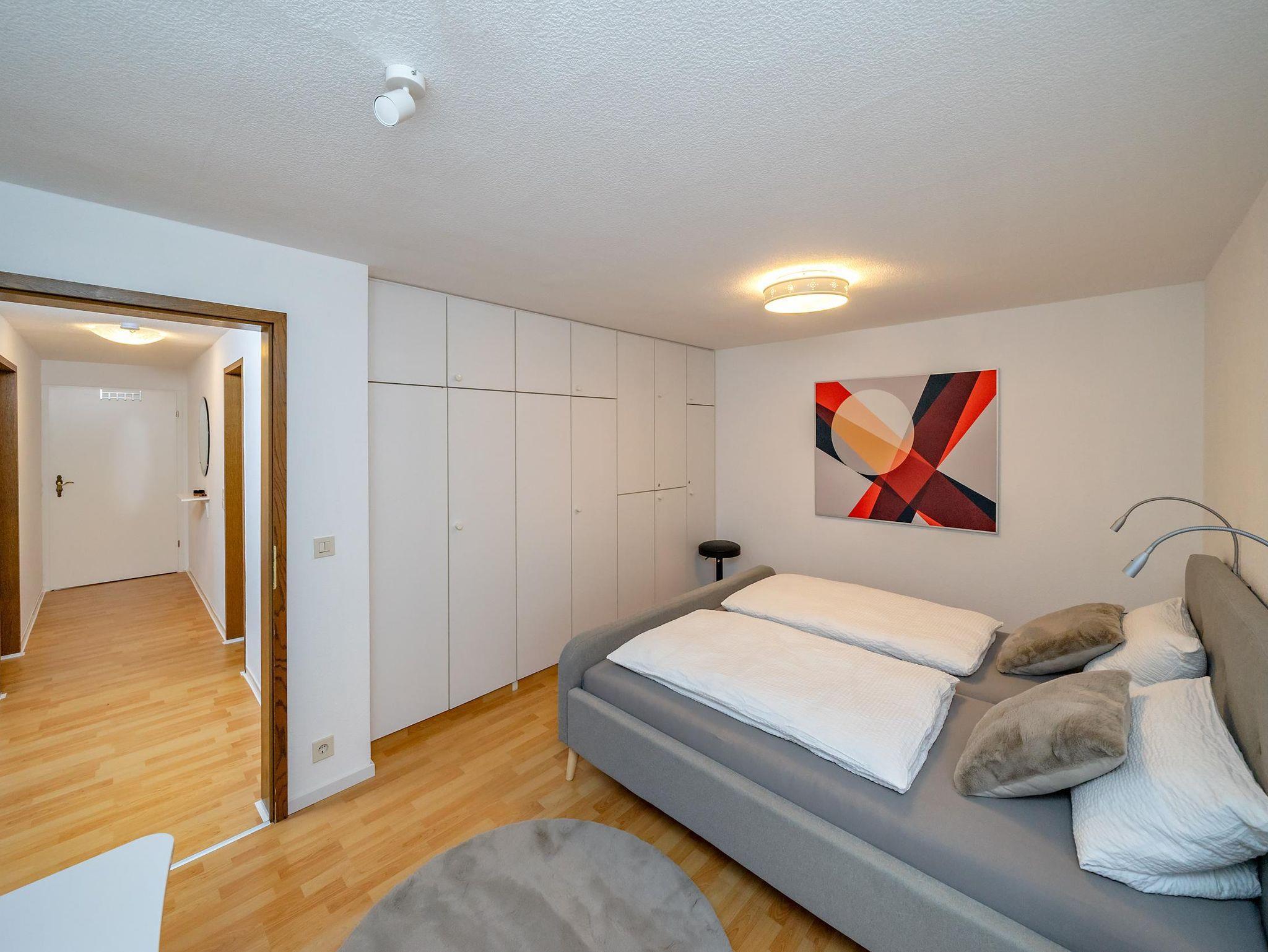 Ausstattung Schlafzimmer: Doppelbett 180×200 mit Leseleuchten, Bettwäsche (Betten bezogen), Kleiderschrank mit Safe, Schrank mit Schubladenfach, Schreibtisch, Vorhang, Rollladen