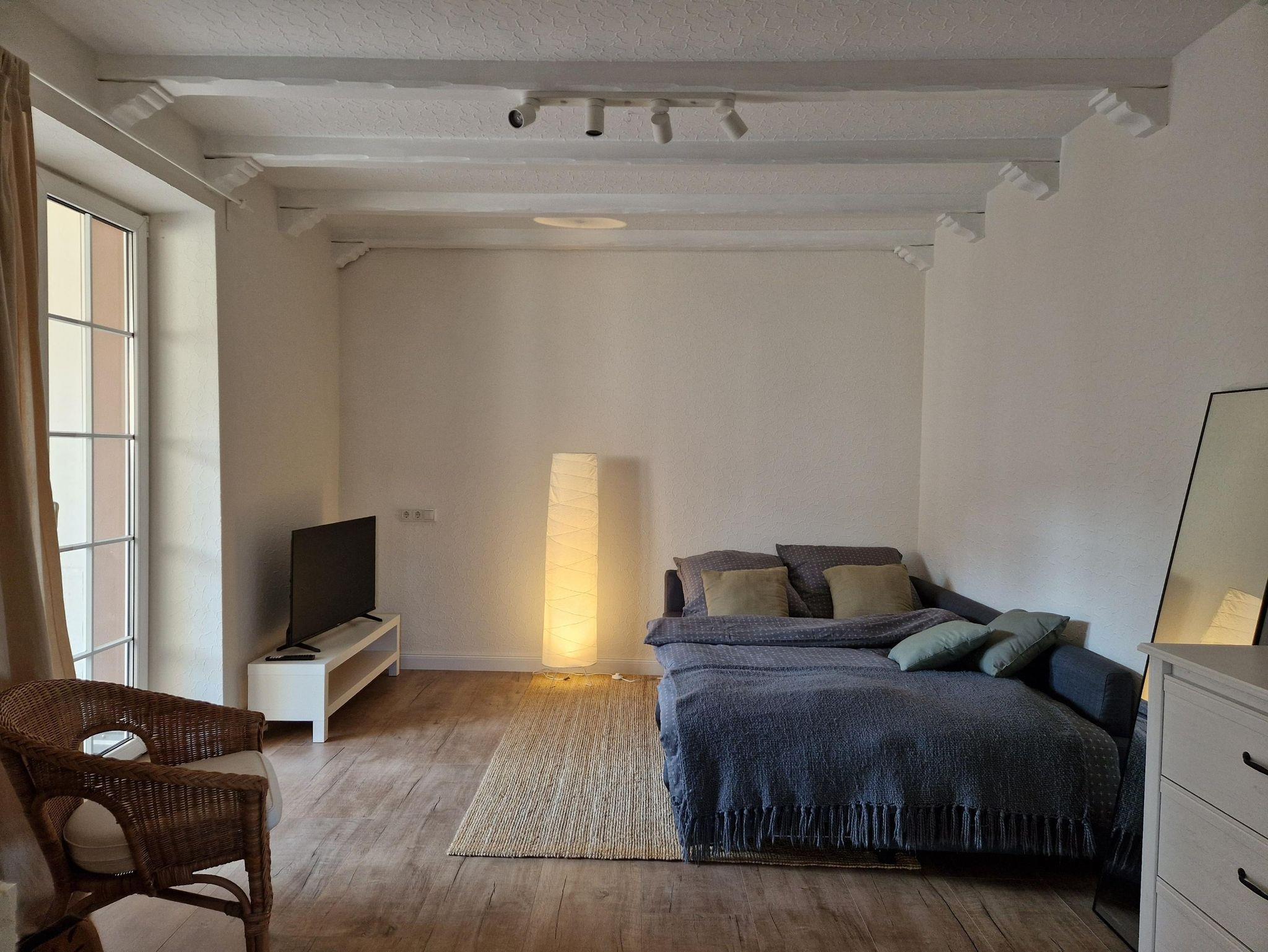 Die renovierte Wohnung verfügt über eine neue Küche in Vollausstattung mit daran anschließendem Wohnzimmer und Terrasse; gleichzeitig gelangt man von der Küche in ein helles Badezimmer (Sonderkollektion der im Saarland ansässigen Villeroy & Boch Werke) mit Badewanne und Dusche. Das gemütliche Wohnzimmer bietet eine 140cm breite Doppelschlafcouch, ein 50° TV und direkten Zugang zur teilüberdachten Terrasse und dem blickgeschützten Innenof. Rechtsseitig vom Wohnungseingang befindet sich ein Arbeitszimmer nebst einem, mit Stuckarbeiten verzierten Schlafzimmer mit 200x200cm großem Vollholzbett.