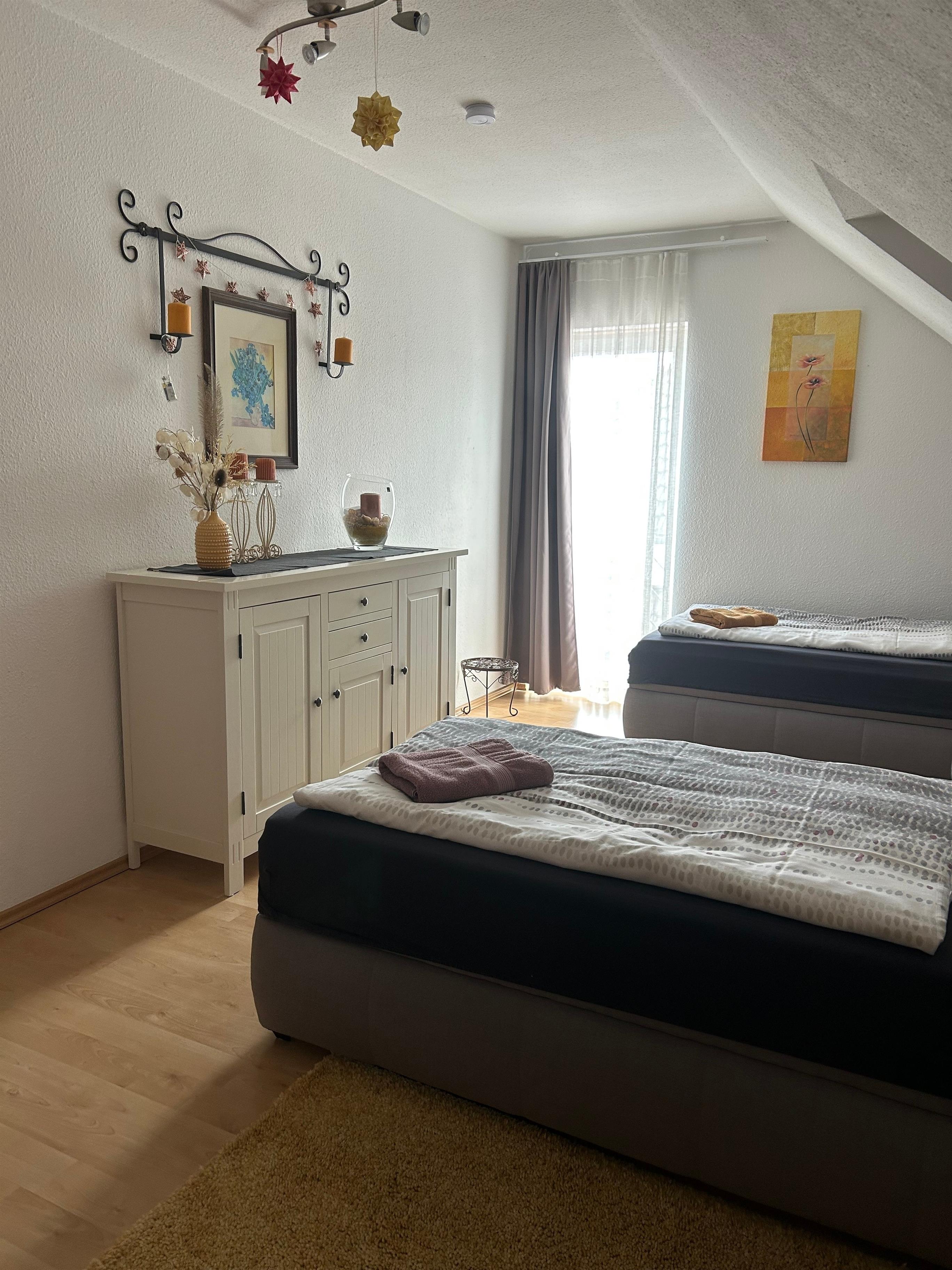 Große modern ausgestattete Nichtraucher-Wohnung mit Blick auf den Kickelhahn (Aussichtsturm und Gaststätte) und separatem Zugang. Das Haus befindet sich auf einem sonnigen Südhang in einem ruhigen Wohngebiet in Ilmenau. Die Wohnung bietet 2 Schlafzimmer,eins mit 1 Doppelbett, das Zweite mit Einzelbetten, das Wohnzimmer ist kombiniert mit Küche und Essbereich sowie mit Schlafcouch und Ein Badezimmer. Die Wohnung ist somit perfekt für Familien oder Freunde, die zusammen Urlaub machen wollen, geeignet. Kinder unter 2 Jahre sind kostenfrei
