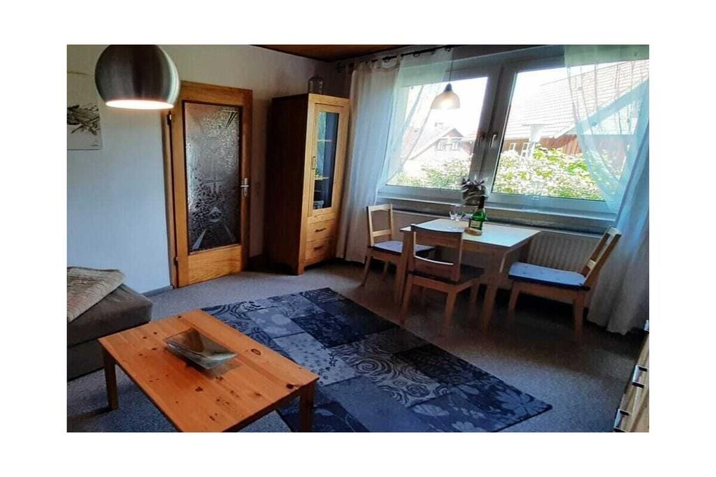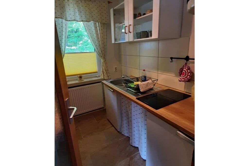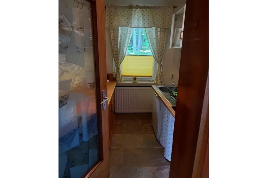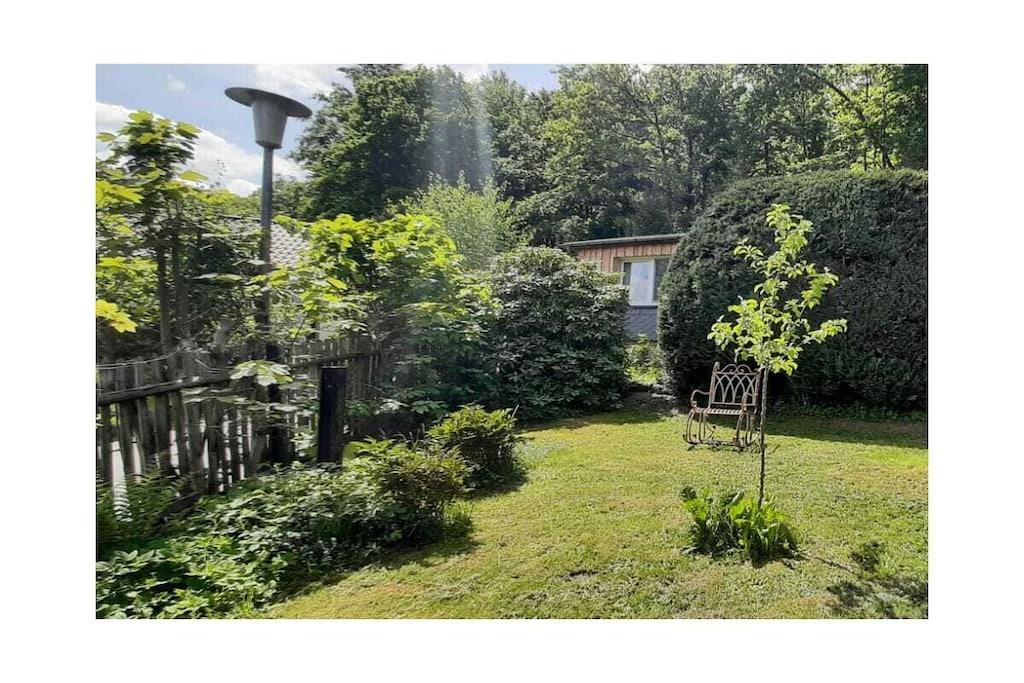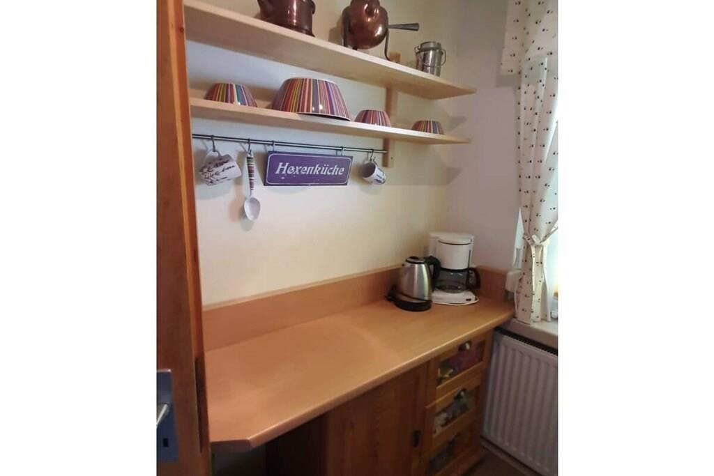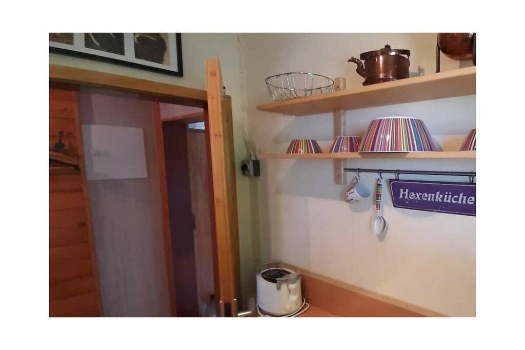 Stueetage: (Køkken(, , tekøkken, kogeplade, elkedel, brødrister, komfur, kaffemaskine, køleskab, fryser), Stue/soveværelse(, , bibliotek, enkeltsovesofa, Fjernsyn, radio), soveværelse(, , dobbeltseng), badeværelse(, toilet, bruser, håndvask)) , Internetadgang, varme, terrasse(havemøbler), parkering, tørreskab