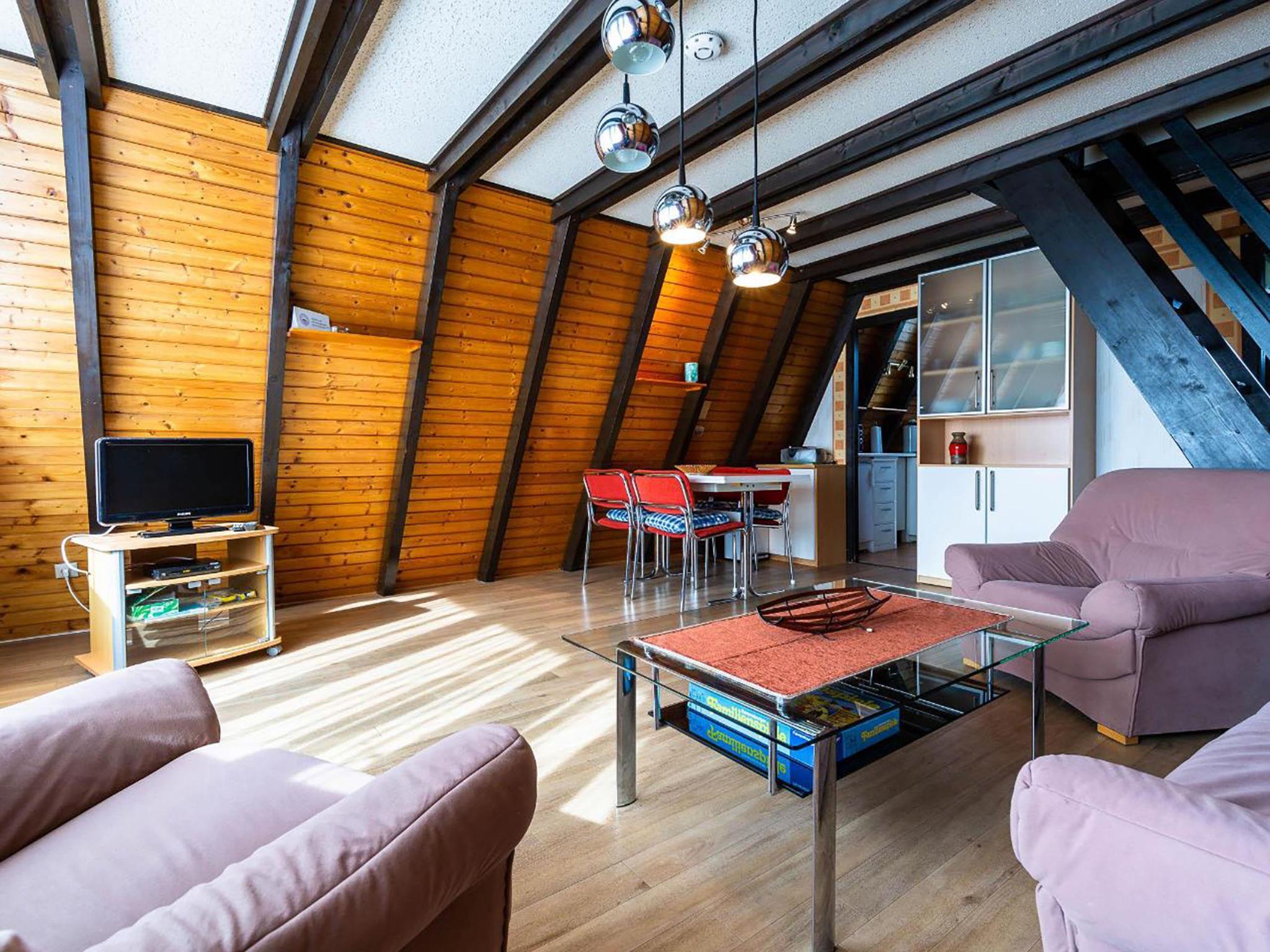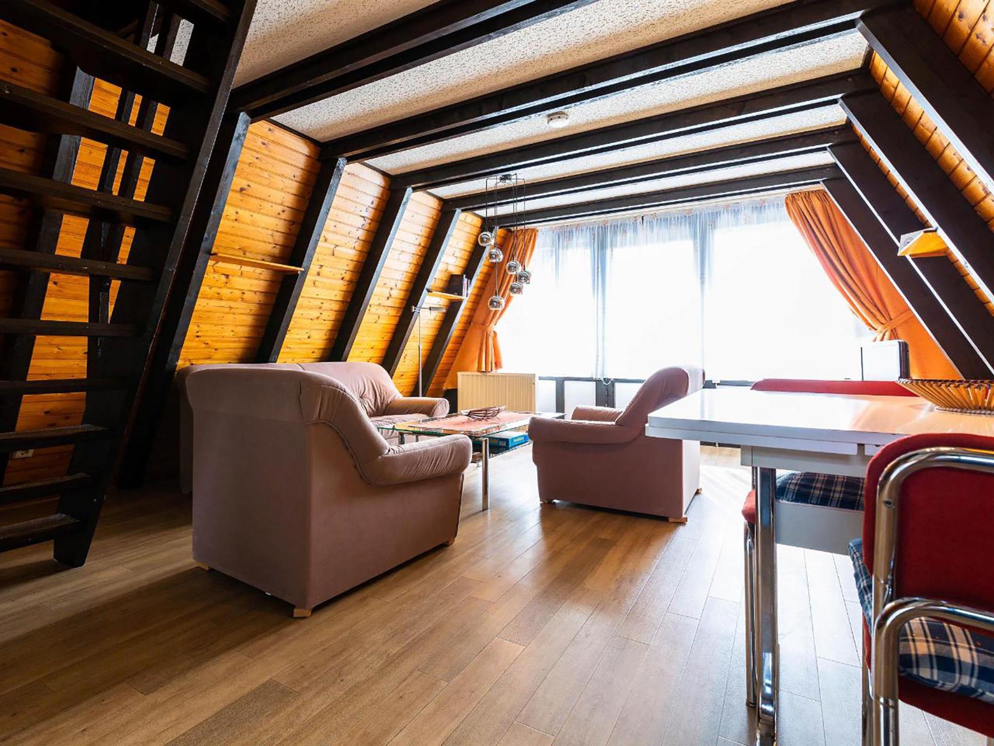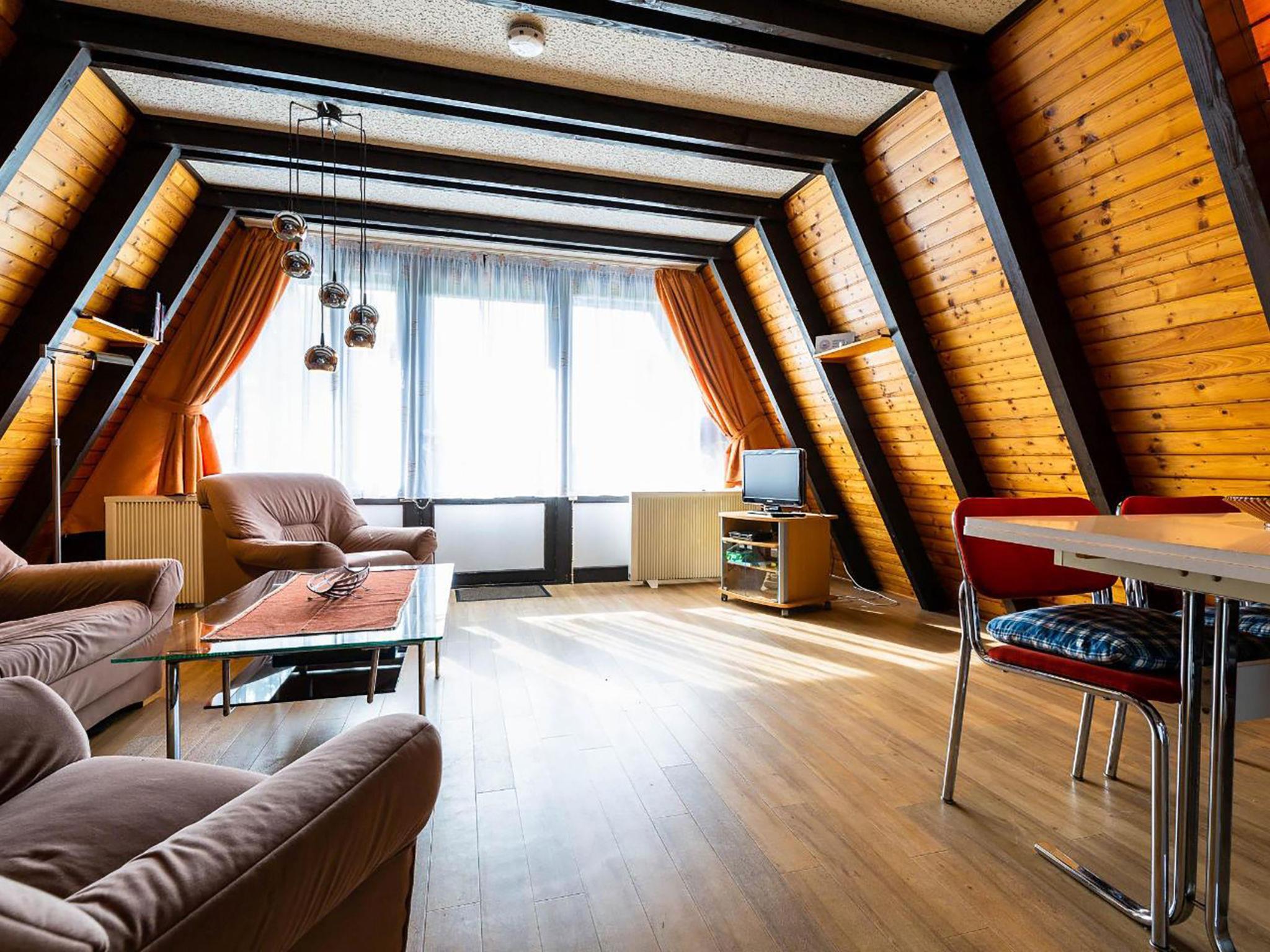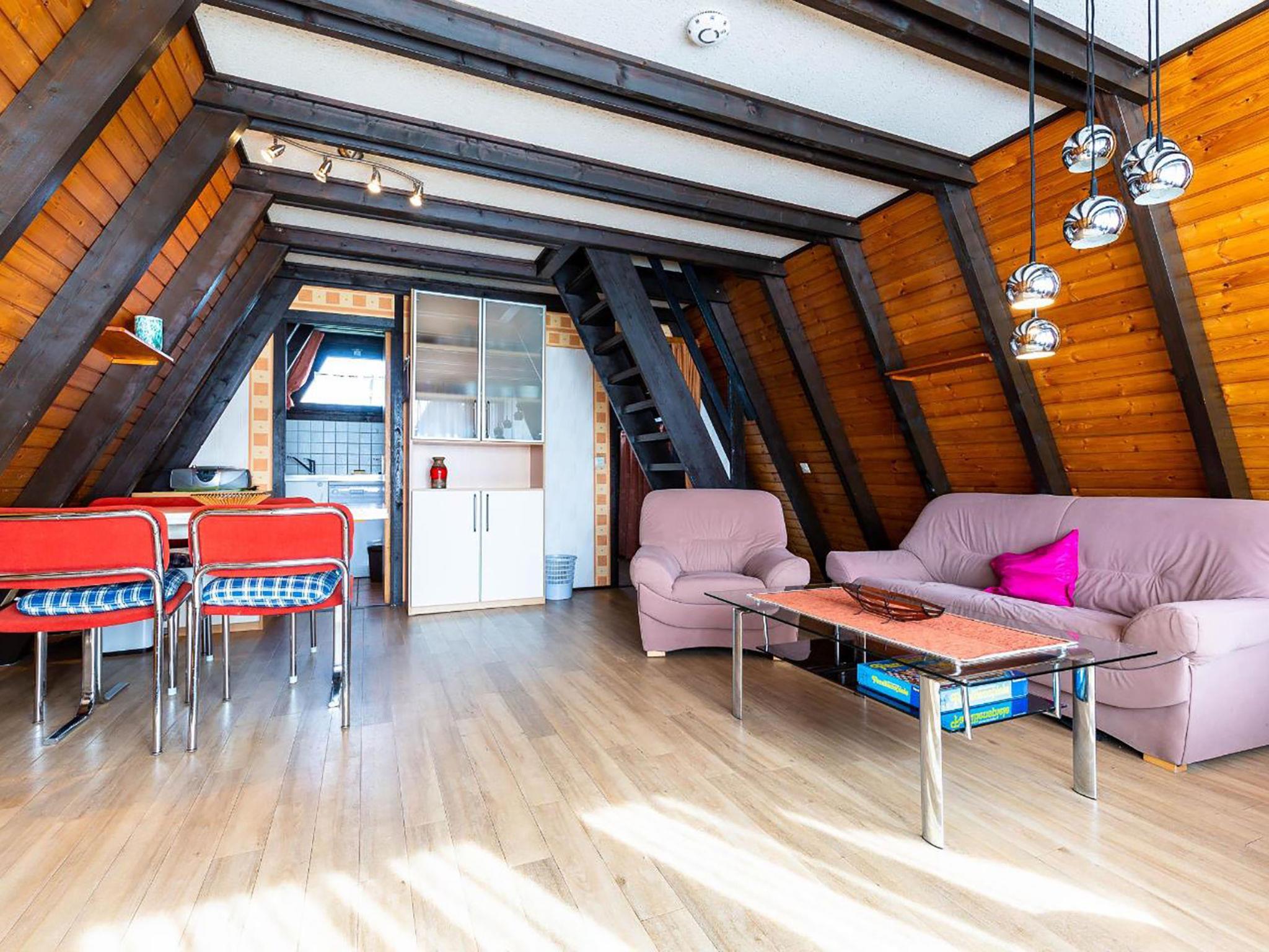 3-room house 50 m2 on 2 levels, on the ground floor. With sloping ceilings: living/dining room with satellite TV and radio. Exit to the garden, to the terrace. With sloping ceilings, open kitchen (2 hot plates, electric coffee machine). Shower/WC. Top floor: (steep stair), 2 rooms with sloping ceilings, each room with 2 beds. Electric heating. Terrace furniture. Facilities: Internet (WiFi, free). Please note: non-smoking house. Maximum 1 small pet/ dog allowed. A-frame house in wood construction.