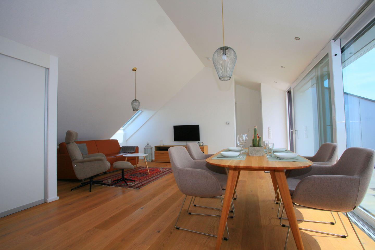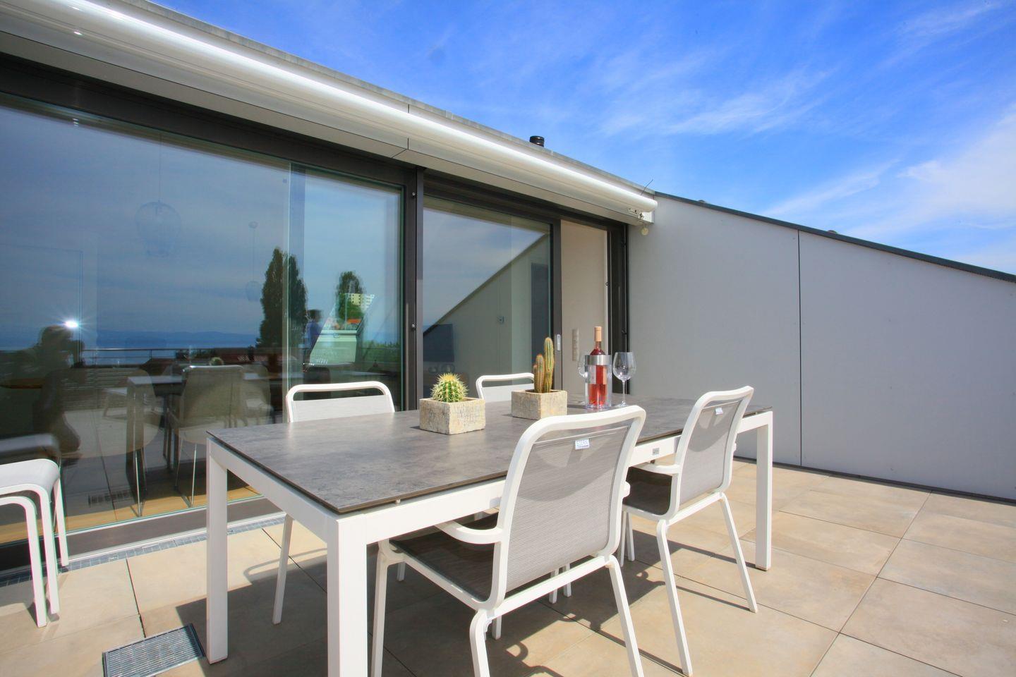 Genießen Sie unvergessliche Urlaubstage in dieser exklusiven Wohnung mit einer beeindruckenden Dachterrasse, die Ihnen von morgens bis abends einen atemberaubenden Blick auf den Bodensee und die Alpen bietet. Der See und der kostenlose Strand sind nur wenige Schritte entfernt, ebenso wie Geschäfte und Restaurants.