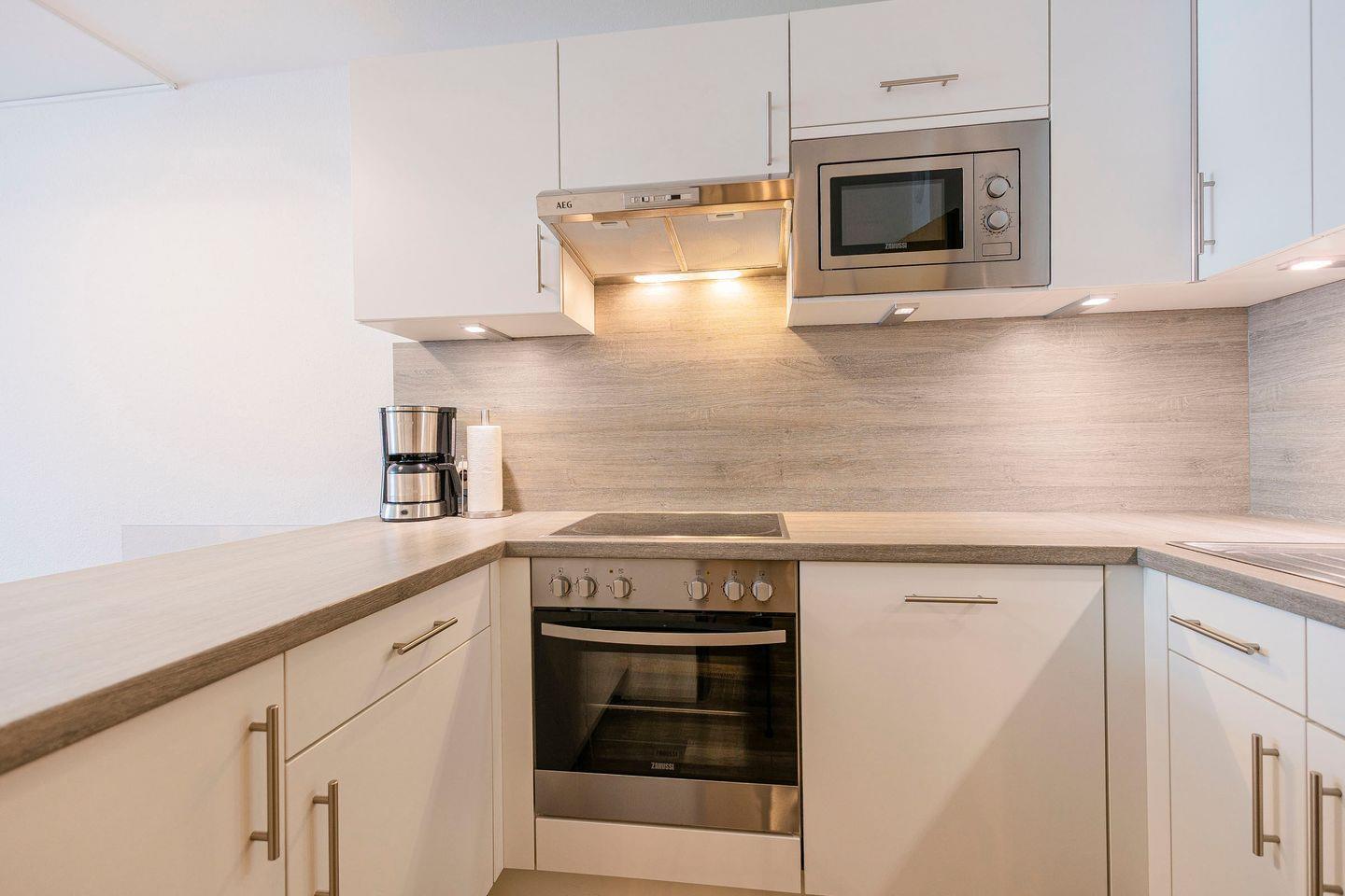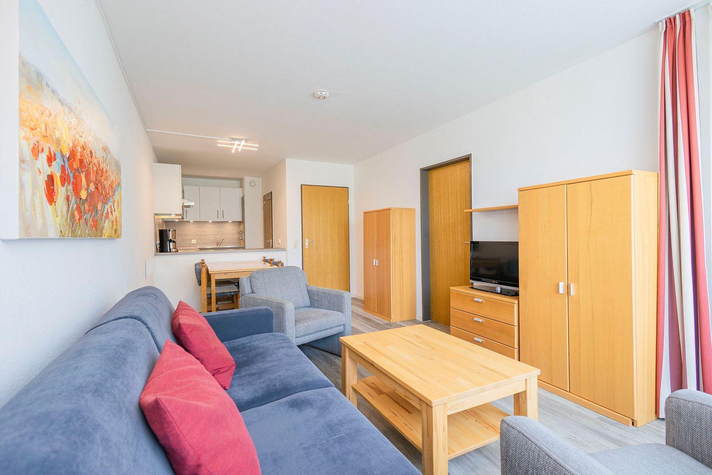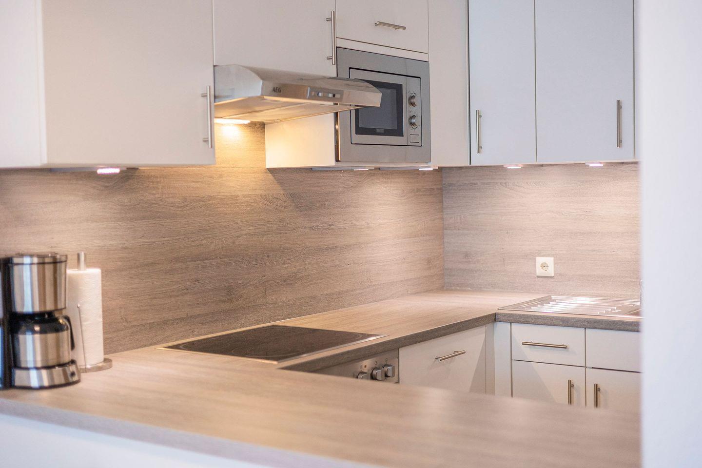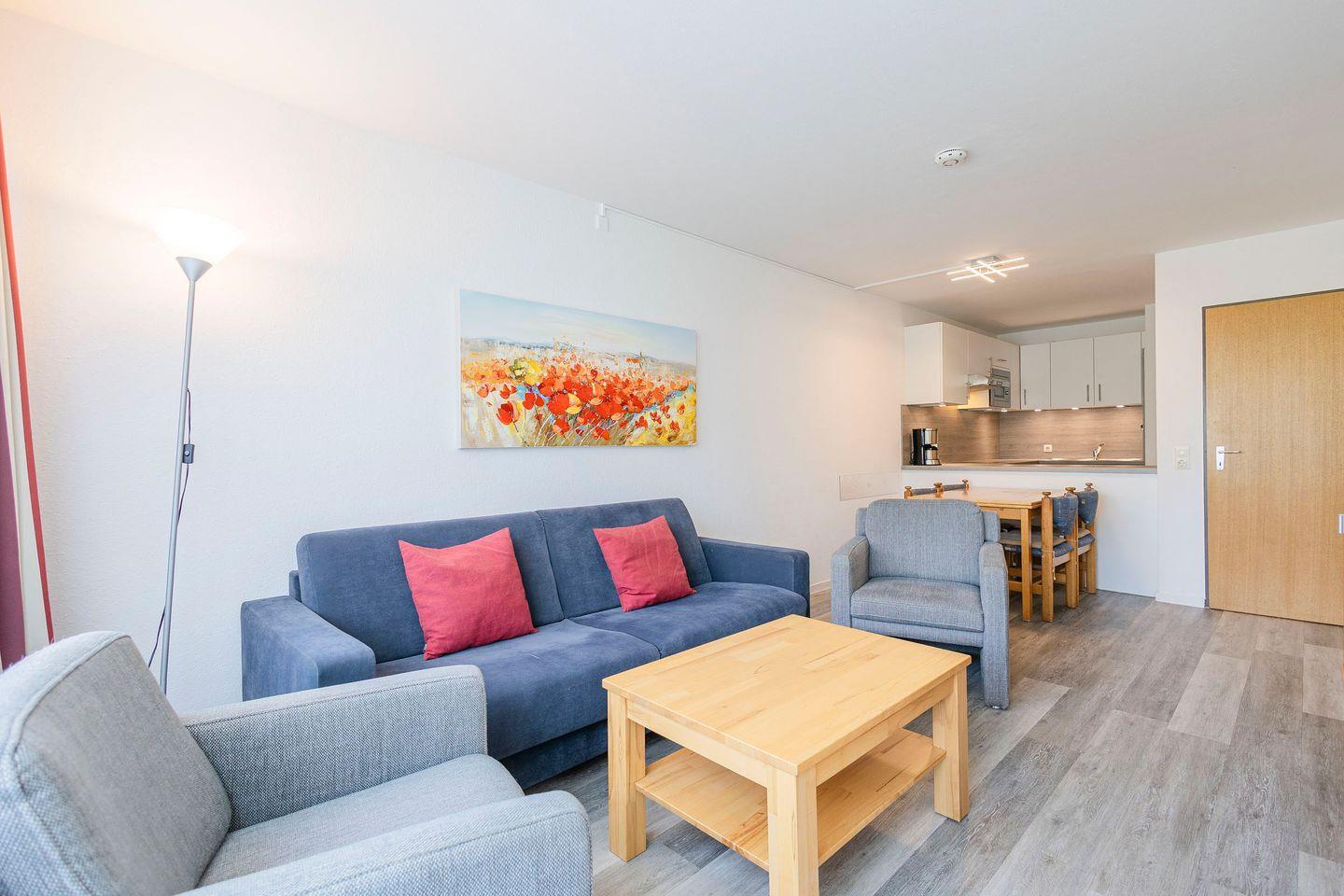 Sie verfügt über ein Schlafzimmer mit Doppelbett, ein Wohnzimmer mit Schlafsofa und eine moderne Küche mit Spülmaschine und Backofen, Bad mit Badewanne und möblierten Balkon.
