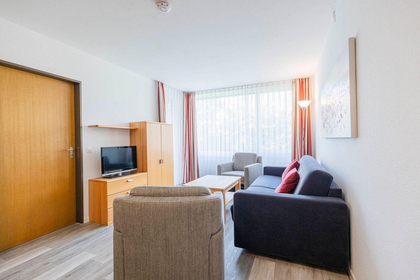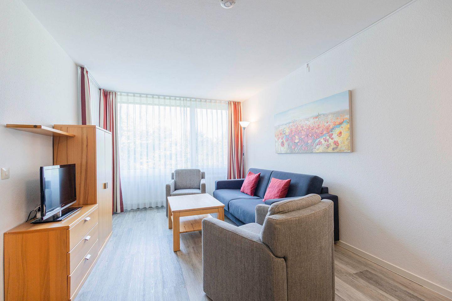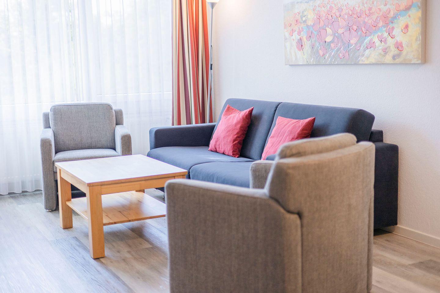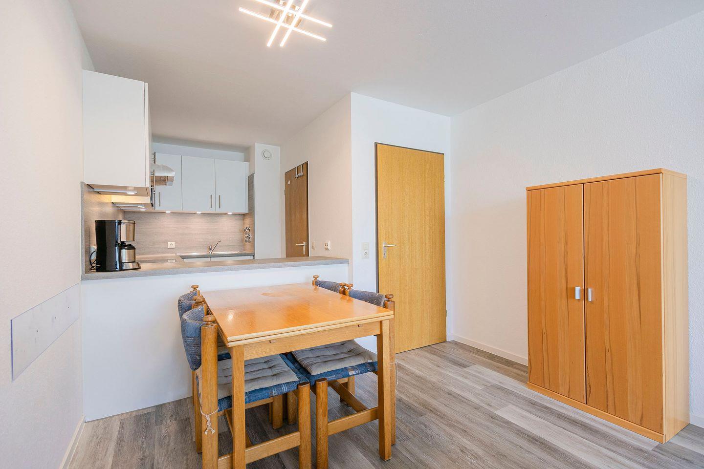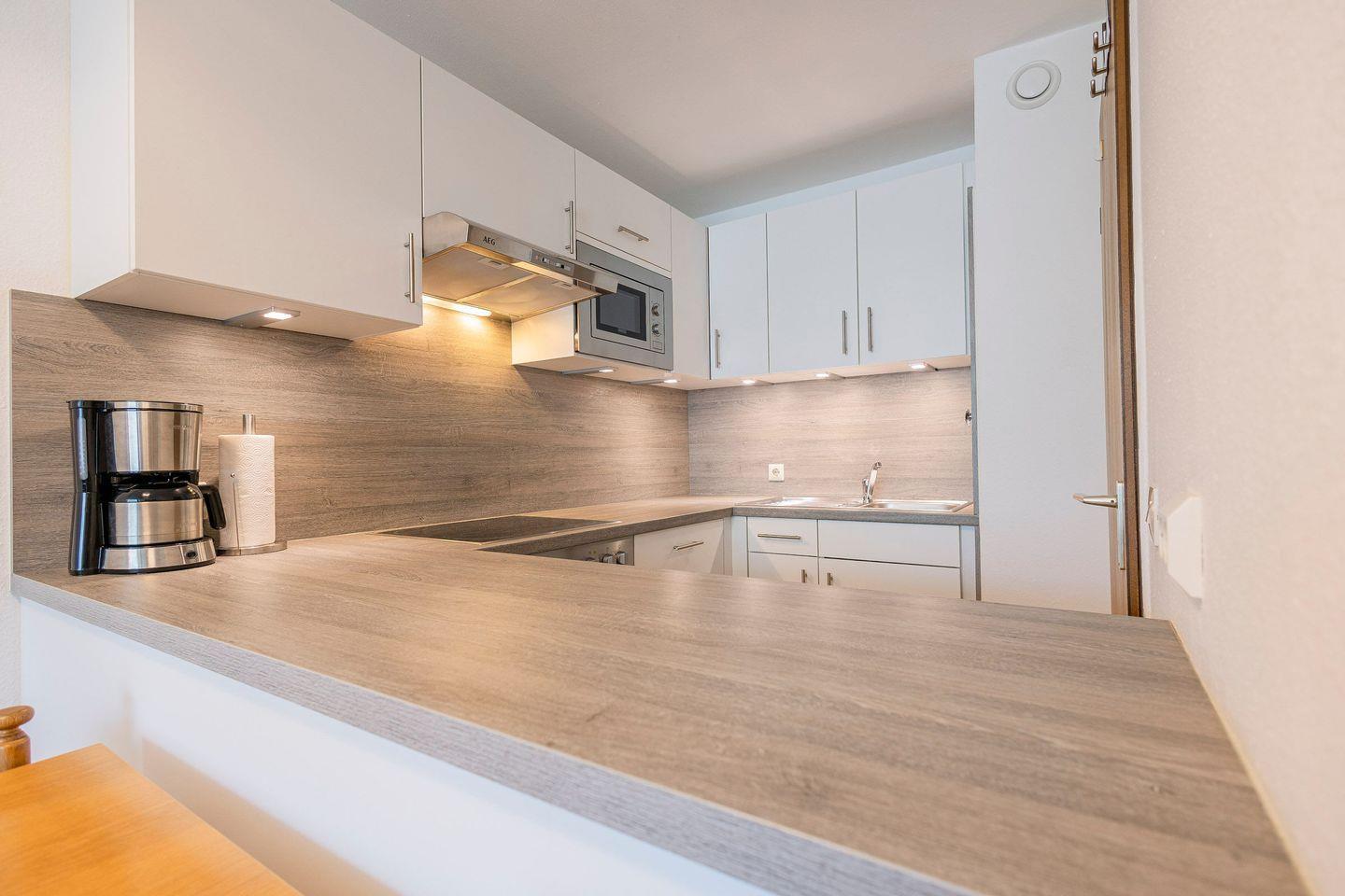 Sie verfügt über ein Schlafzimmer mit Doppelbett, ein Wohnzimmer mit Schlafsofa und eine moderne Küche mit Spülmaschine und Backofen, Bad mit Badewanne und möblierten Balkon.