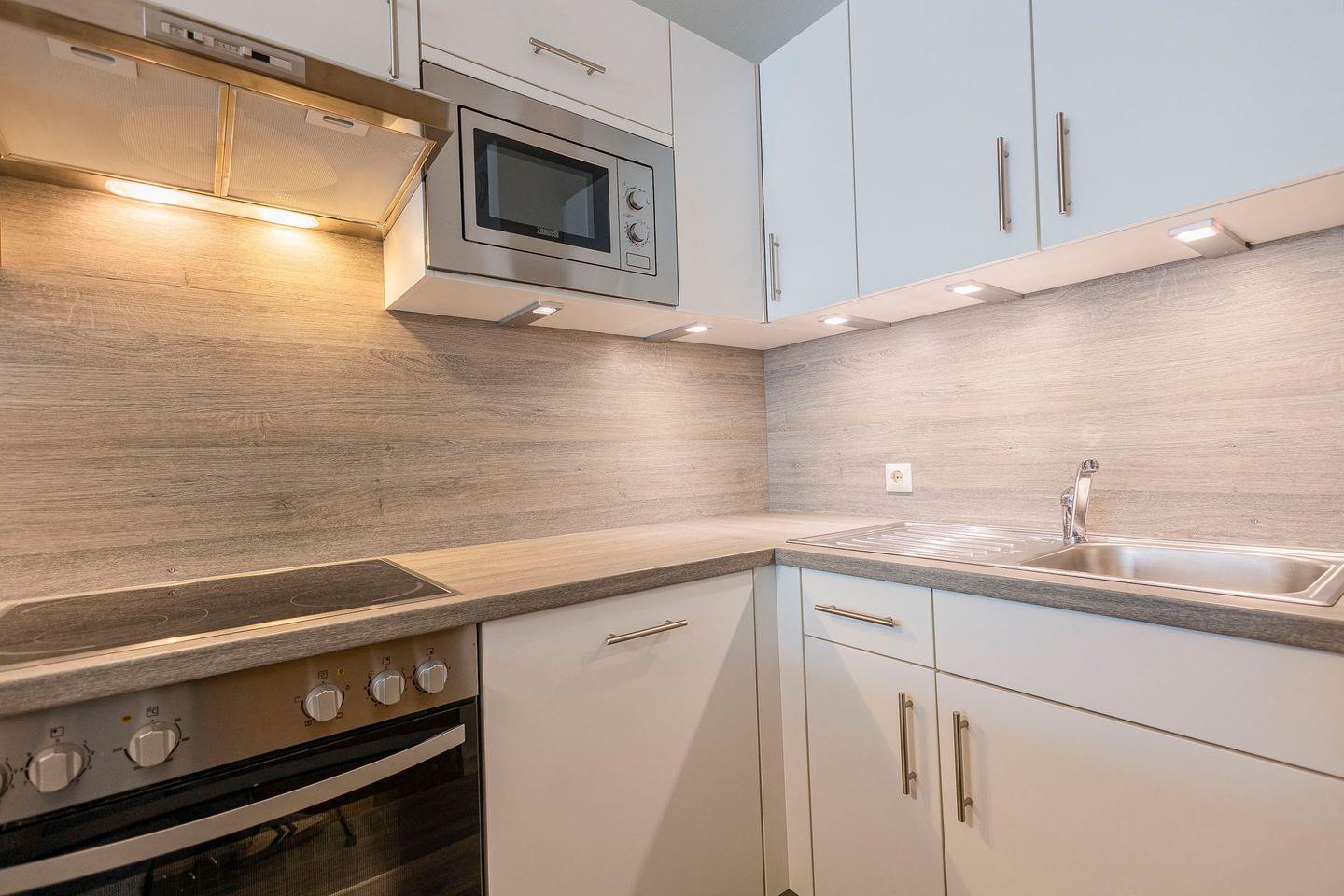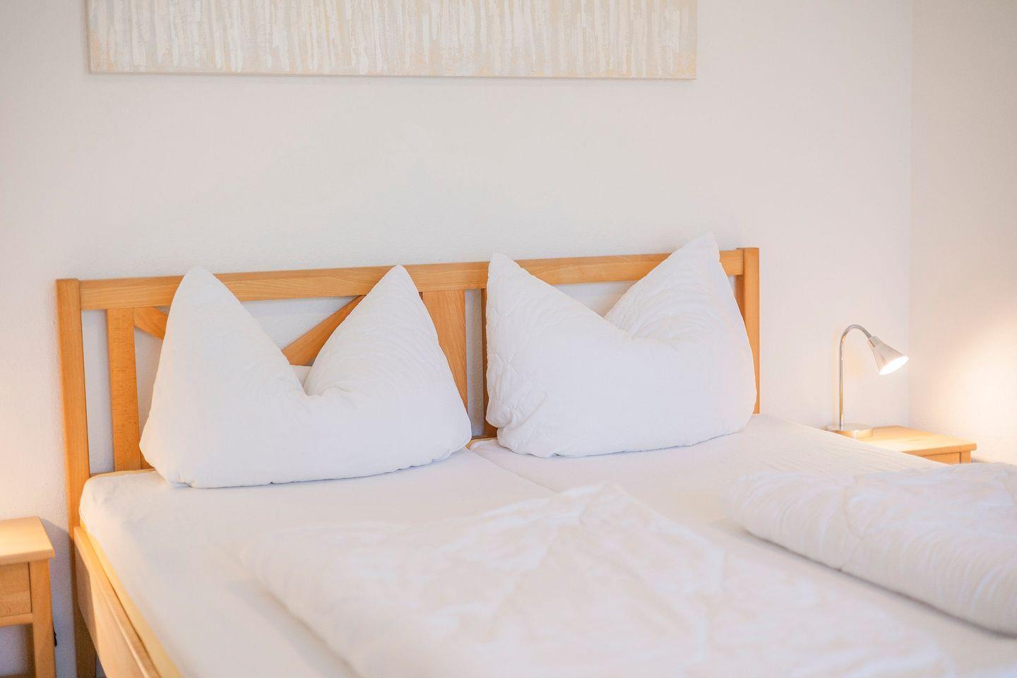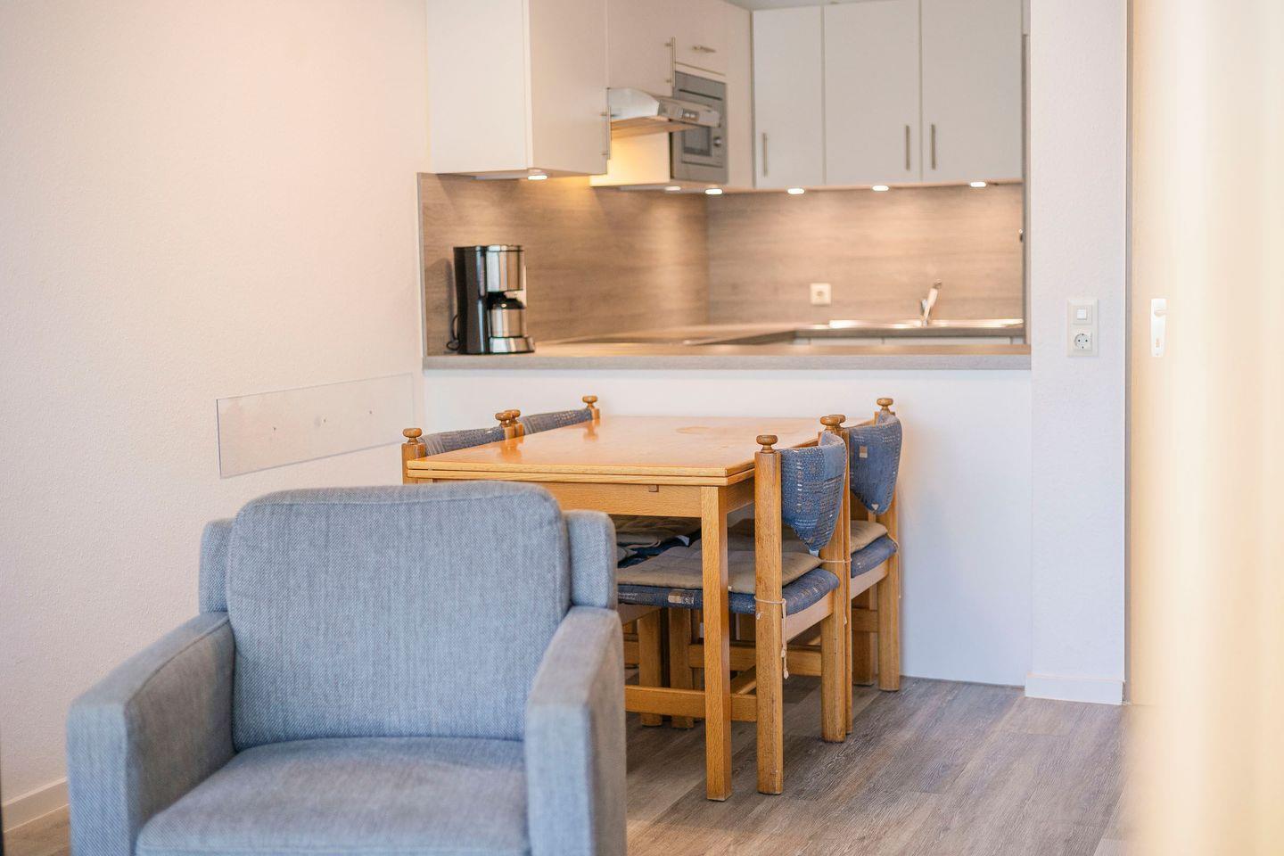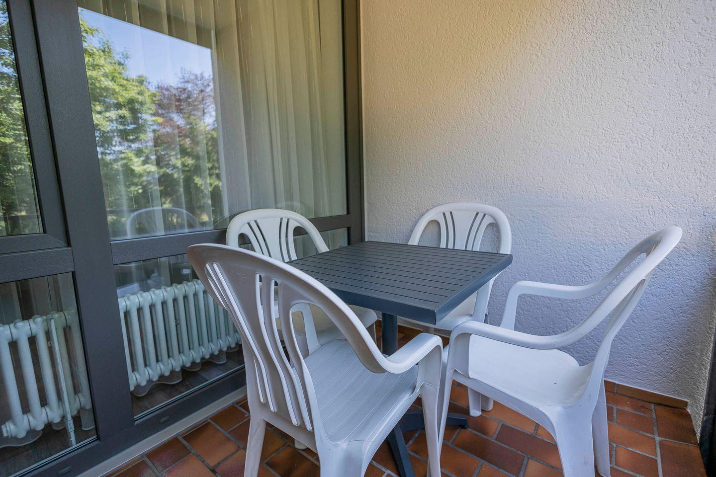 Sie verfügt über ein Schlafzimmer mit Doppelbett, ein Wohnzimmer mit Schlafsofa und eine moderne Küche mit Spülmaschine und Backofen, Bad mit Badewanne und möblierten Balkon.