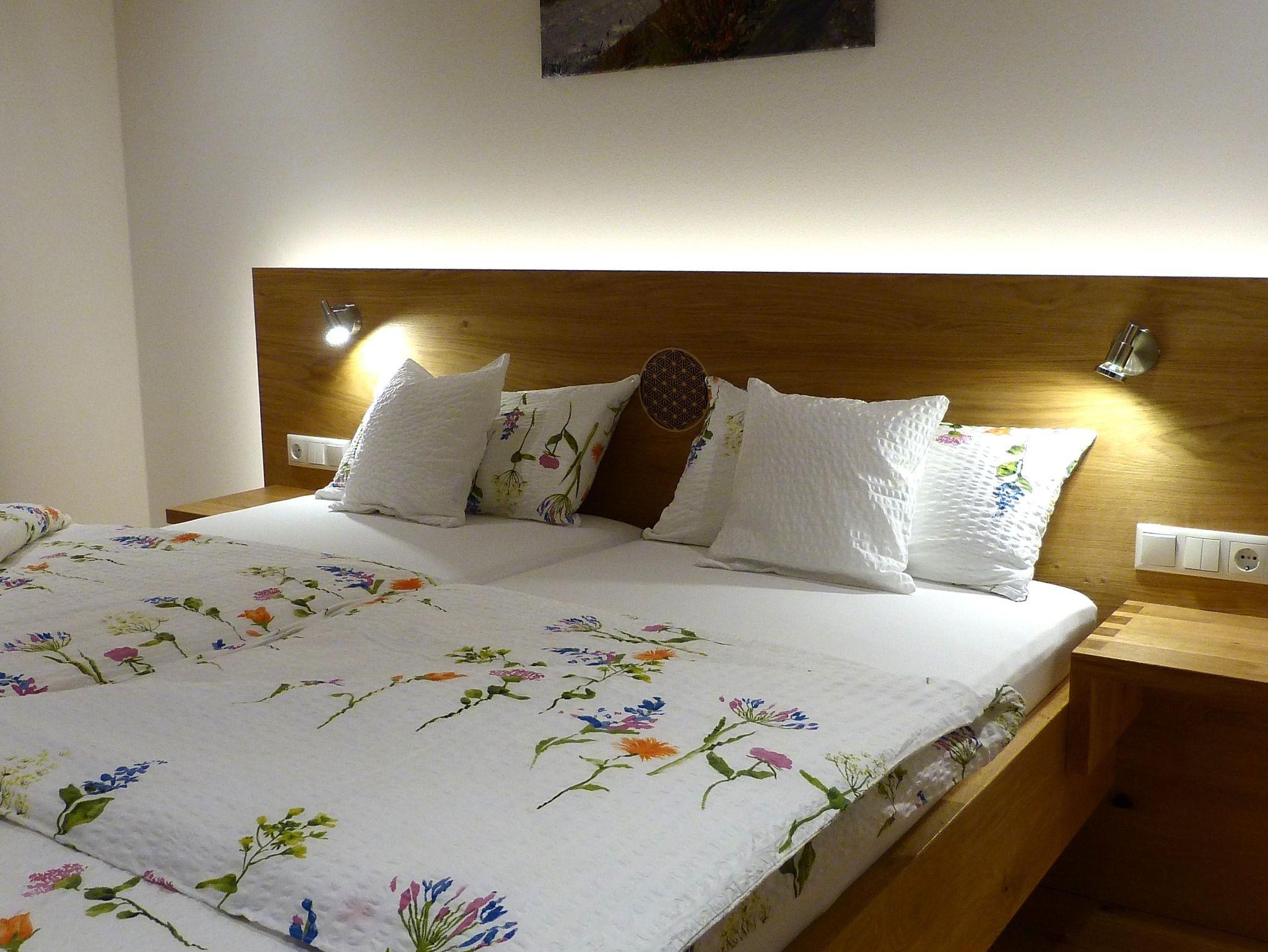 • zwei Schlafzimmer mit rustikalen Betten in naturbelassener Eiche