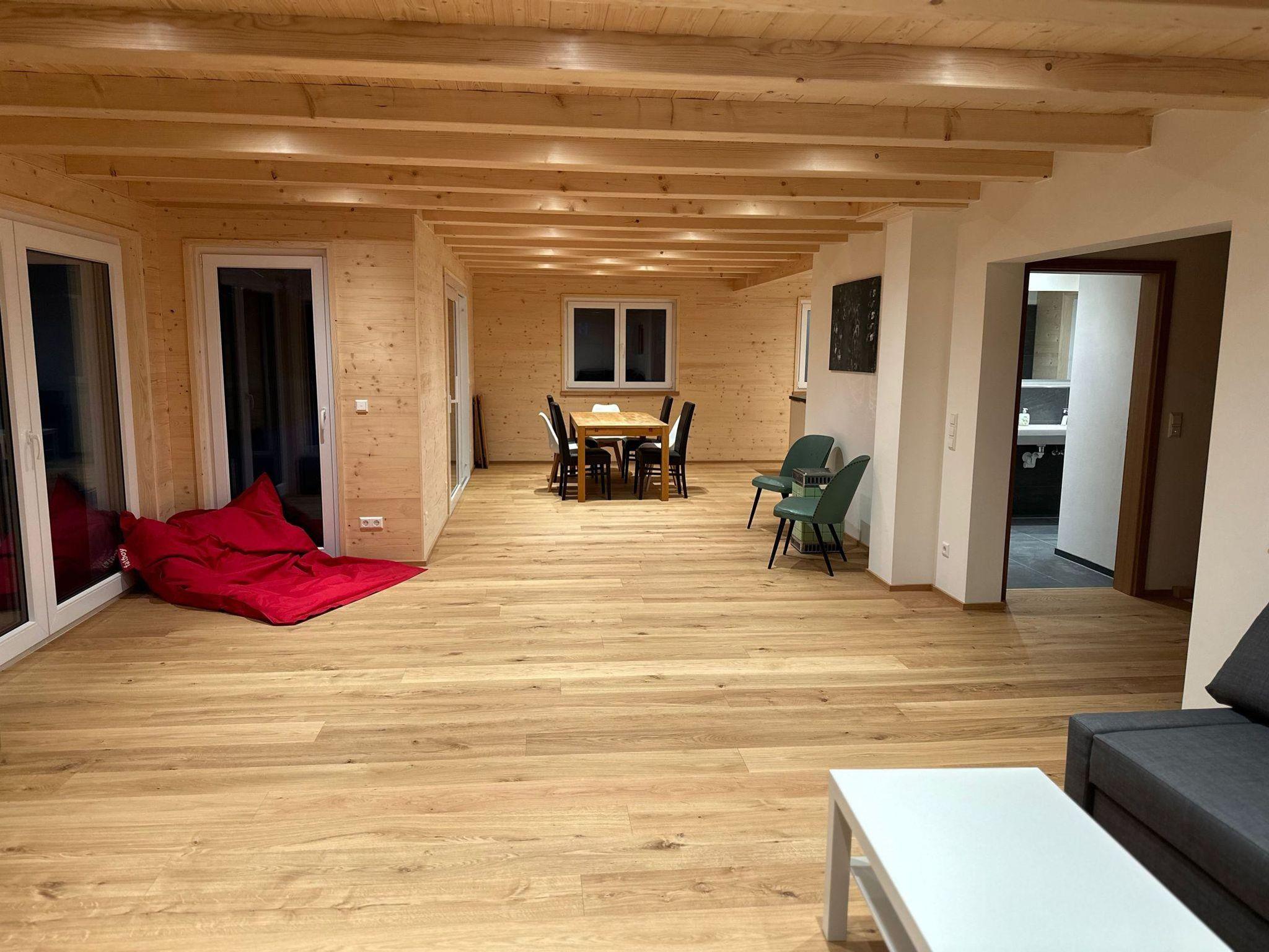 In unserer großen Ferienwohnung Löwenzahn stehen Ihnen 2 Ebenen zur Verfügung: Im Erdgeschoss befindet sich das schöne große Wohnzimmer mit Essbereich und Küche (59qm), ein Schlafzimmern (13qm), ein Badezimmer, der Eingangsbereich und die Terrasse. Im Obergeschoss sind 3 weitere Schlafzimmer (11 bis 16qm), ein Süd- und ein West-Balkon und ein weiteres Badezimmer. Der offene Dachstuhl, die Holzbalkendecke auf beiden Geschossen sowie die traumhafte Aussicht vom Säuling im Osten über den Grünten bis zum Allgäuer Hauptkamm garantiert Ihnen einen genussvollen Aufenthalt.
