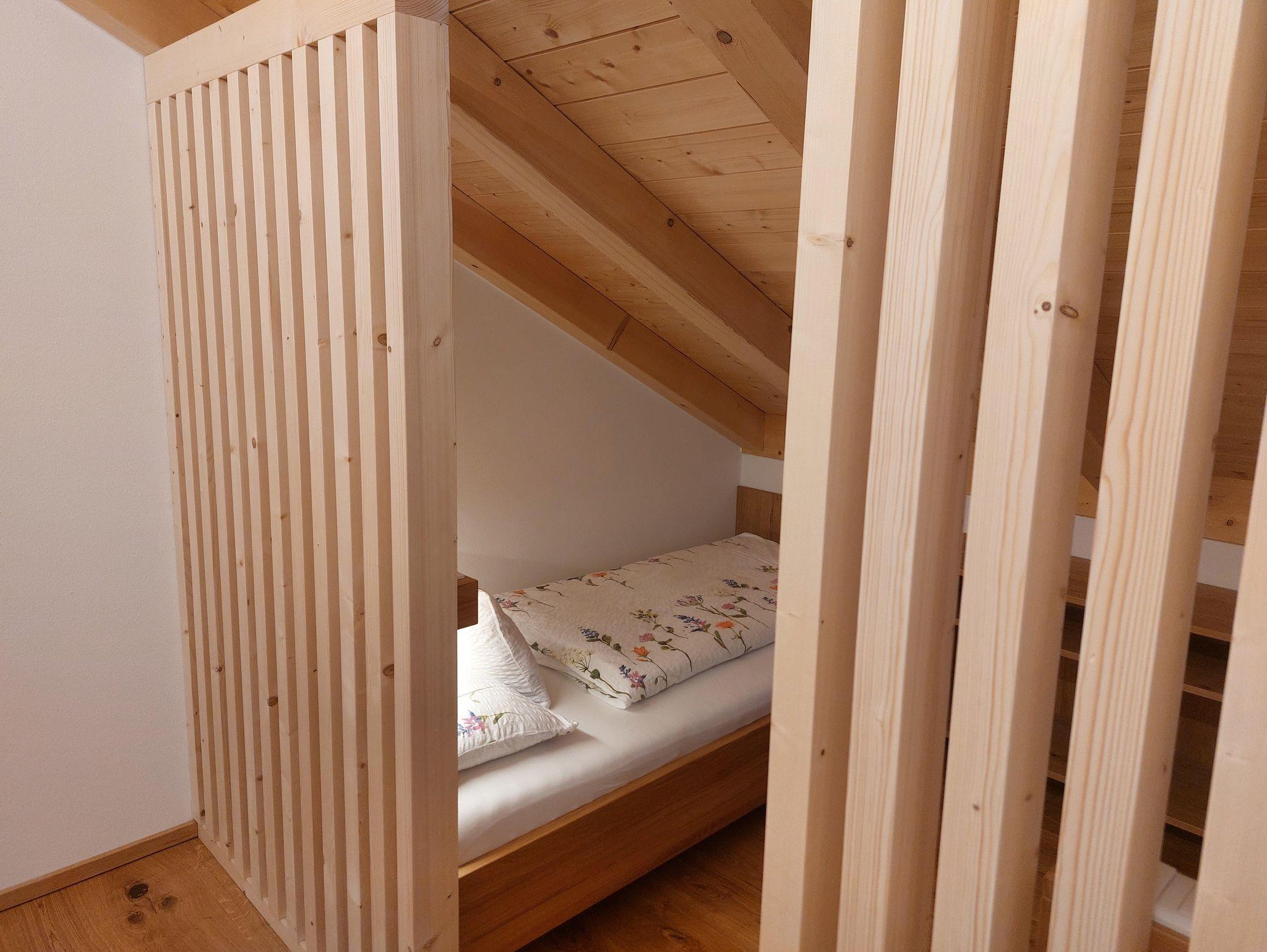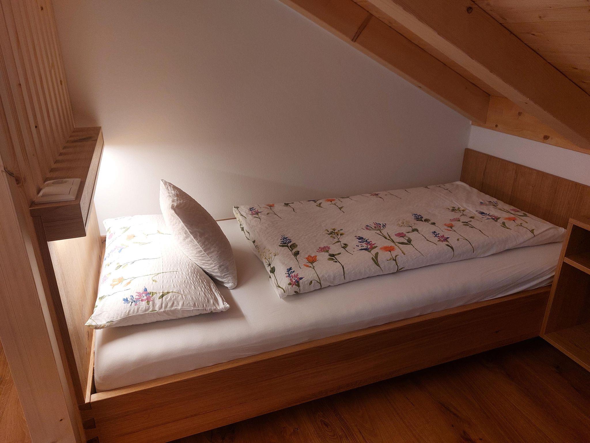 • Familienschlafzimmer mit rustikalen Betten in naturbelassener Eiche (getrennte Matratzen und Fußende offen 180 x 200) & zwei Einzelbetten (90x200)