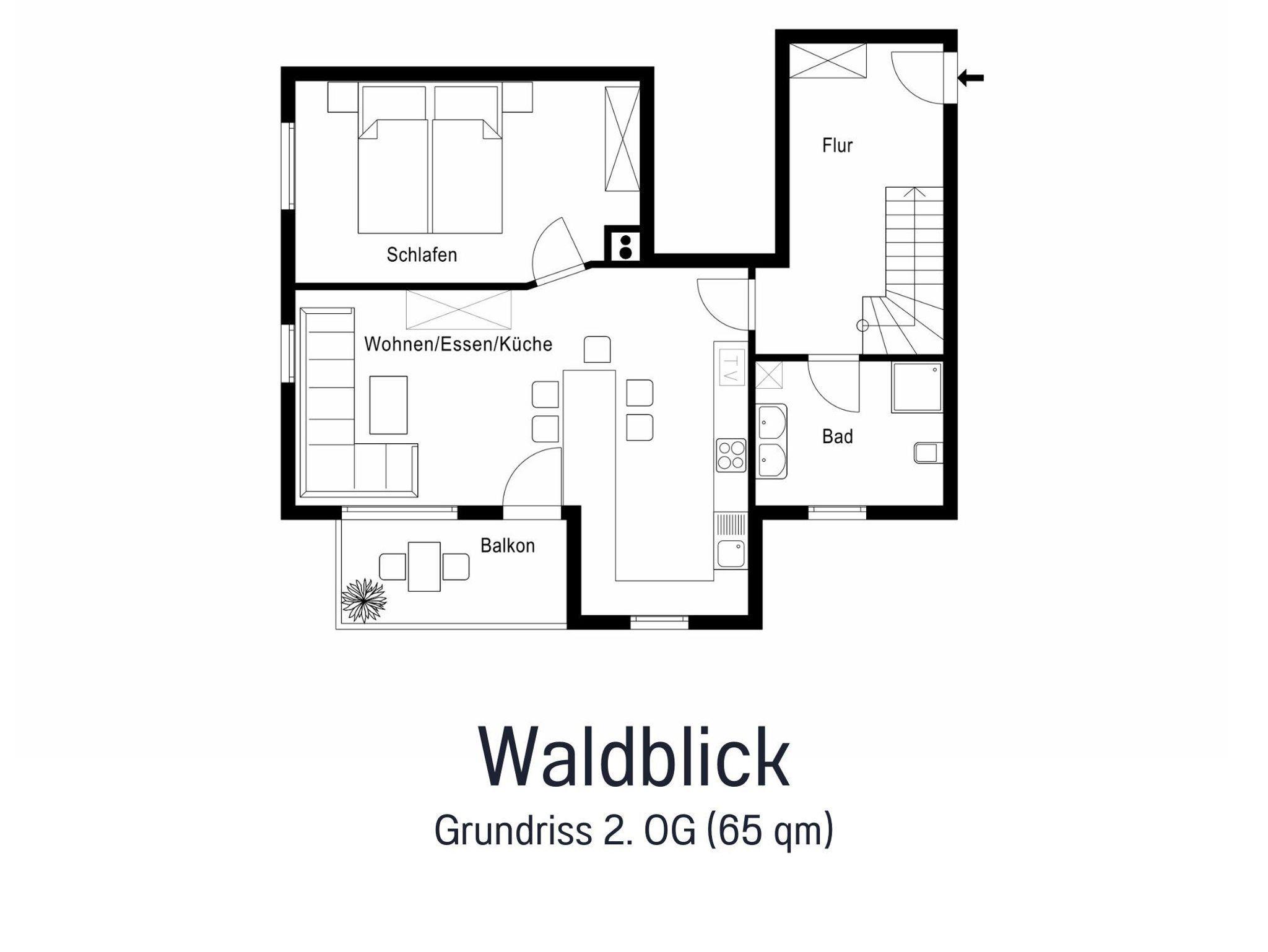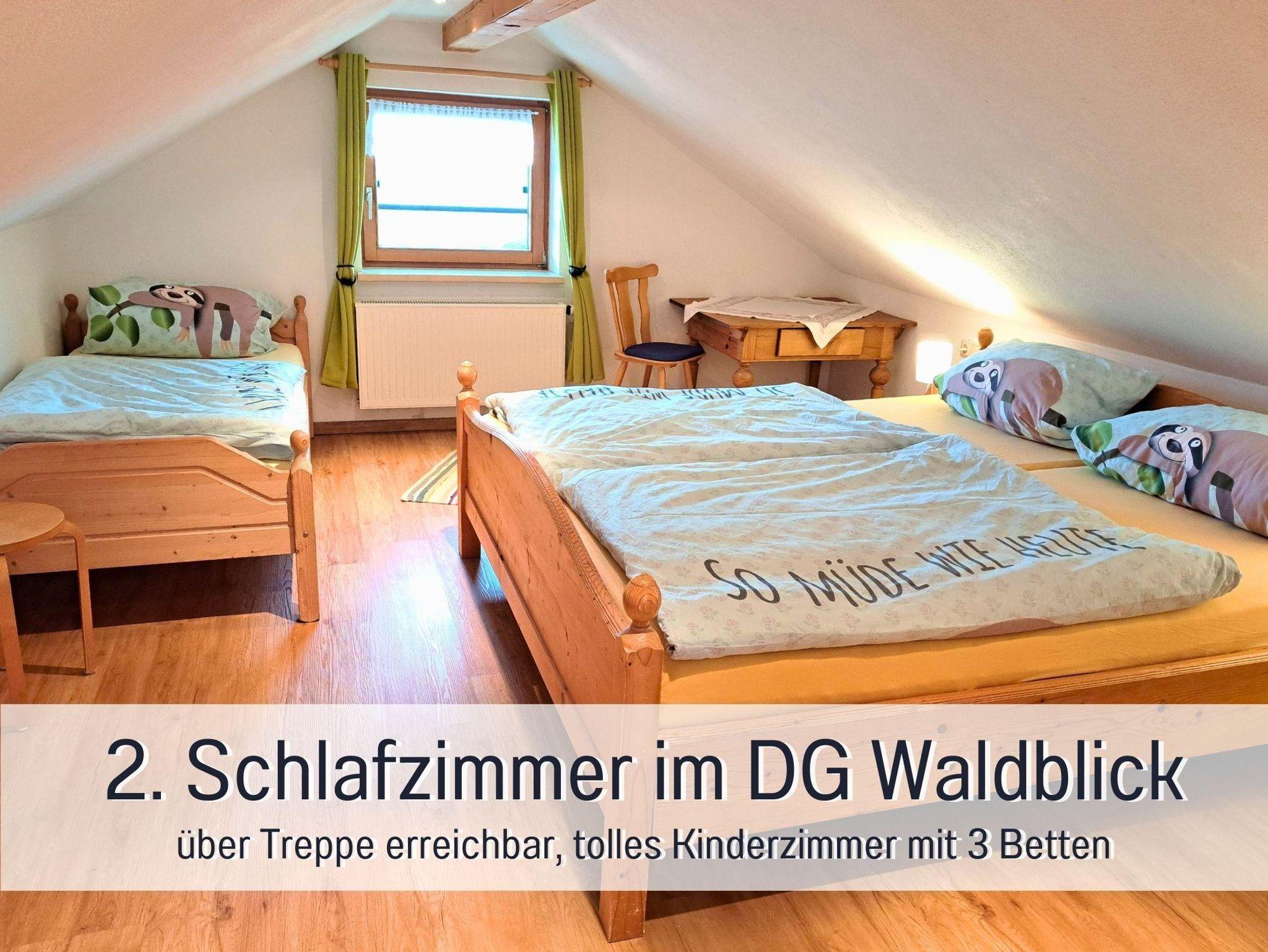Unsere Ferienwohnung Waldblick ist 65?m² groß und bietet komfortabel Platz für zwei bis fünf Personen. Ideal für Familien mit Kindern oder für Gäste, die etwas mehr Raum schätzen. Die Wohnung verfügt über zwei separate Schlafzimmer. Eines der Schlafzimmer liegt im gemütlichen Dachgeschoss und ist über eine innenliegende Treppe innerhalb der Wohnung erreichbar – ein echtes Highlight, besonders für Kinder.