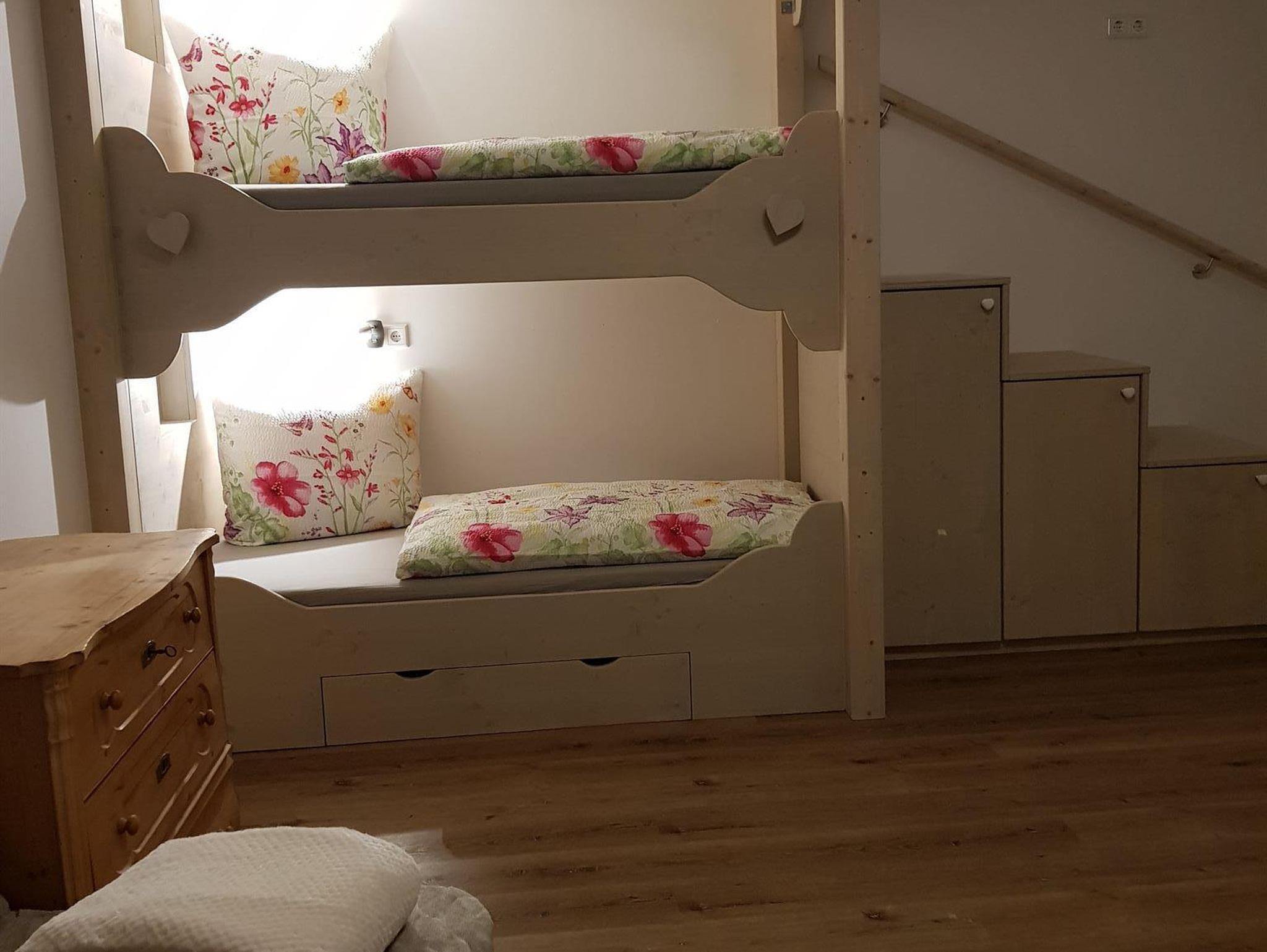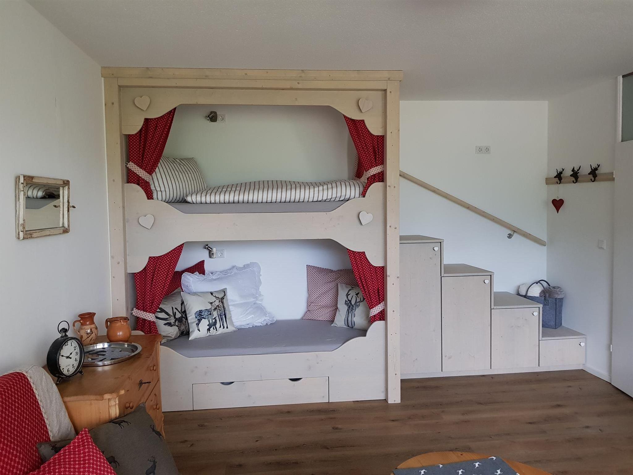 Das Panorama-Apartment Annette hat neben dem grandiosen Ausblick seine eigene besondere Seele. Neben den vielen liebevollen Details, erwartet Sie im Wohnzimmer ein stilvolles Alkovenbett in moderner bayrischer Aufmachung. Diese individuelle, detailverliebte Anfertigung meines „pfälzischen“ Kreativ-Teams (Michaela Wetzelt-Schreinerin und Anita Kottmann-Architektin) bildet ein besonderes Highlight. In den Stufen befinden sich Kleiderschränke. Mit den Vorhängen können Sie Ihre Alkove blickdicht verdunkeln oder lassen Sie sich einfach von der Morgensonne wecken und genießen Sie den beeindruckenden Bergblick.