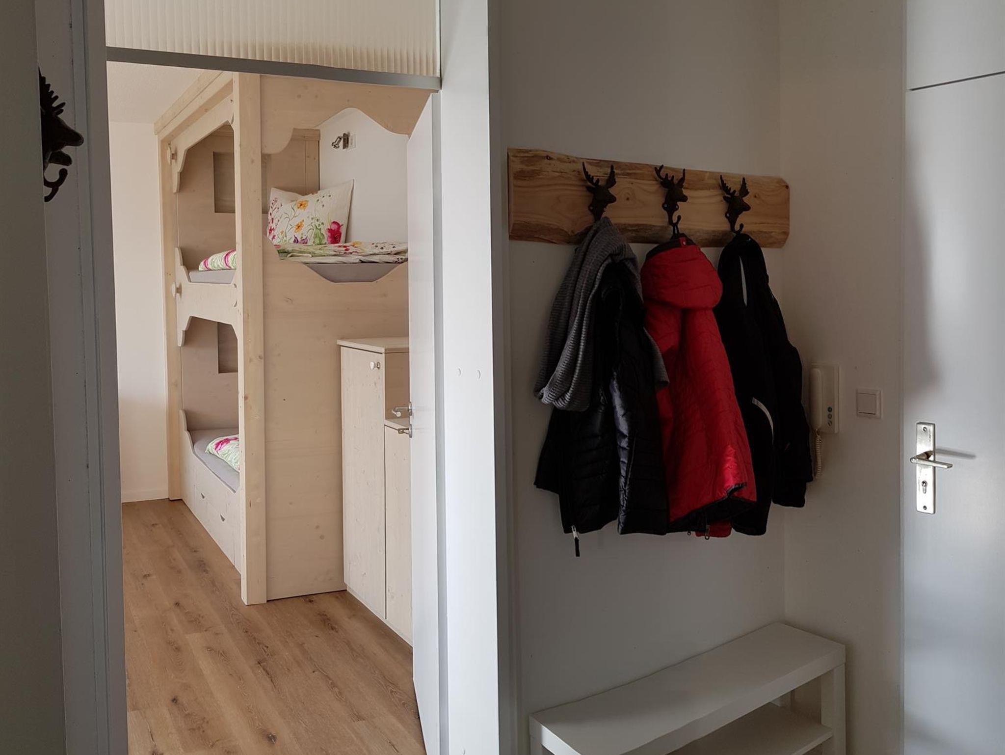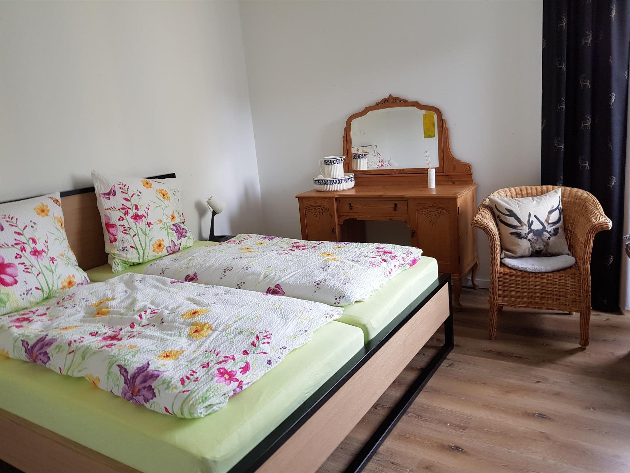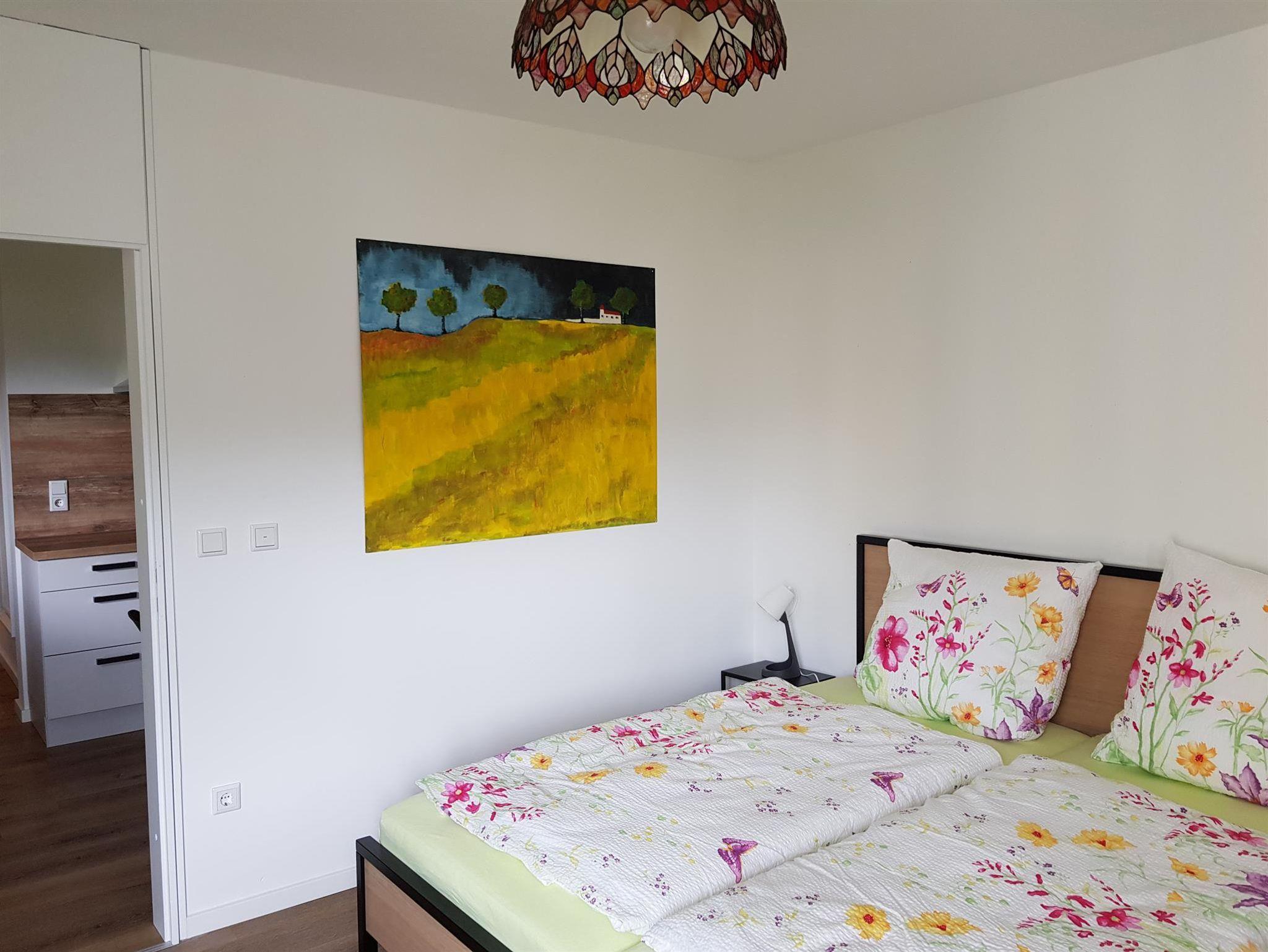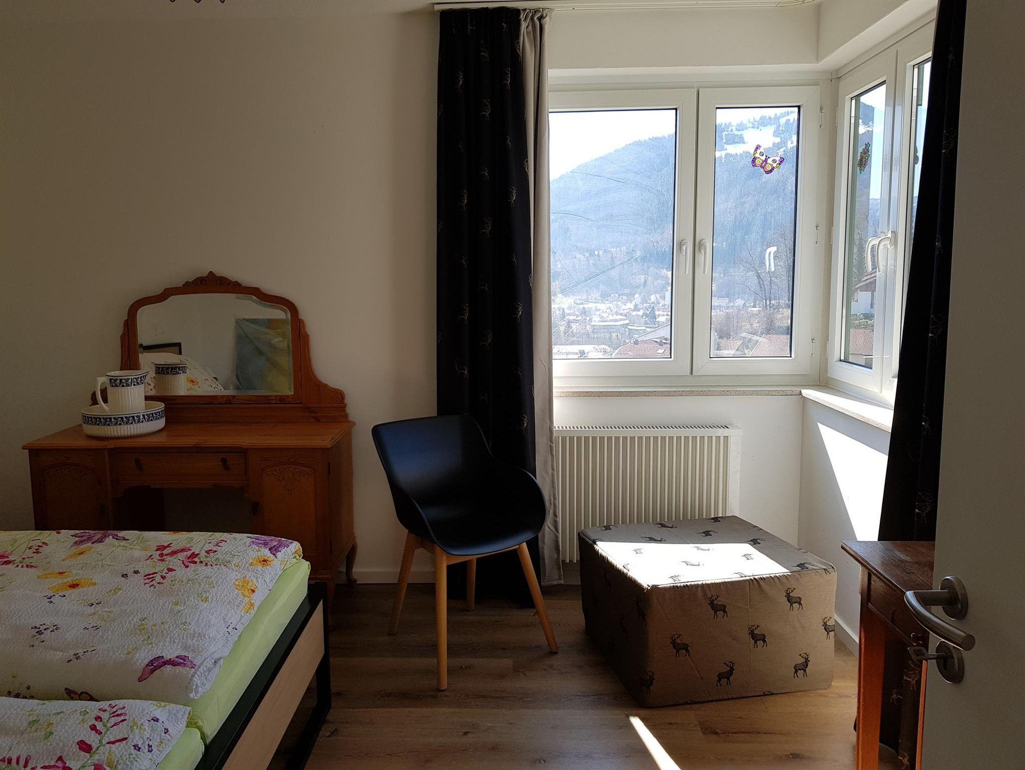 Schlafzimmer mit Doppelbett 1.80/2.00 m ohne Fußbegrenzung. Damit auch große Menschen bequem darin schlafen können. Verdunklungsvorhänge, gegen die eindringende Morgensonne, sind vorhanden (keine Rollläden). Oder lassen Sie sich von den Sonnenstrahlen wecken und genießen Sie direkt das wunderschöne Bergpanorama.