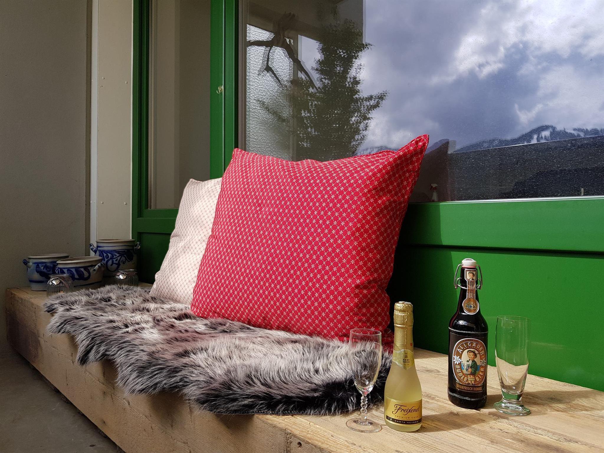 Das Apartment besitzt eine 6 qm Loggia in Südlage mit direktem Blick auf das mächtige Bergpanorama der Alpen. Von hieraus können Sie die Paragleiter beobachten, die vom „Mittag“ (Hausberg von Immenstadt) starten. Von Weitem hört man auch das Läuten der Kuhglocken auf der benachbarten Wiese.