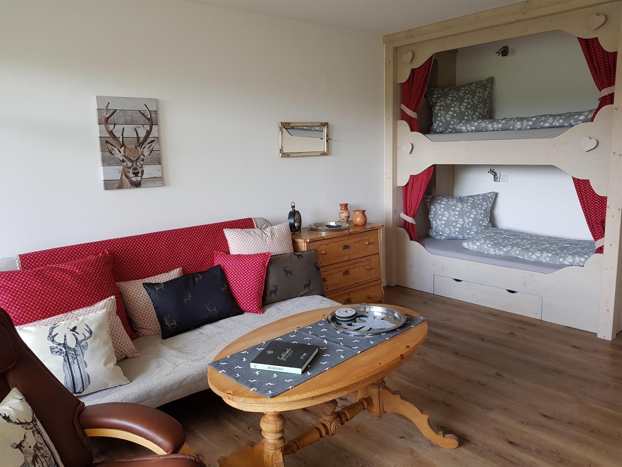 Das Wohnzimmer bietet neben den zwei Alkovenbetten noch eine ausziehbare Couch. Insgesamt haben bis zu 6 Personen die Möglichkeit hier zu übernachten. Das Panorama-Apartment Annette fällt wohl etwas aus dem Rahmen der klassischen Ferienwohnungen, aber genau dies war unser Ziel und wir haben es hervorragend umgesetzt. Das Apartment ist nun ein Schmuckkästchen über den Dächern von Immenstadt!