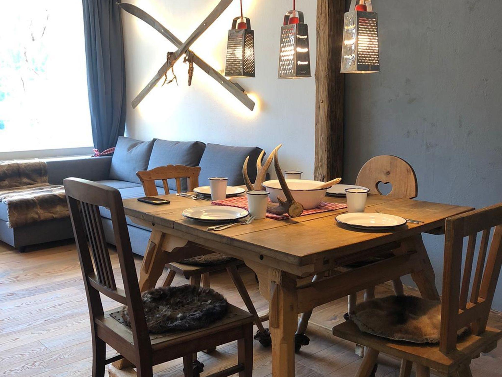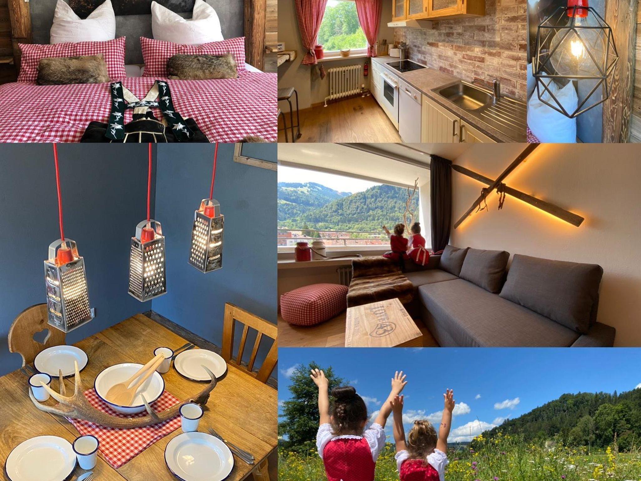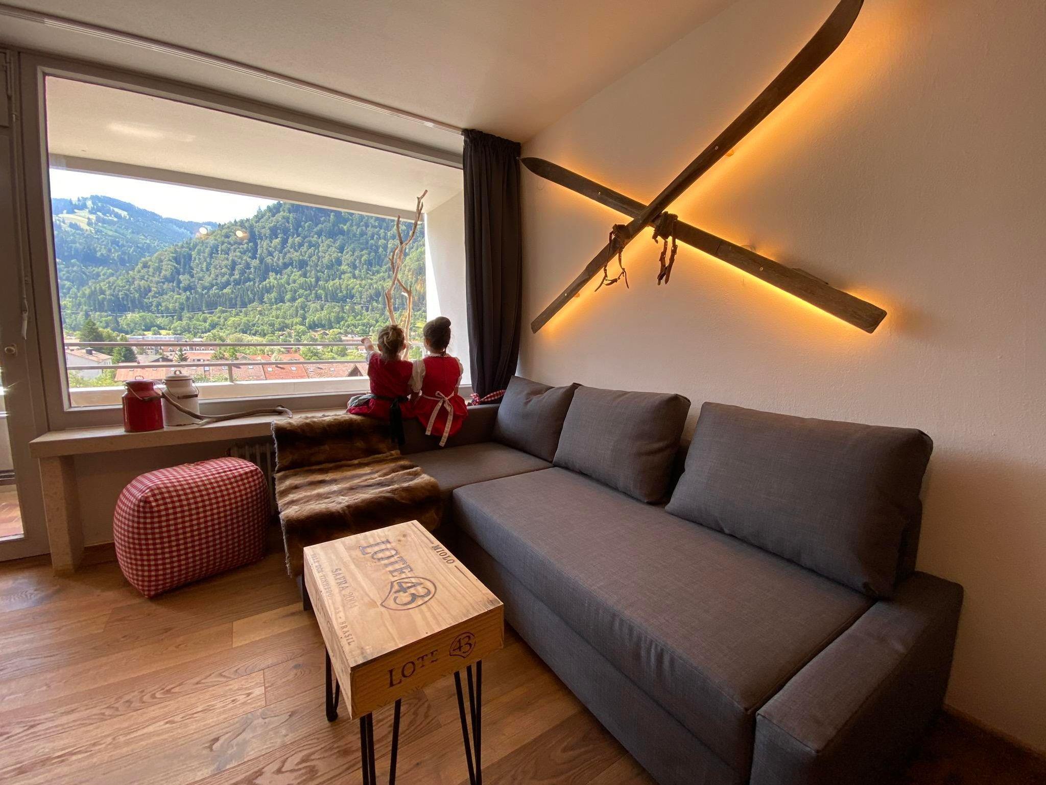 Der Wohnbereich ist mit einem 200 Jahre alten Jogltisch und antiken Stühlen ausgestattet, um unter einer originellen Hängelampe das Abendessen zu genießen. Auf der Couch, die auch als Schlafcouch (200x140) umfunktioniert werden kann, könnt ihr durch das große Panoramafenster die Hausberge Mittag und Immenstädter Horn betrachten, oder aber auf dem 50 Zoll TV den Abend mit einer Netflix Serie und einem Glas Rotwein beenden.