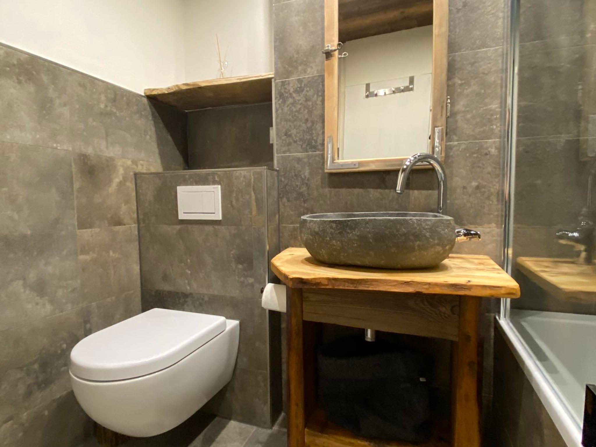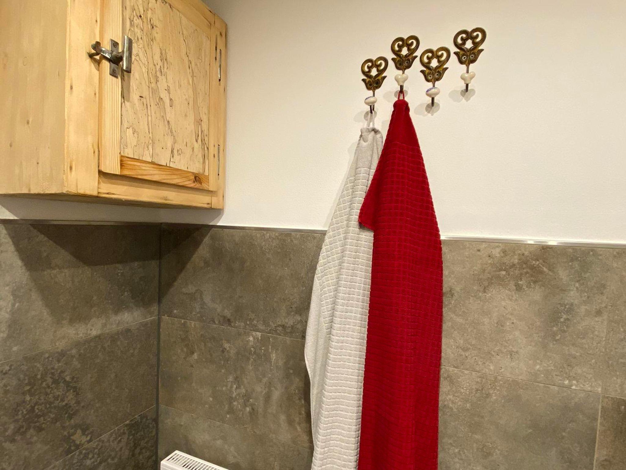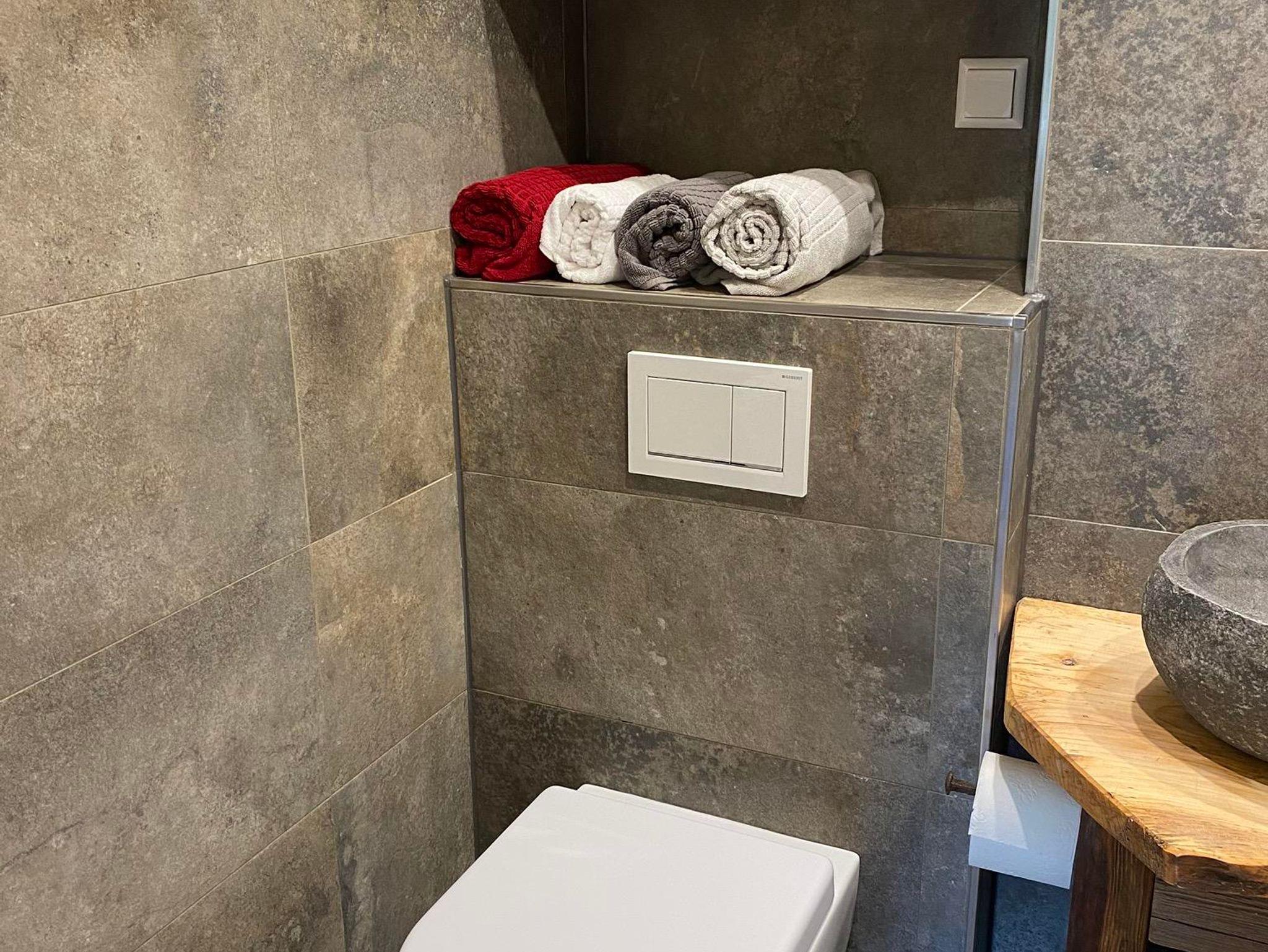 Nach einem sportlichen Tag könnt Ihr im neu renovierten und hellen Bad in der Badewanne mit Blick auf die Altholzdecke entspannen. Ein großer Spiegel, Haartrockner und für jeden Gast Hand- & Duschtuch runden das Bild ab.