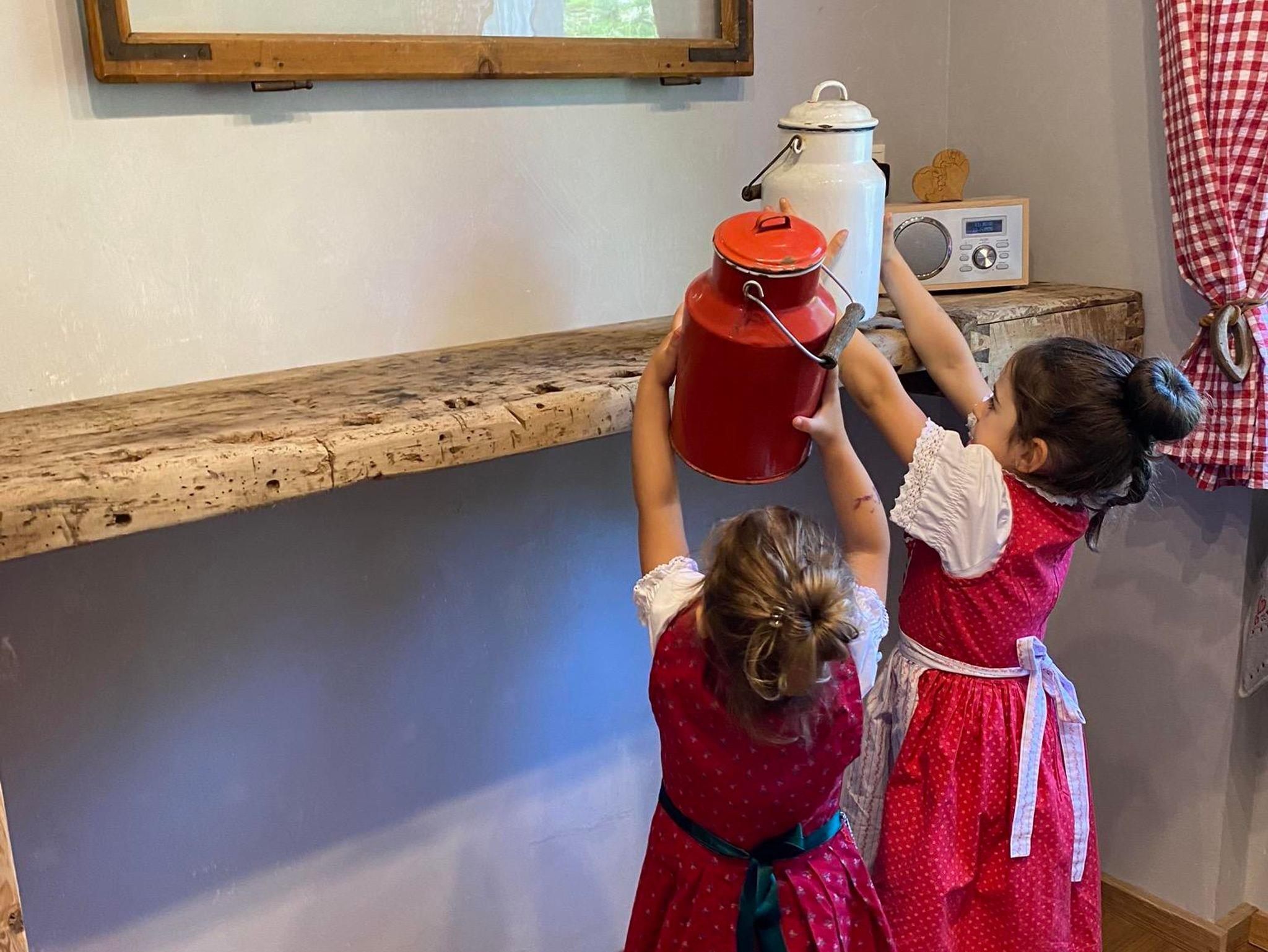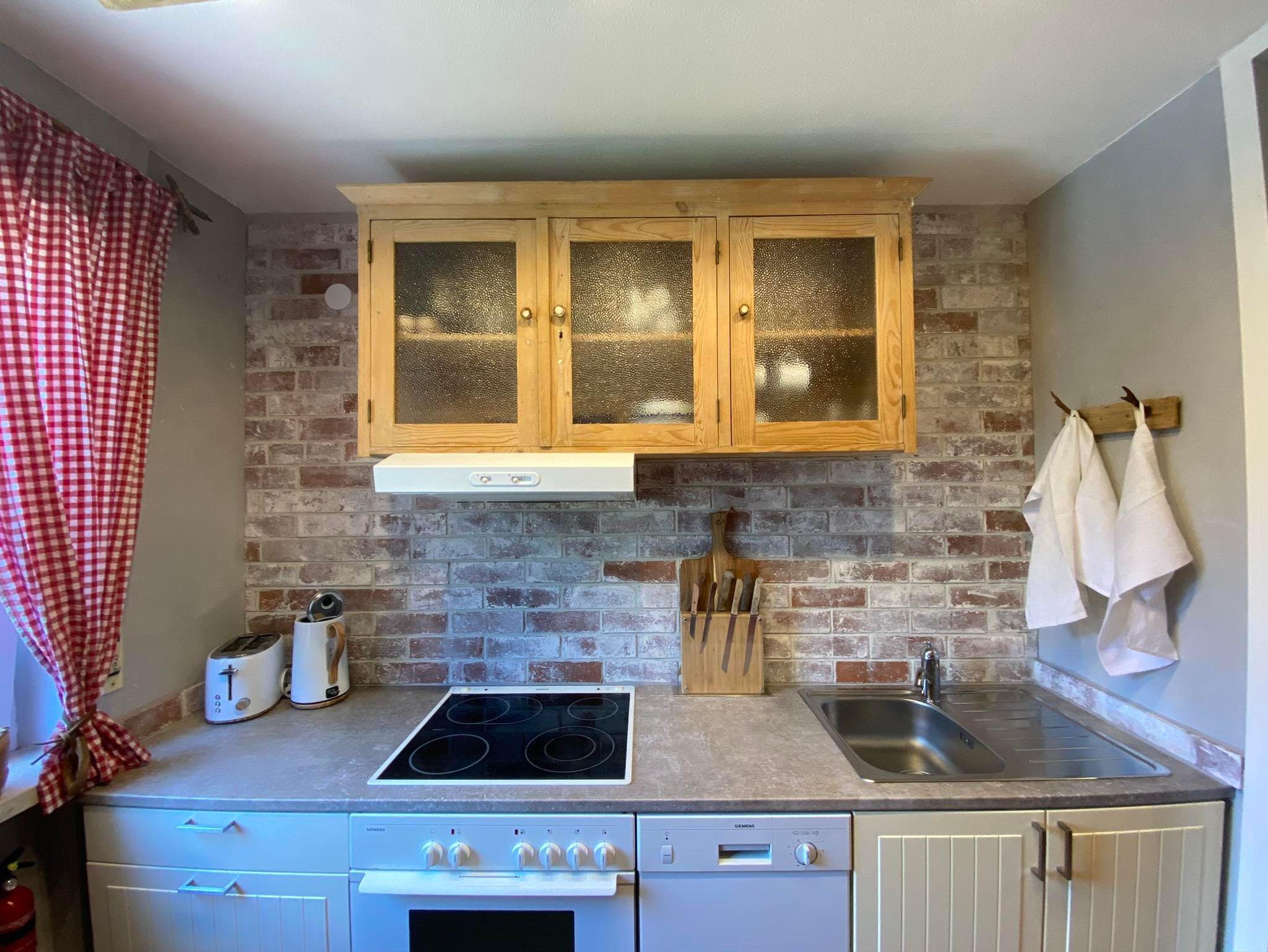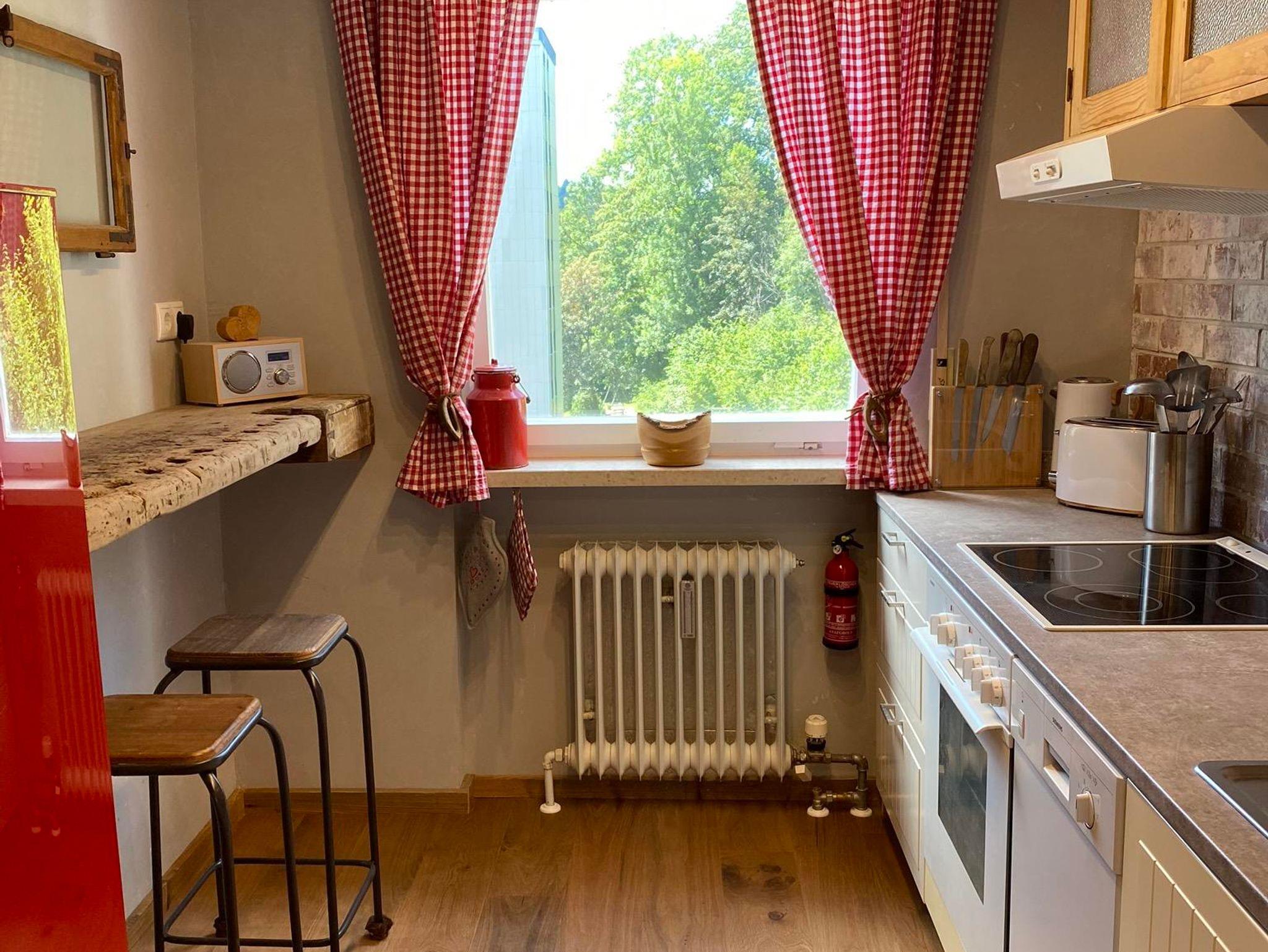 Die vollausgestattete Küche mit Herd, Backofen, Geschirrspüler, Kühl-Gefrierkombi, Kaffeemaschine, Toaster und zum Ambiente passendem Emaille-Geschirr lädt euch zu gemütlichen Kochabenden ein. Die Theke bietet Platz zum gemeinsamen Kochen oder einer bayerischen Brotzeit. Spülmaschinenpulver ist vorhanden, ein Müllschlucker auf der gleichen Etage 5 Meter entfernt.