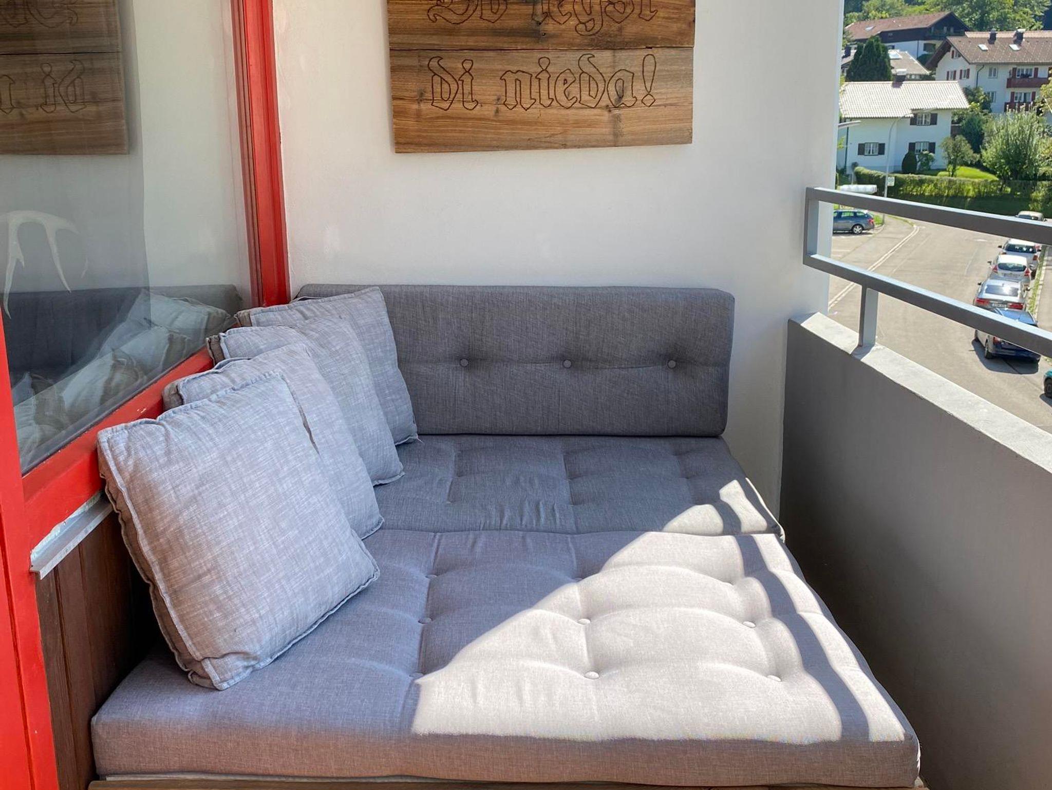 Auf dem ganztägig sonnigen Balkon erwartet euch eine gemütliche Lounge mit Blick in die Berge, hier hört man die Grillen zirpen, die Vögel zwitschern oder die Glocken der Kühe, die auf der Stadtalpe den Sommer verbringen.