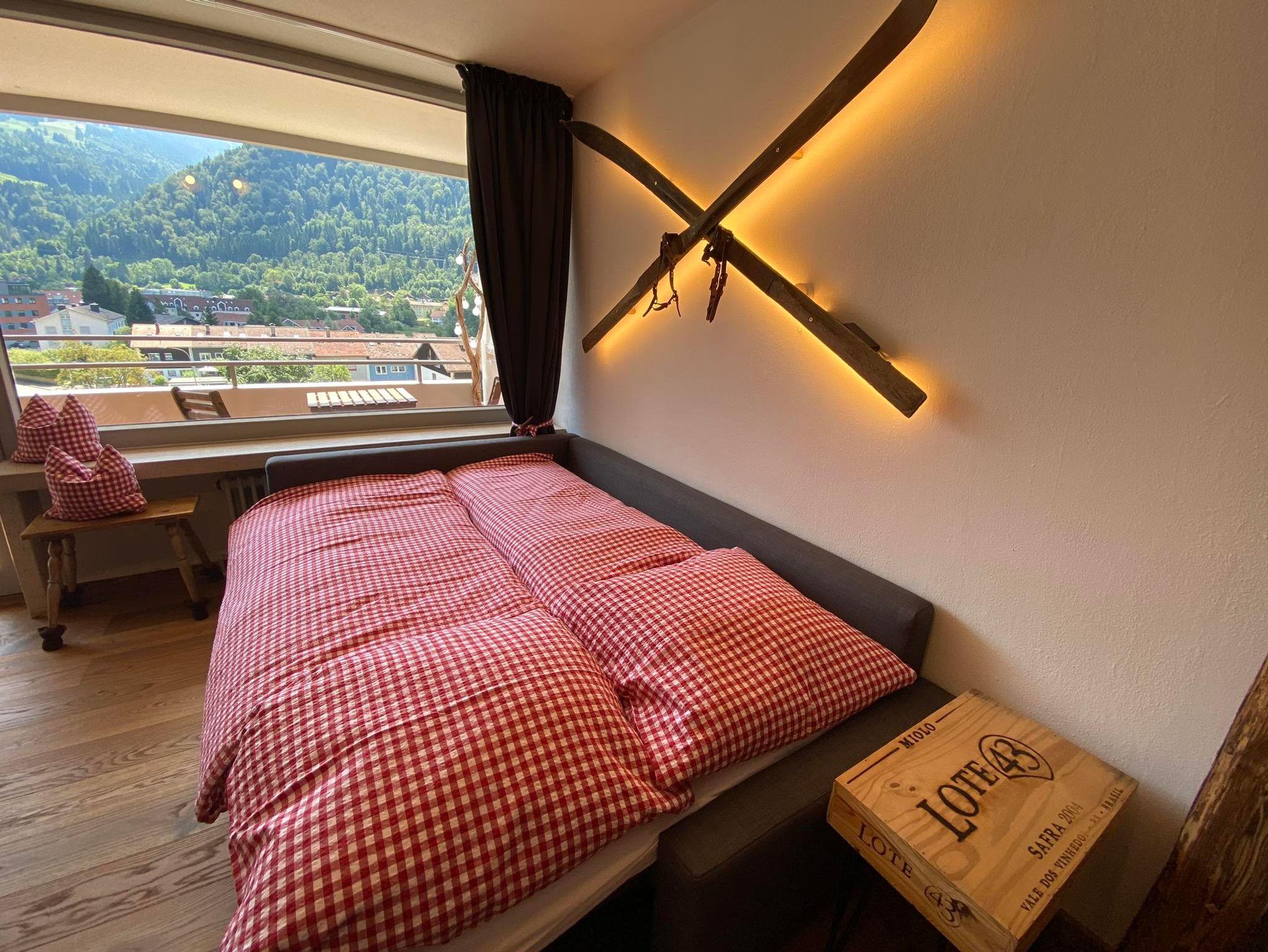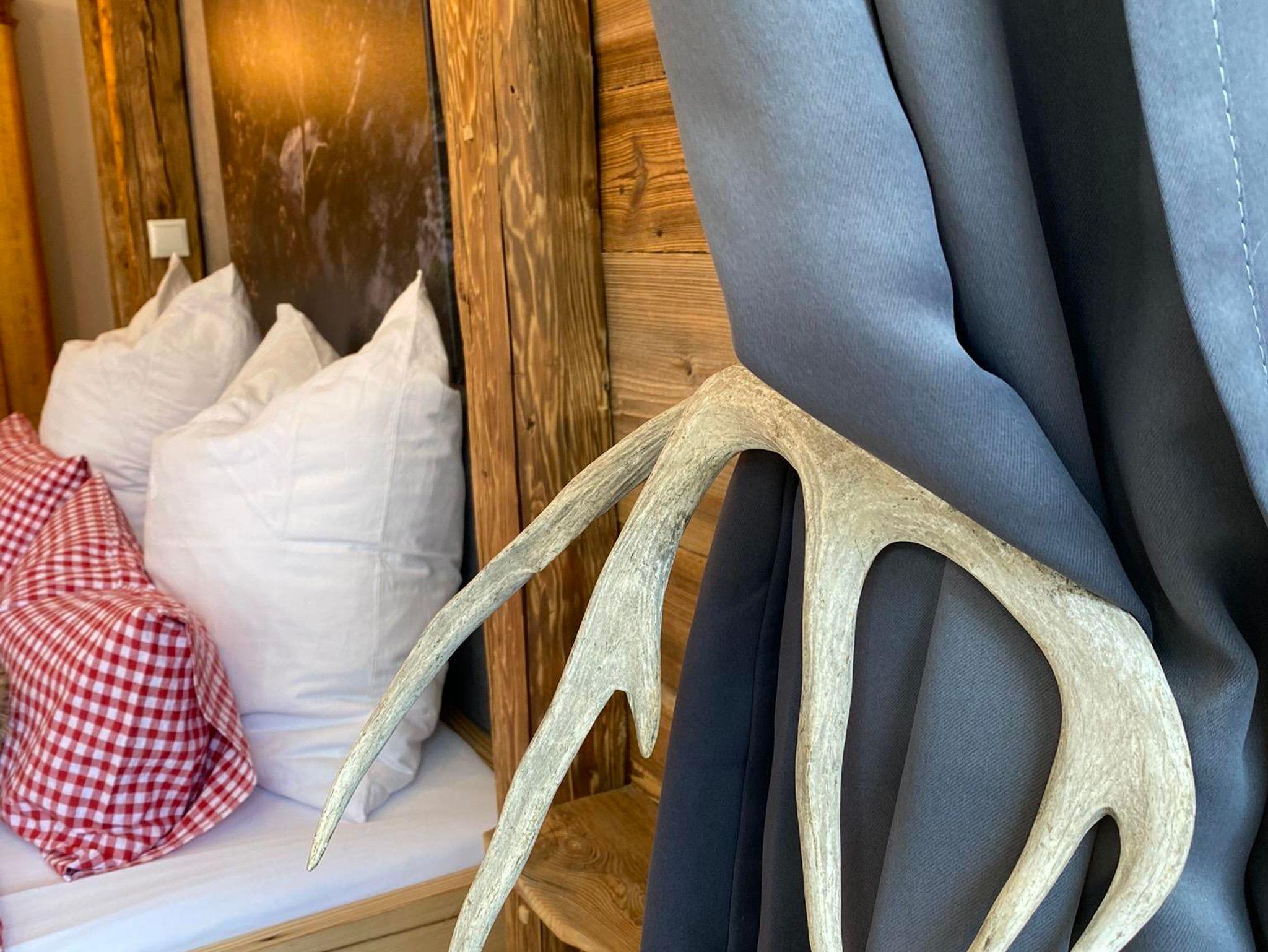 Im Schlafzimmer erwarten euch warmes Licht, ein aus Altholz gezimmertes großes Bett (200x180) mit getrennt verstellbaren Lattenrosten, beste Matratzen sowie übergroße Bettdecken (220x155) mit Bezügen, die zum Träumen und Kuscheln einladen. Am Morgen erwacht ihr mit einem tollen Blick durch das große Fenster auf das Immenstädter Horn, mal von der Sonne angeschienen, mal im Frühnebel versteckt.