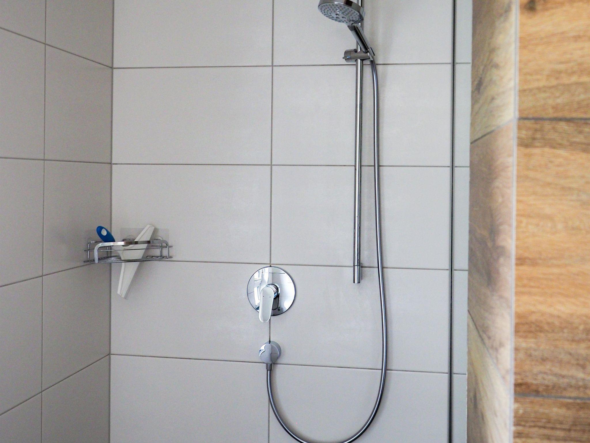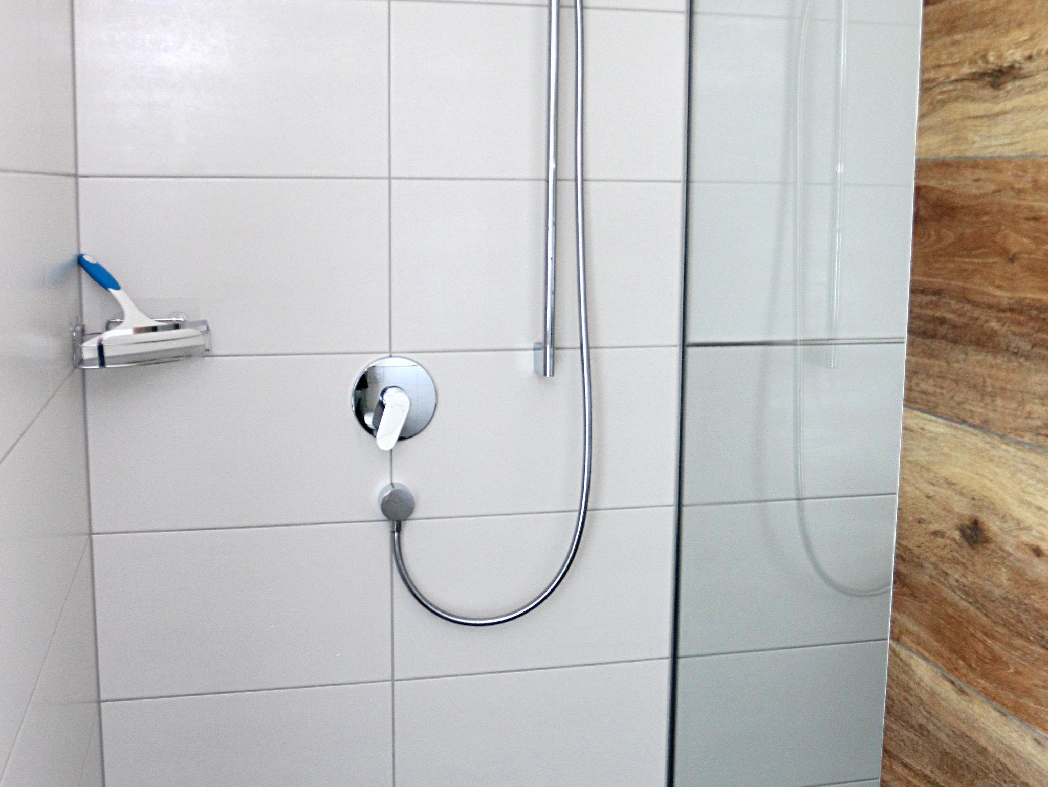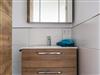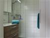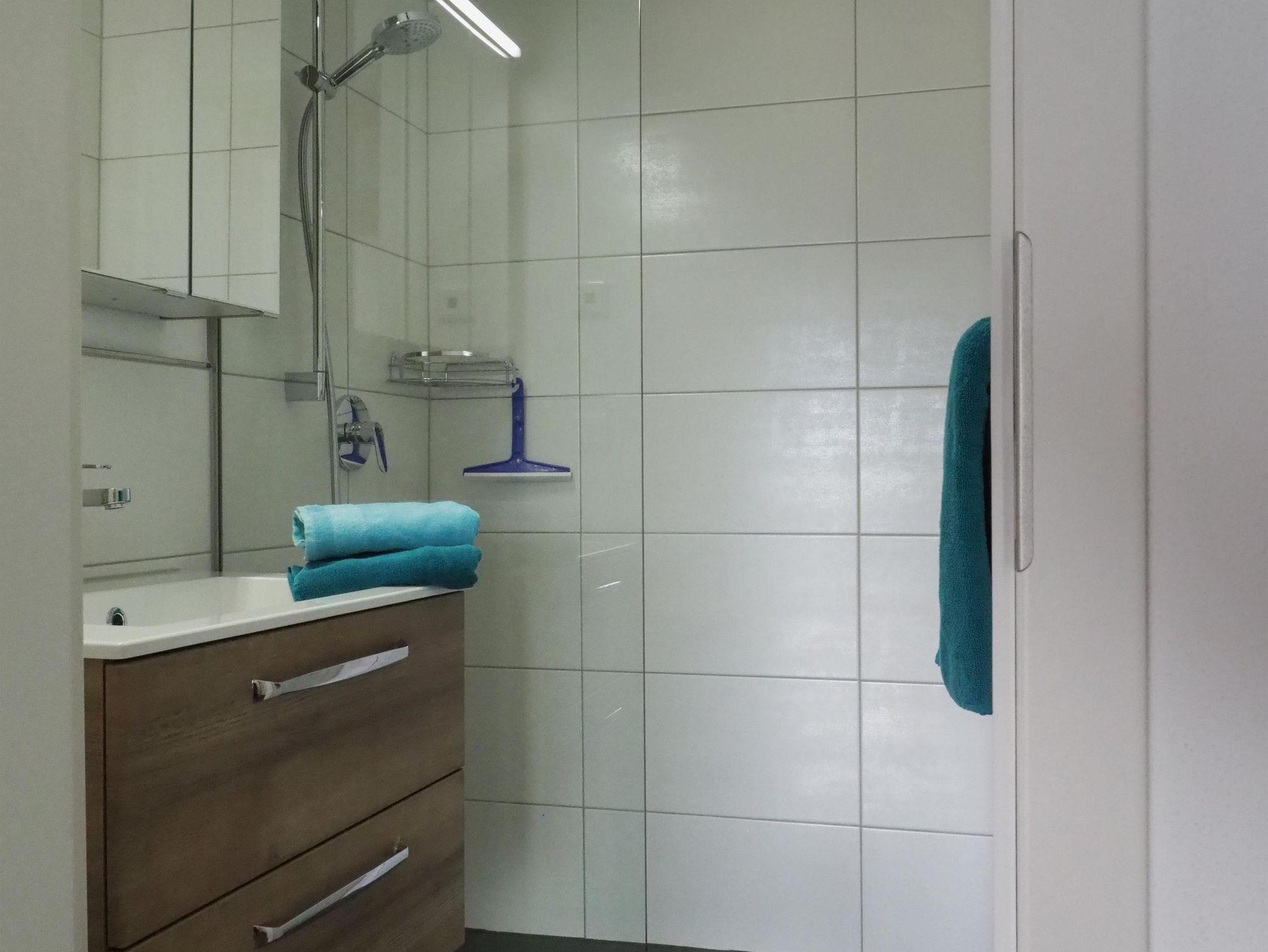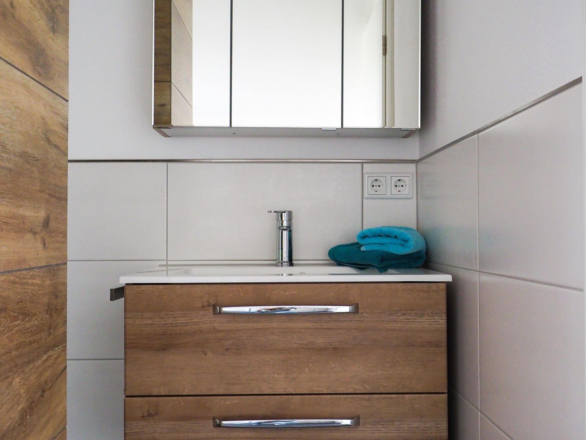 Das Bad ist mit einer begehbaren Dusche, Einbauwaschbecken mit Spiegelschrank und WC ausgestattet.