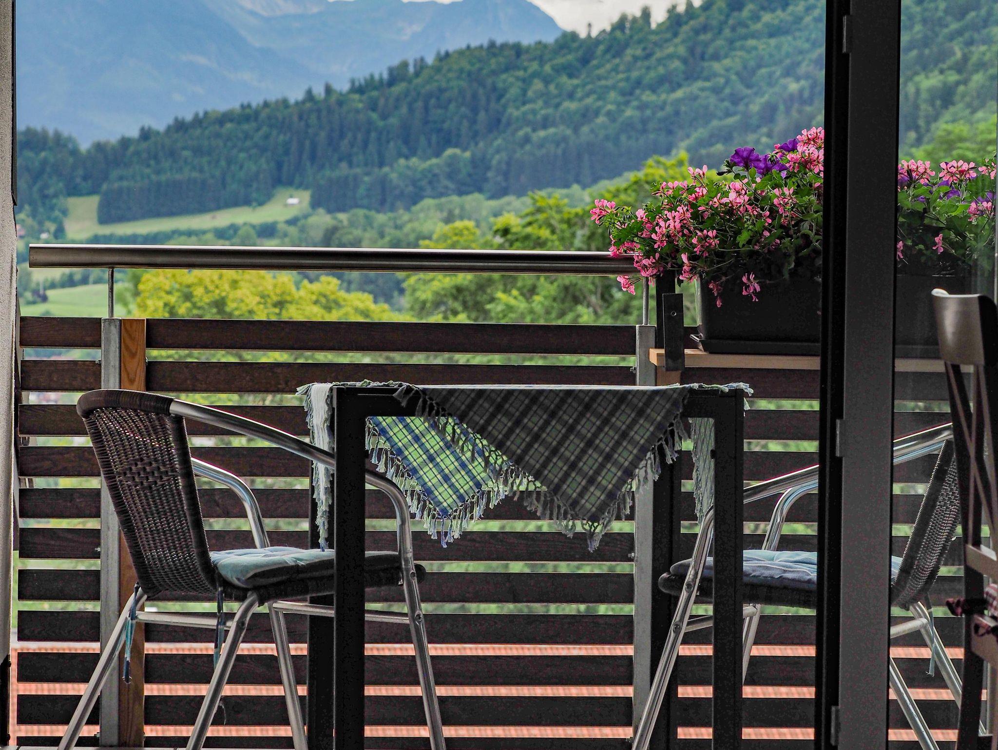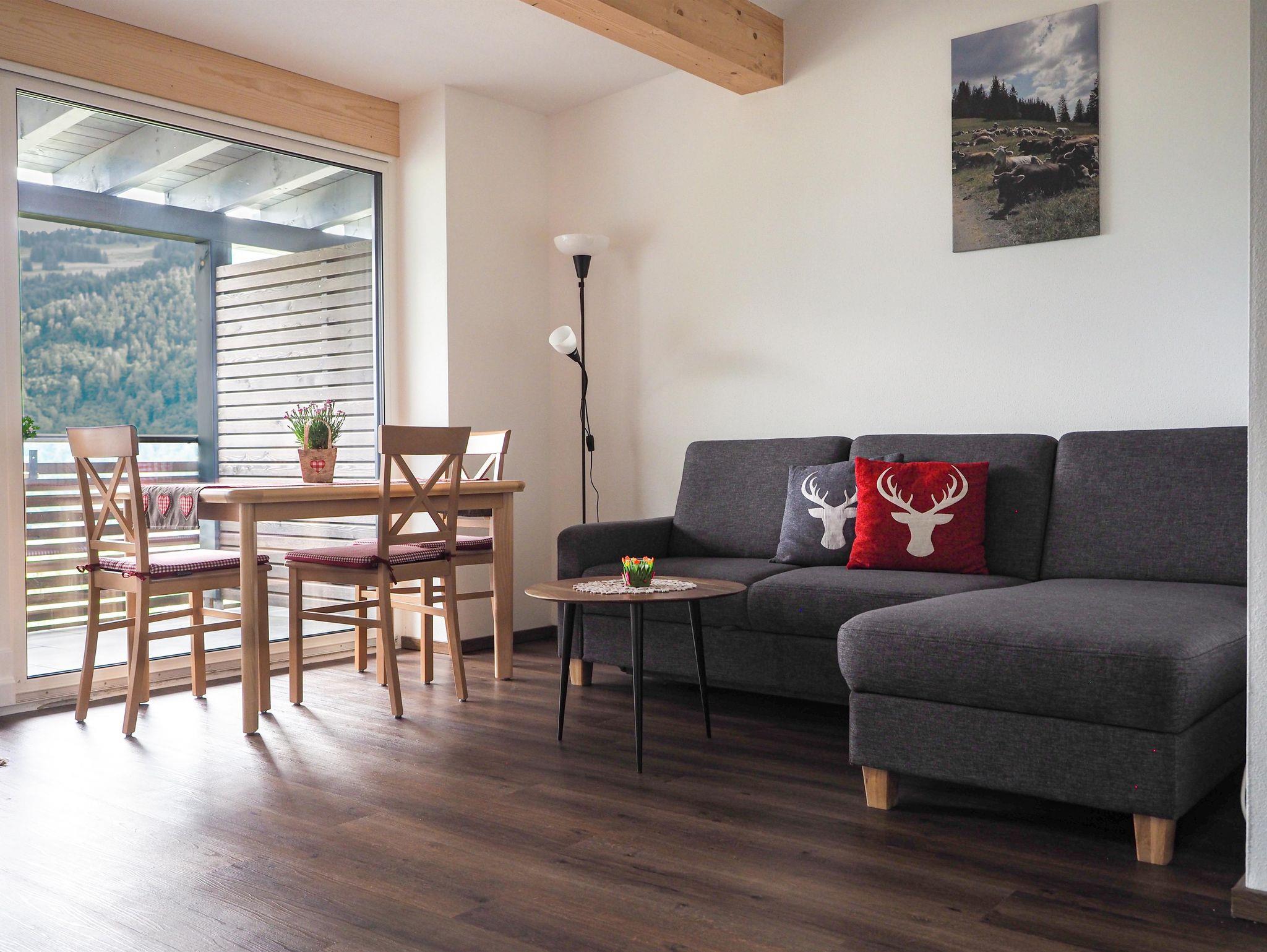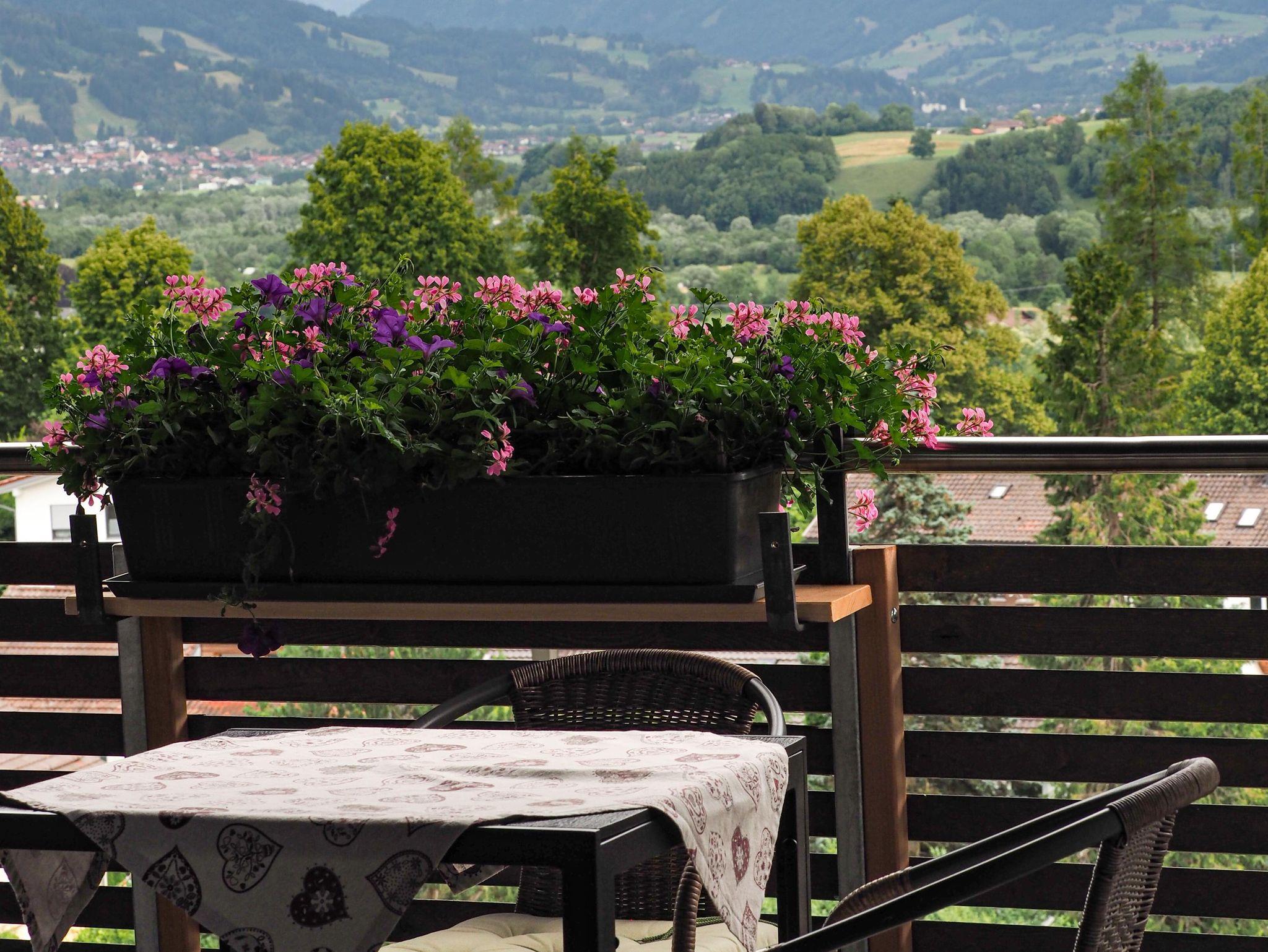 Vom Wohnzimmer gelangen Sie auf unsern Panorama Balkon, hier genießen Sie die großartige Aussicht über die Oberallgäuer Berge.