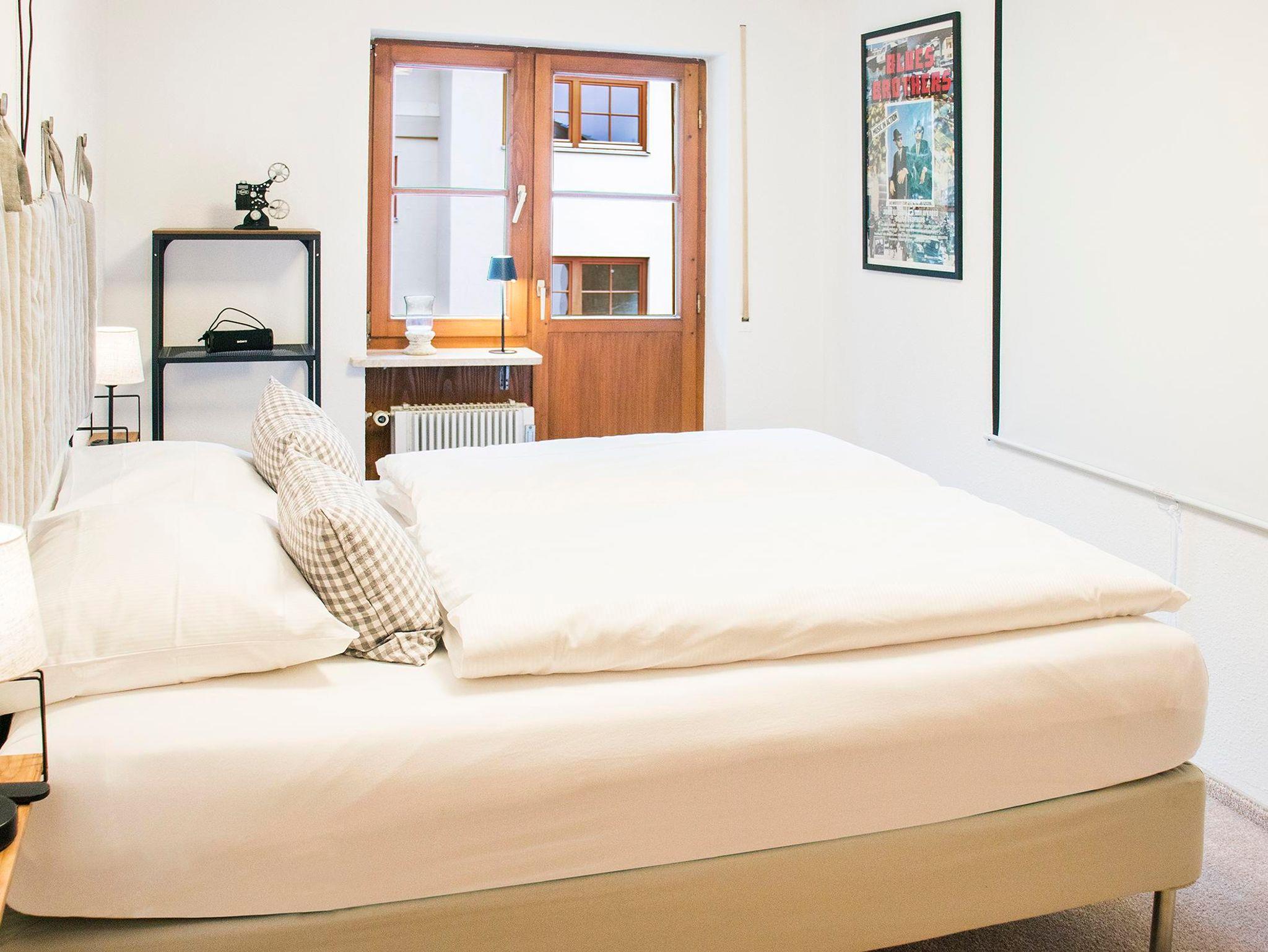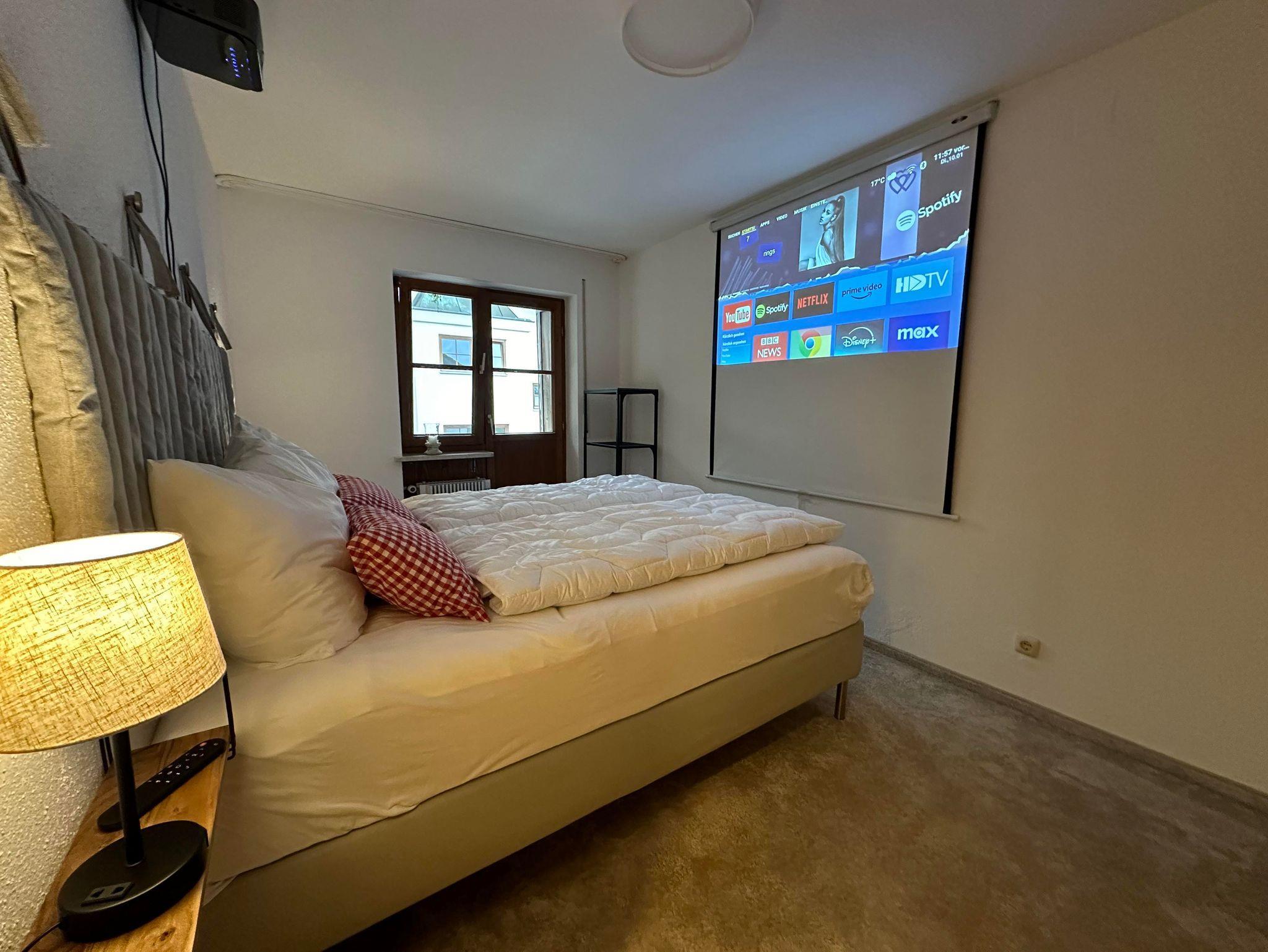 Ein besonderes Highlight ist das Kino-Feeling: Mit Beamer, Leinwand und frischem Popcorn genießen Sie Filme direkt vom Bett aus. Die Wohnung verfügt über ein Schalfzimmer mit Doppelbett, ein helles Wohnzimmer mit bei Bedarf zu einem Bett umbaubaren Sofa, eine voll ausgestattete Küche, Bad und WC getrennt, und kostenloses WLAN.
