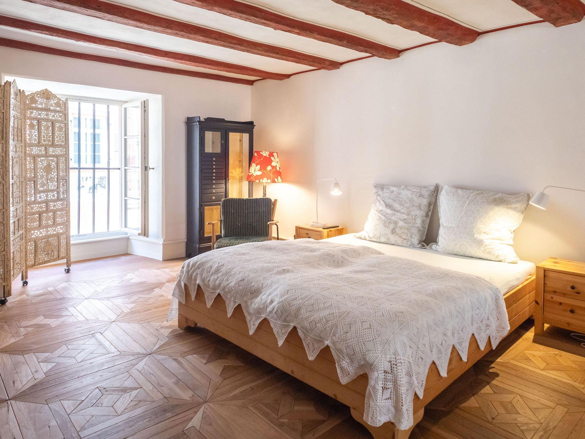 Ihr geräumiges Schlafzimmer ( twin oder Double) erreichen Sie über einige ( innenliegende) Stufen, da es sich im ältesten Teil des Hauses, einem Fachwerkbau befindet.