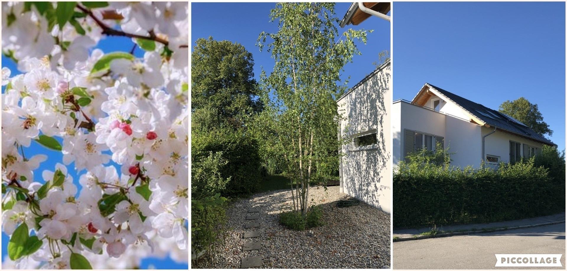Seenahe Gartenwohnung mit großer Indoor Tischtennisplatte inmitten eines Naturparadieses mit Obstbäumen und Wildrosen .