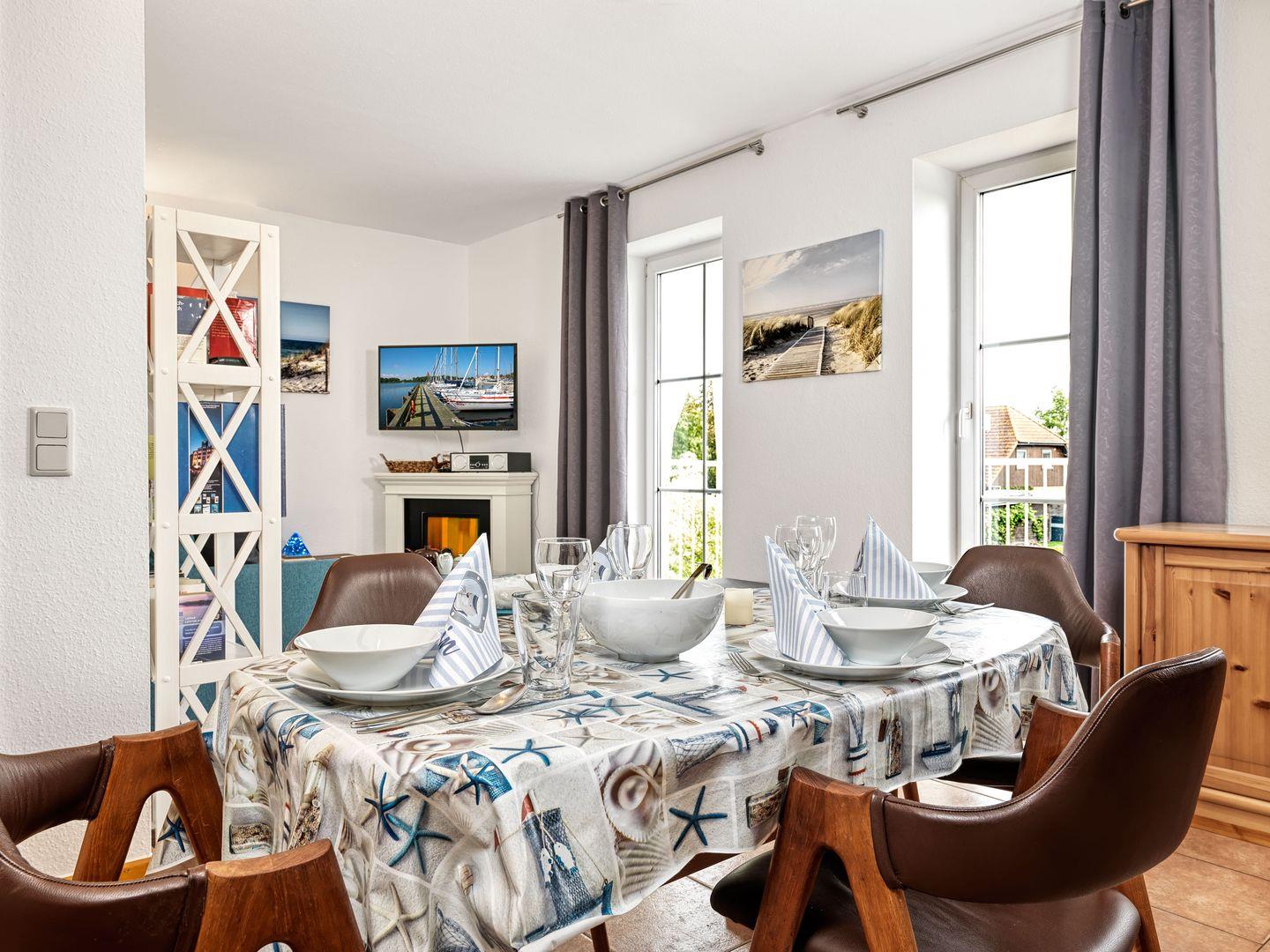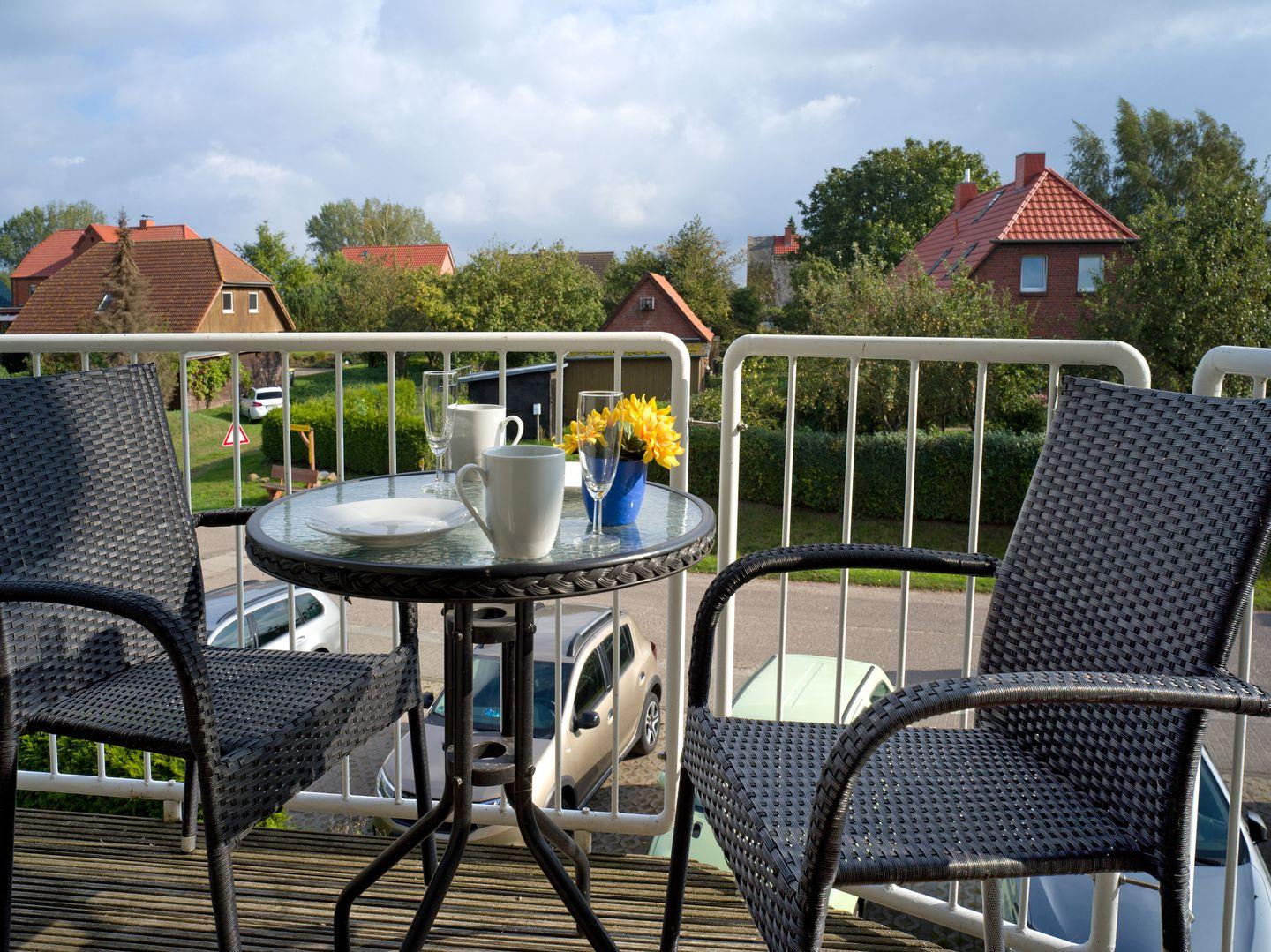 Vom Wohnbereich gelangt man auf den schönen Ost-Balkon mit Tisch, Stühlen und Blick zum Haff. Hier können Sie gemütlich frühstücken und die Morgensonne genießen.
