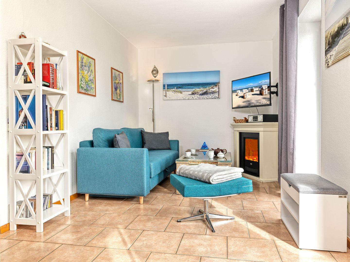 Der gemütliche Wohnzimmerbereich ist mit einer Sitz- und Schlafkombination (neues Bruno Boxspring-3-Sitzer-Sofa von 2022, ausklappbar zum 160 x 200 cm großen Doppelbett), Flachbildschirm-TV und Radio mit USB-/CD-Player ausgestattet. Der Couchtisch ist eine Sonderanfertigung der Naturwerkstatt EigenArt und wie die Uhr und die Pyramidenlampe ein echter Hingucker; alle drei spielen mit dem Namen der Wohnung, „StrandGut“.