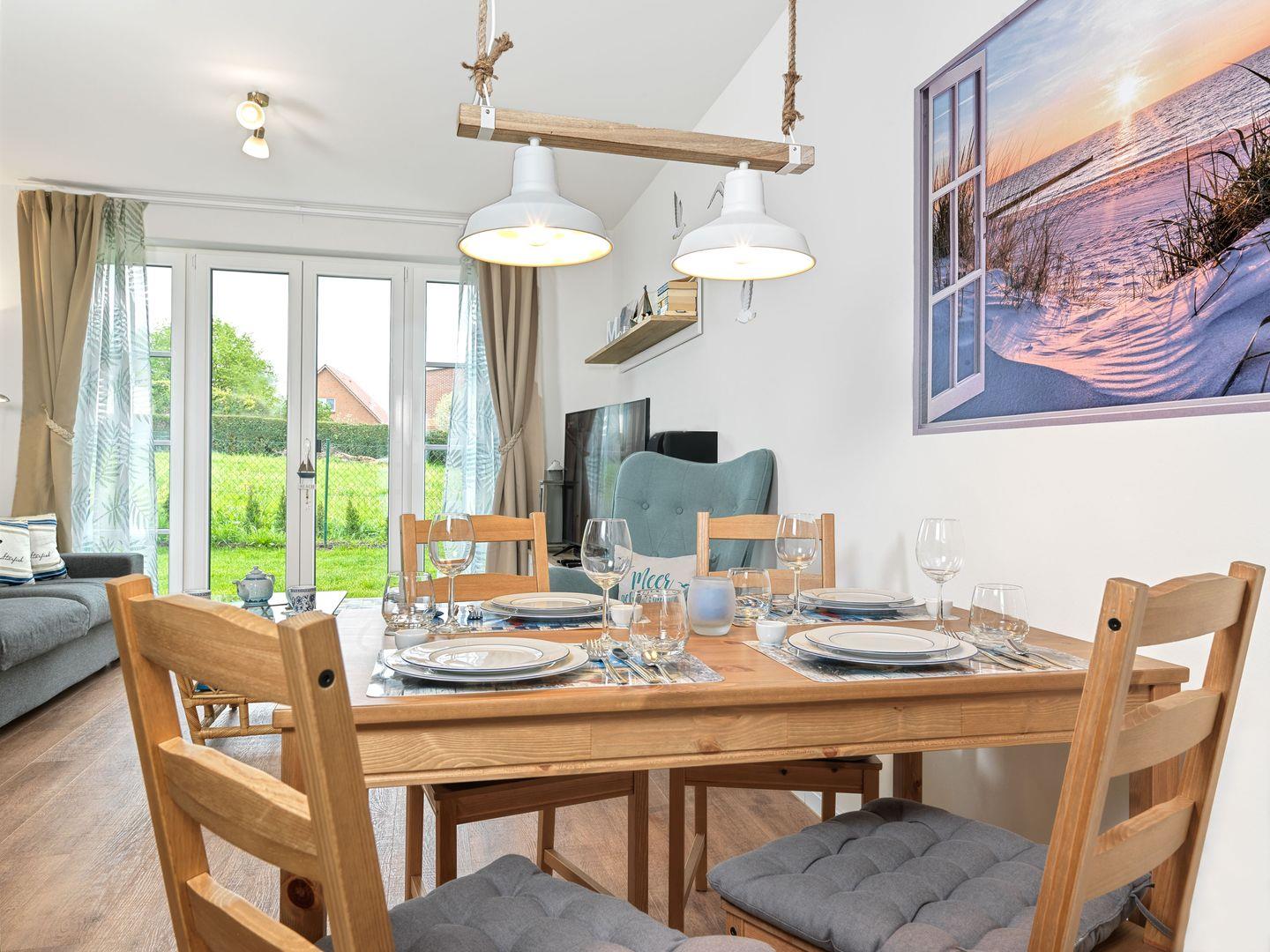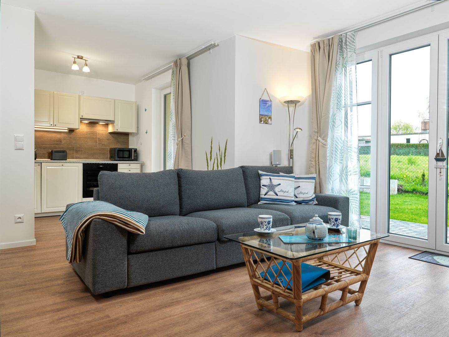 Das helle, freundliche Wohnzimmer mit offener Küche, Ess- und Wohnbereich verfügt über eine Schlafcouch für 2 Personen, sowie TV / Blu-ray / DVD / Radio mitsamt Surround-Anlage. Für einen gemütlichen Abend sind zudem Bücher und Gesellschaftsspiele vorhanden.