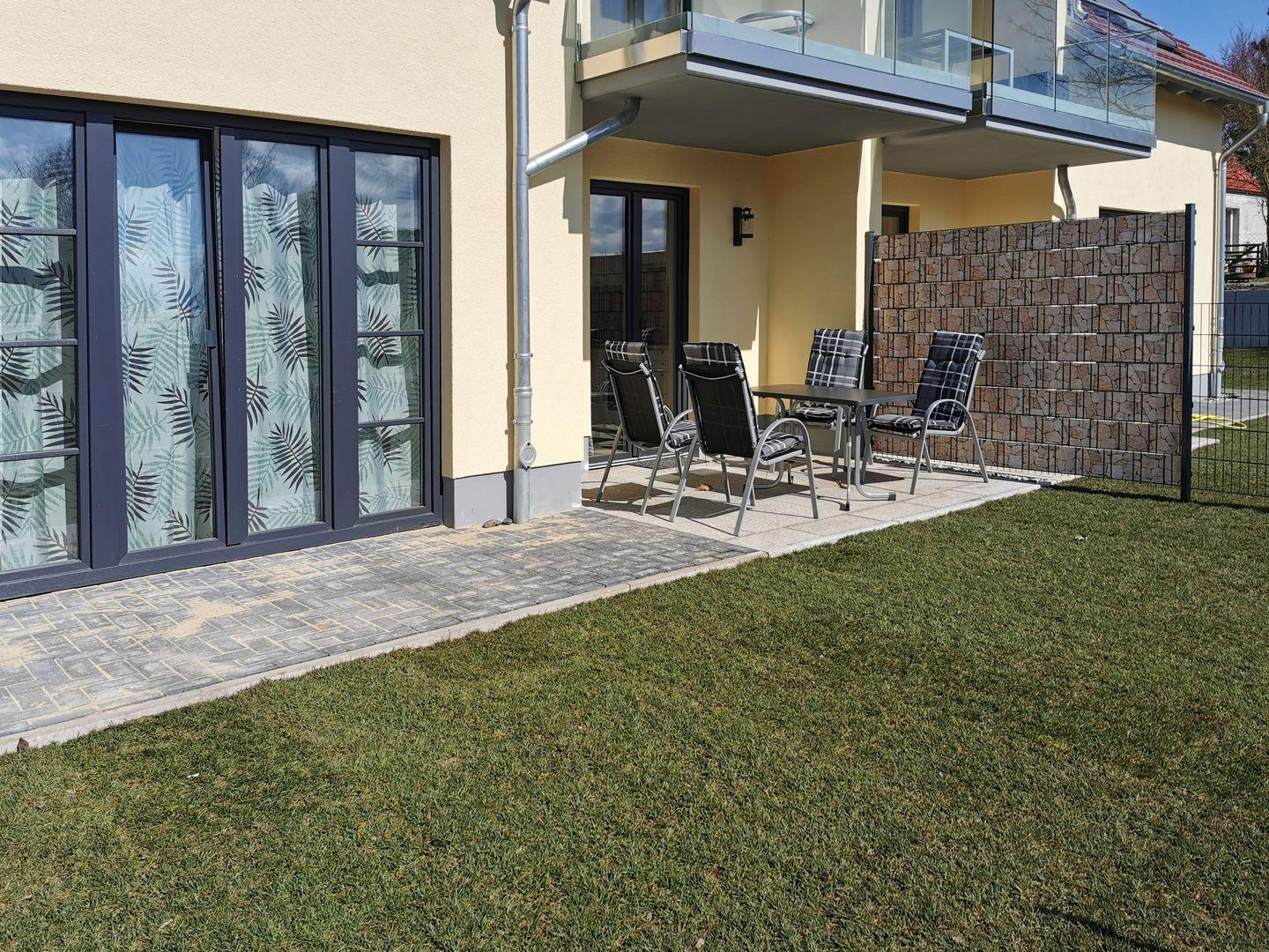 Vom Wohnzimmer aus gelangen Sie auf die schöne Terrasse mit Gartenmöbeln, wo Sie ab vormittags die Sonne genießen können.