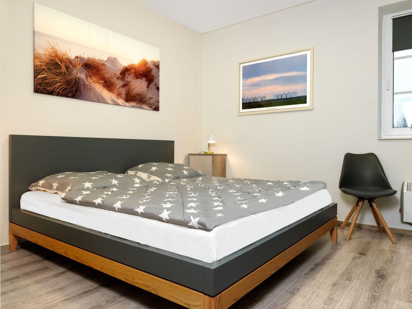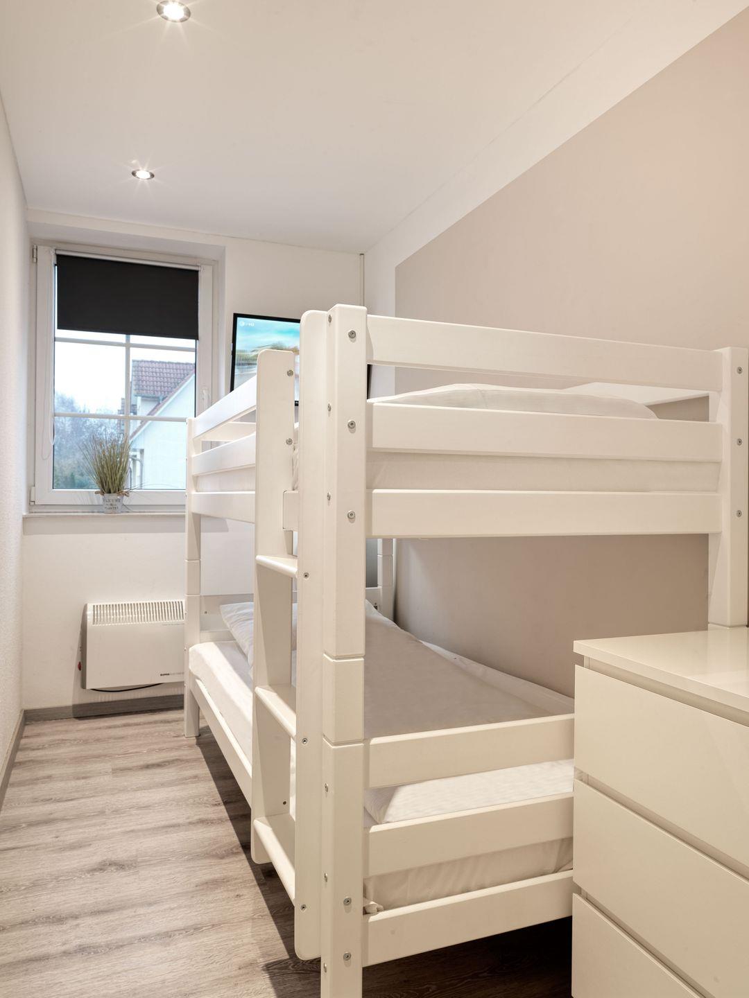 Diese Wohnung verfügt über ein Schlafzimmer mit Doppelbett sowie ein kleines Schlafzimmer mit Etagenbett mit 2.TV.