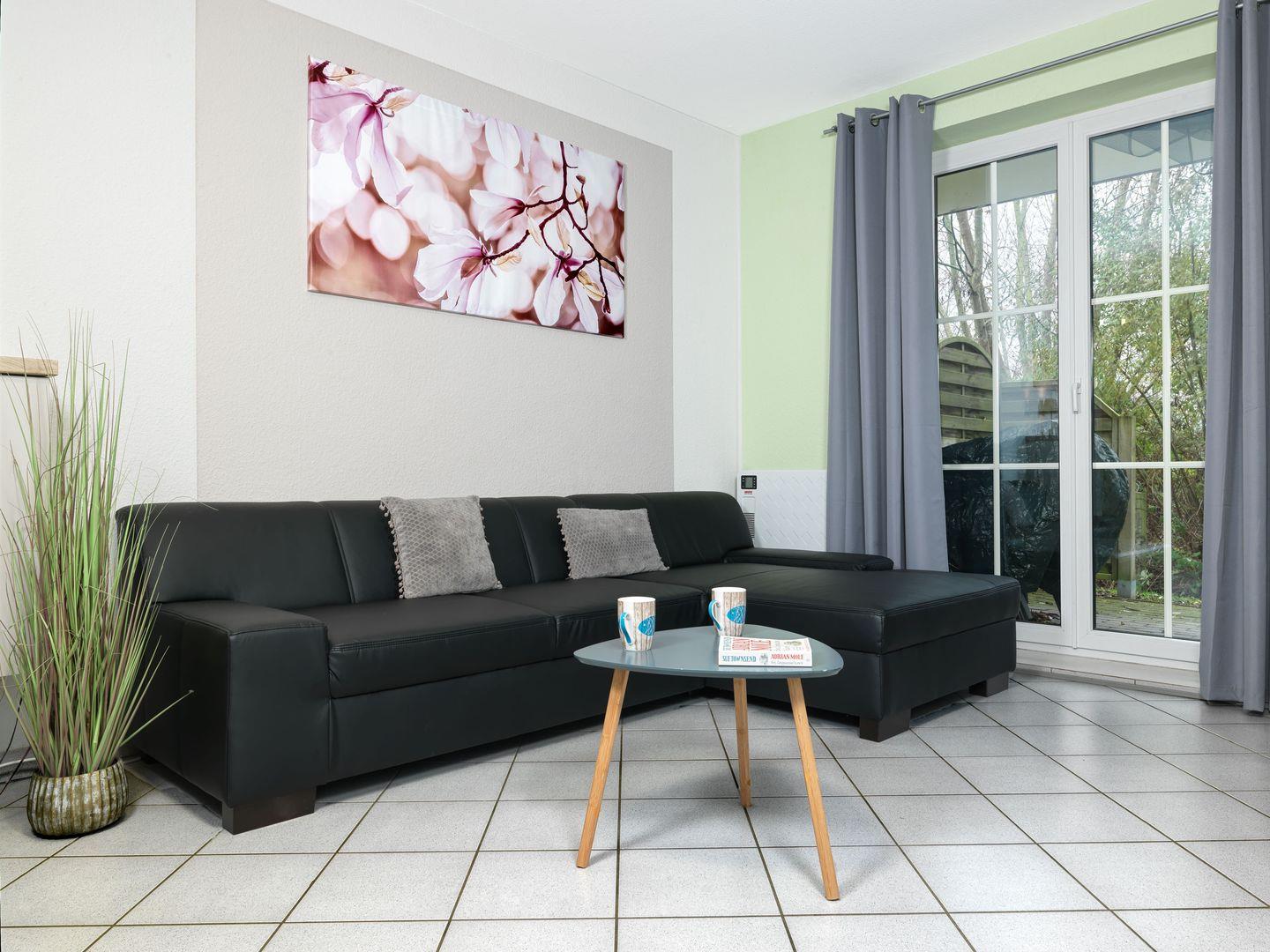 Ein gemütliches, helles Wohnzimmer mit TV/DVD/Radio/CD sowie einer hübschen Essecke in einem kleinen Erker lädt zum Wohlfühlen ein. Direkter Zugang vom Wohnzimmer zur 8m² großen Terrasse mit Gartenmöbeln in sonniger Süd-Lage mit freiem Blick ins Grüne.