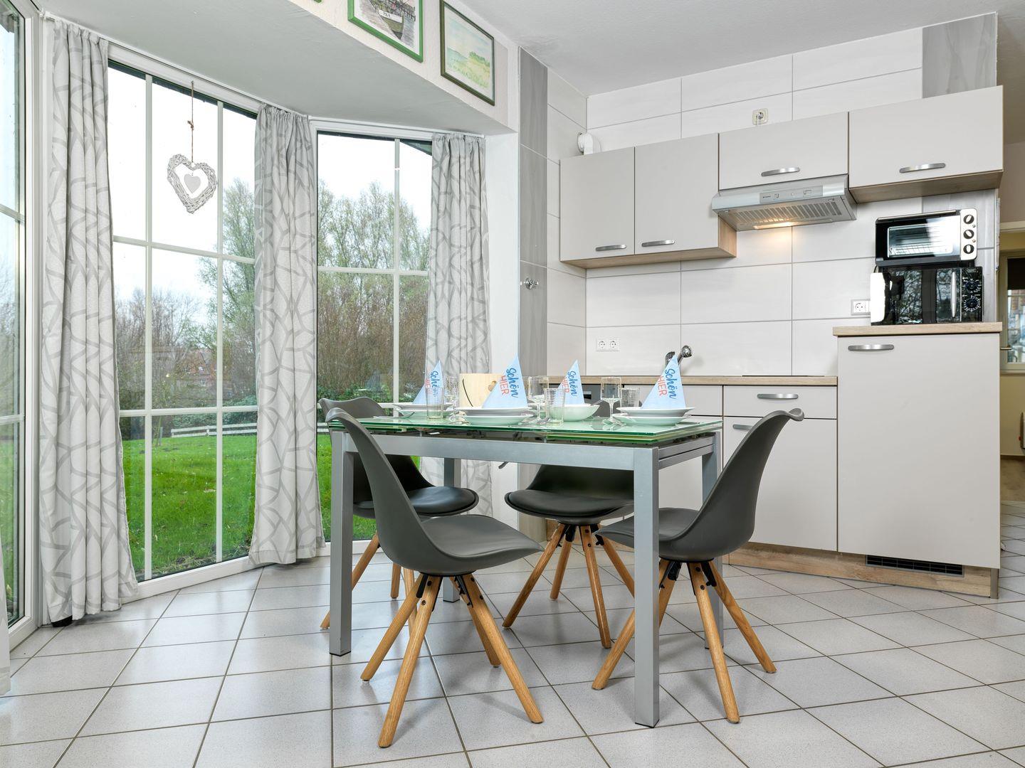 Eine kleine Küchenzeile mit Induktions-Herd, Spülmaschine, Kühlschrank, Kaffeemaschine, Toaster und Wasserkocher und Mikrowelle bietet alles was man für einen erholsamen Urlaub braucht.