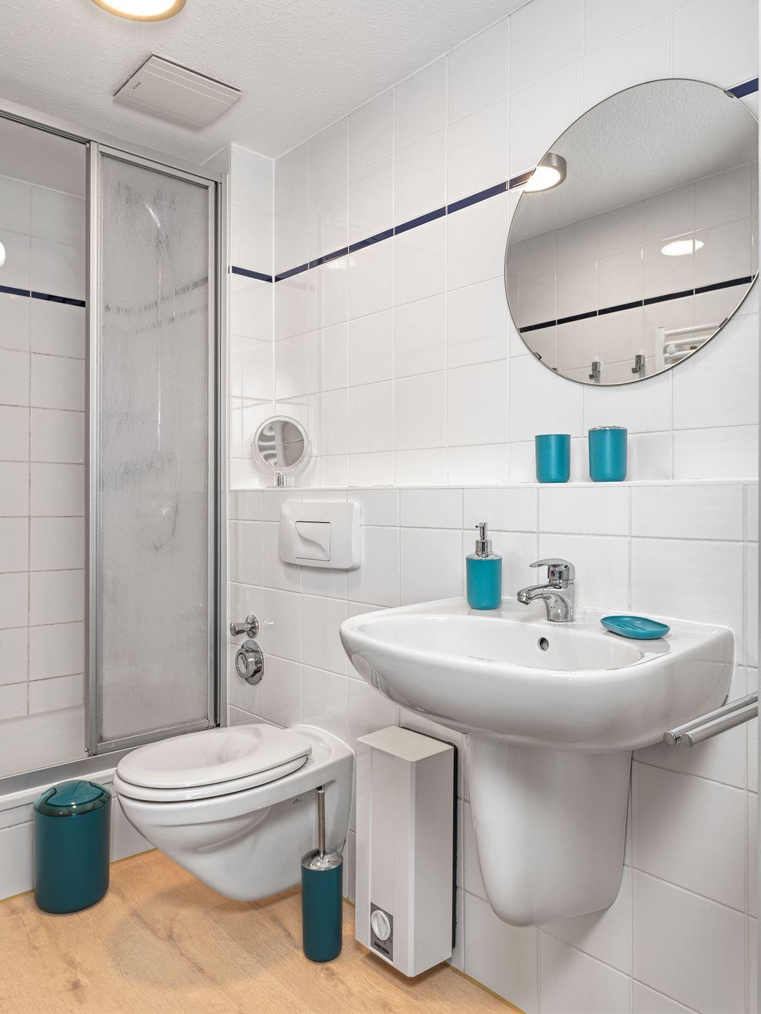 Das Bad ist ausgestattet mit Dusche, WC, Waschbecken und Ablagemöglichkeiten.
