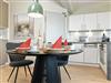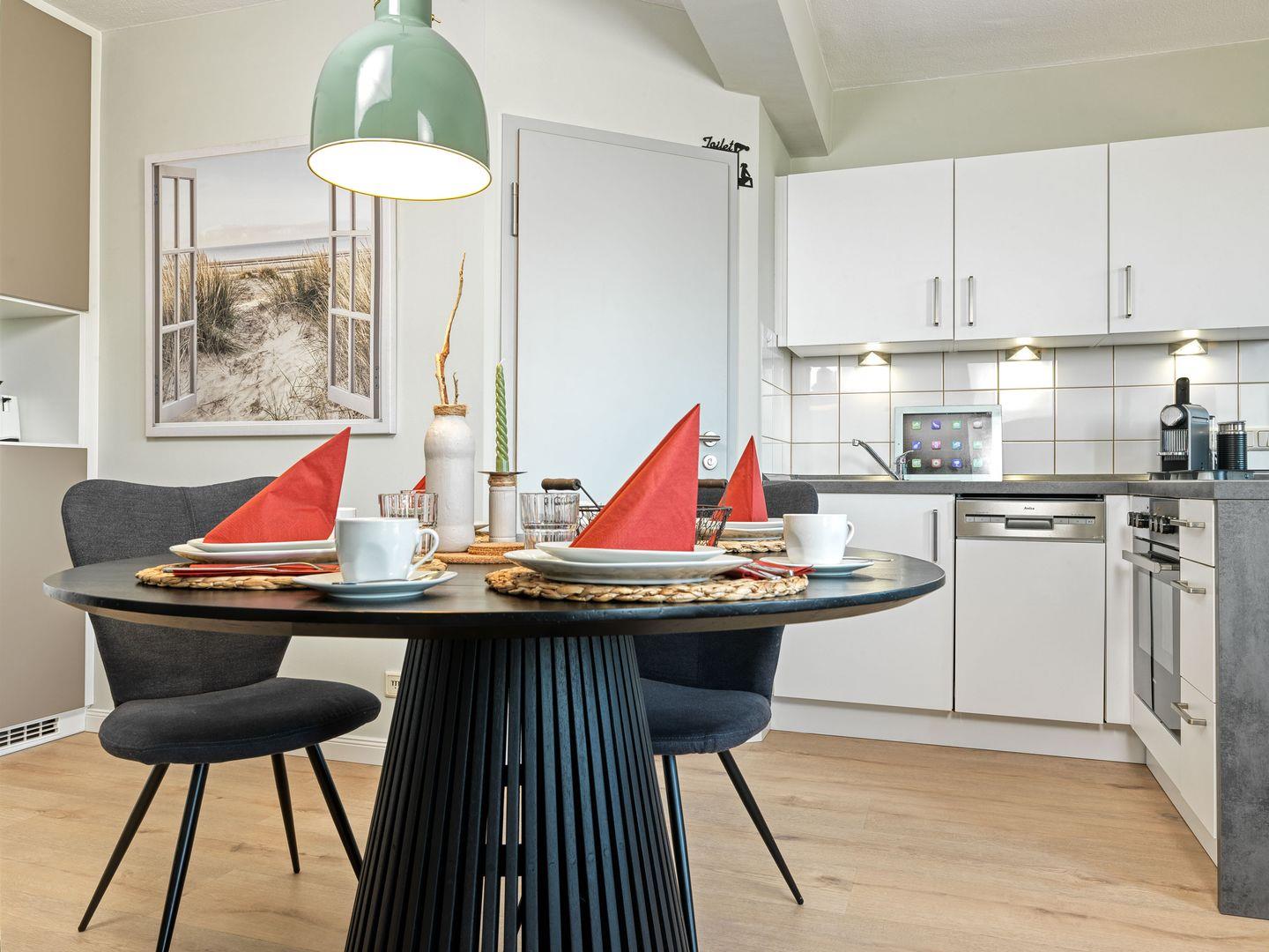 Im Mittelpunkt steht der große Esstisch, der zum geselligen Verweilen einlädt.
