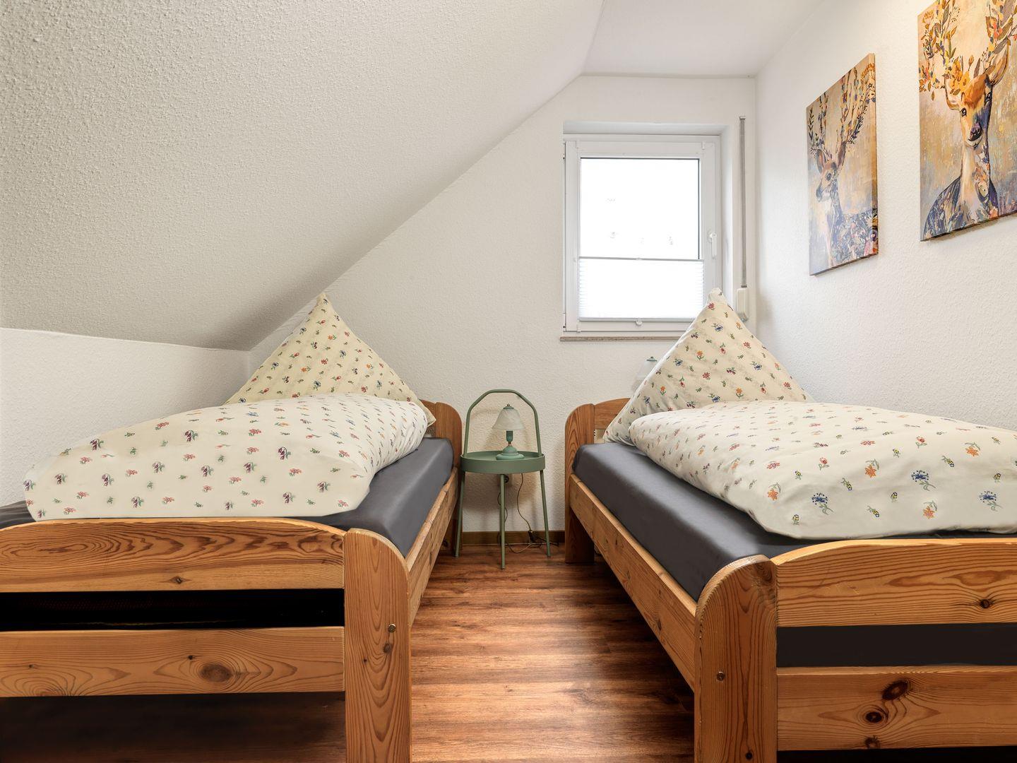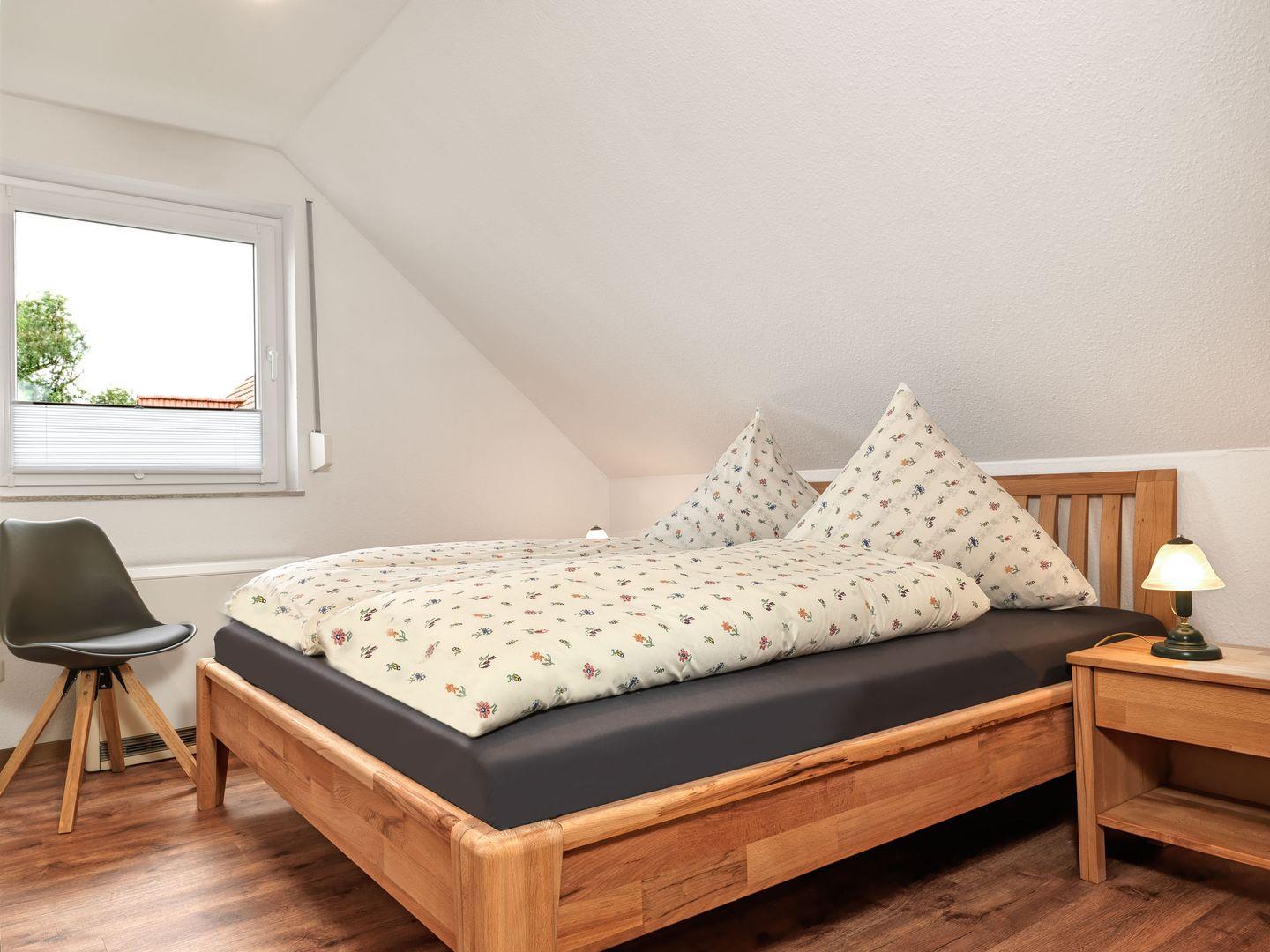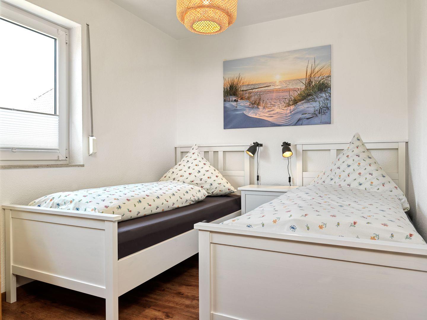 Gemütliches Schlafzimmer (mit TV) mit Doppelbett (180x200) sowie ein kleines Schlafzimmer mit 2 Einzelbetten finden Sie im OG.