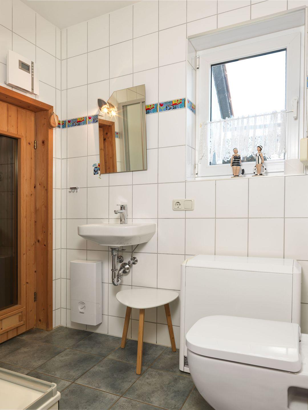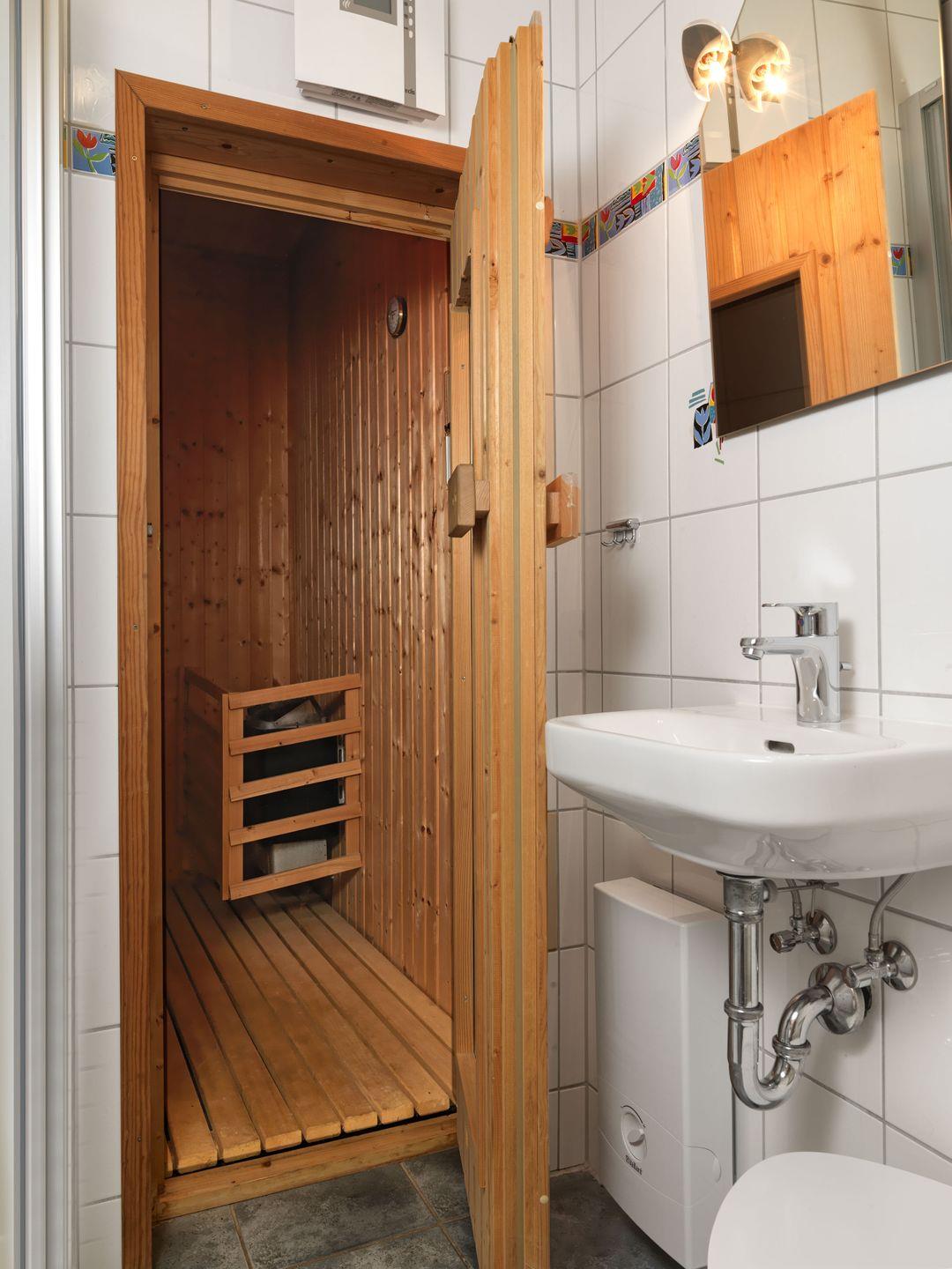 Ein helles Badezimmer, ausgestattet mit Sauna, Dusche und WC rundet das EG ab.