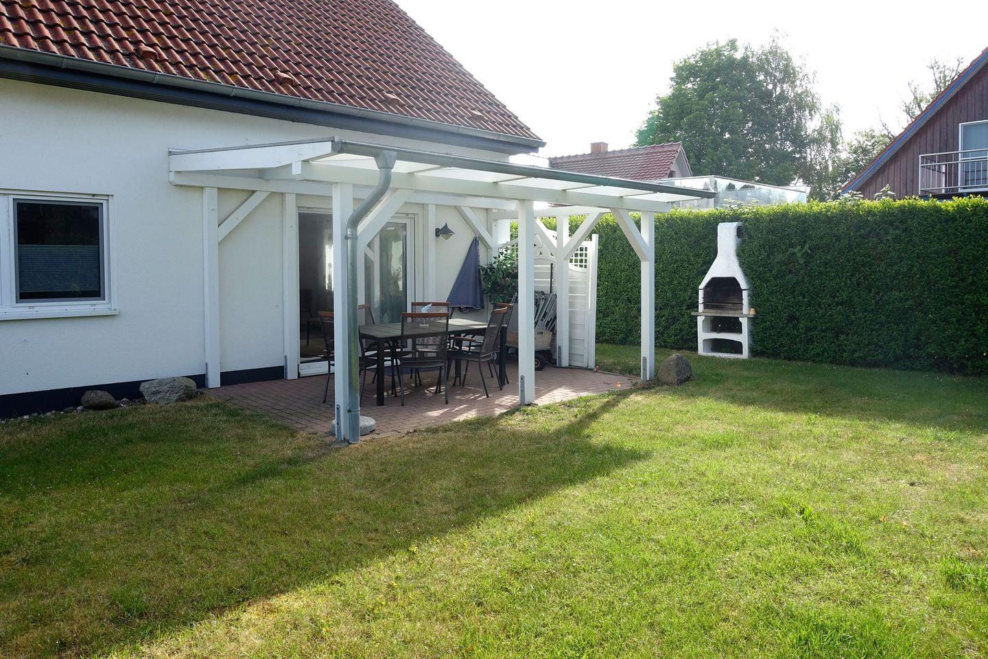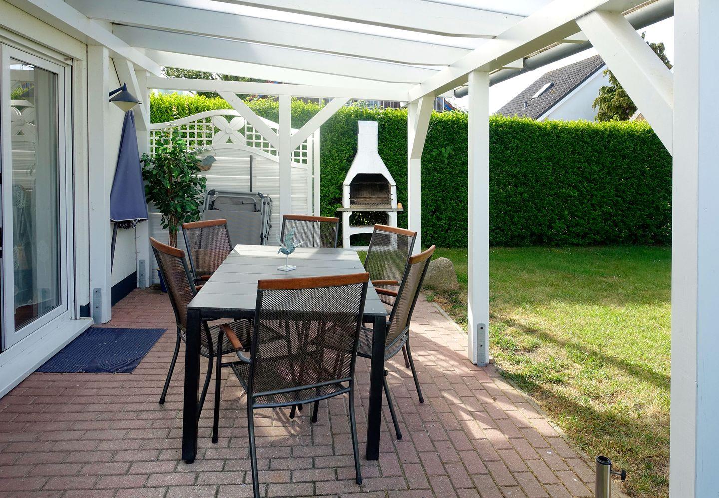 Vom Wohnzimmer aus gelangen Sie auf die große Terrasse mit Terrassenmöbeln und Grill sowie ein schönes, rundum von Hecken eingezäuntes Grundstück. Das ist vor allem für Eltern mit kleinen Kindern und/oder Hunden ideal. Ein Schlafzimmer mit 2 Einzelbetten steht im UG für Sie bereit.