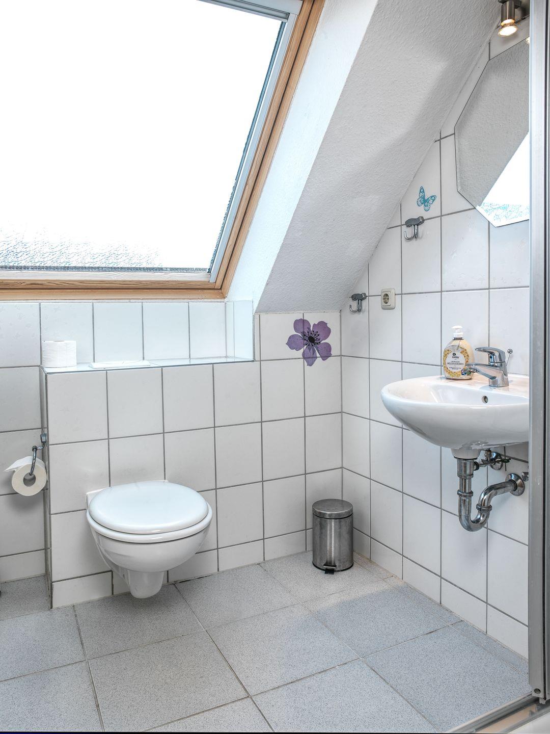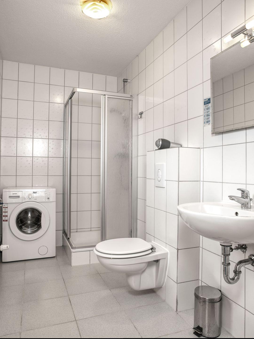 Ein helles Badezimmer, ausgestattet mit Dusche, WC und Waschmaschine rundet das EG ab.