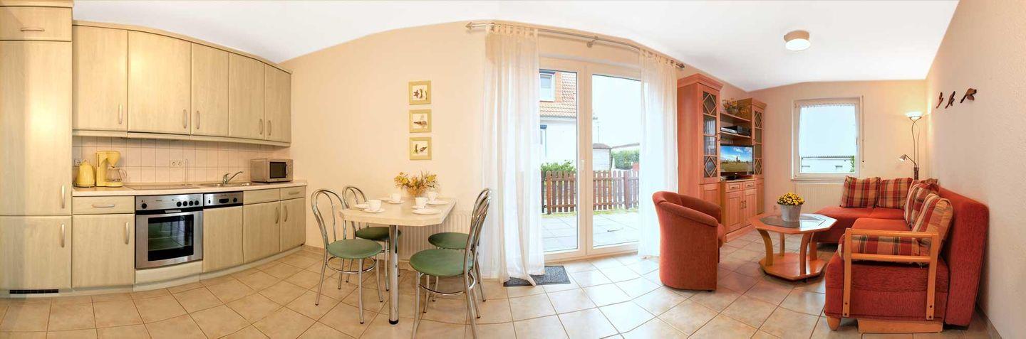 Im Erdgeschoß erwartet Sie ein helles Wohnzimmer mit Küchenzeile sowie Zugang zur kleinen Terrasse mit Markise Ein Flach-TV sowie eine Anlage mit Radio-/CD-/MP3 Player stehen für Ihre Unterhaltung bereit.