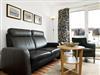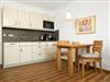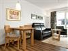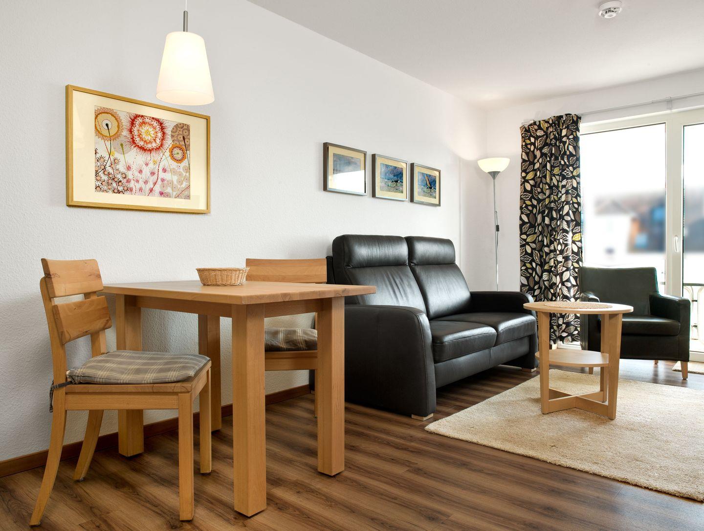 Das freundliche Wohnzimmer mit einer Küchenzeile lädt ein zum gemütlichen Verweilen. Die offene Küchenzeile verfügt über einen 2-Platten-Herd, Mikrowelle und einen Geschirrspüler und einem Esstisch.