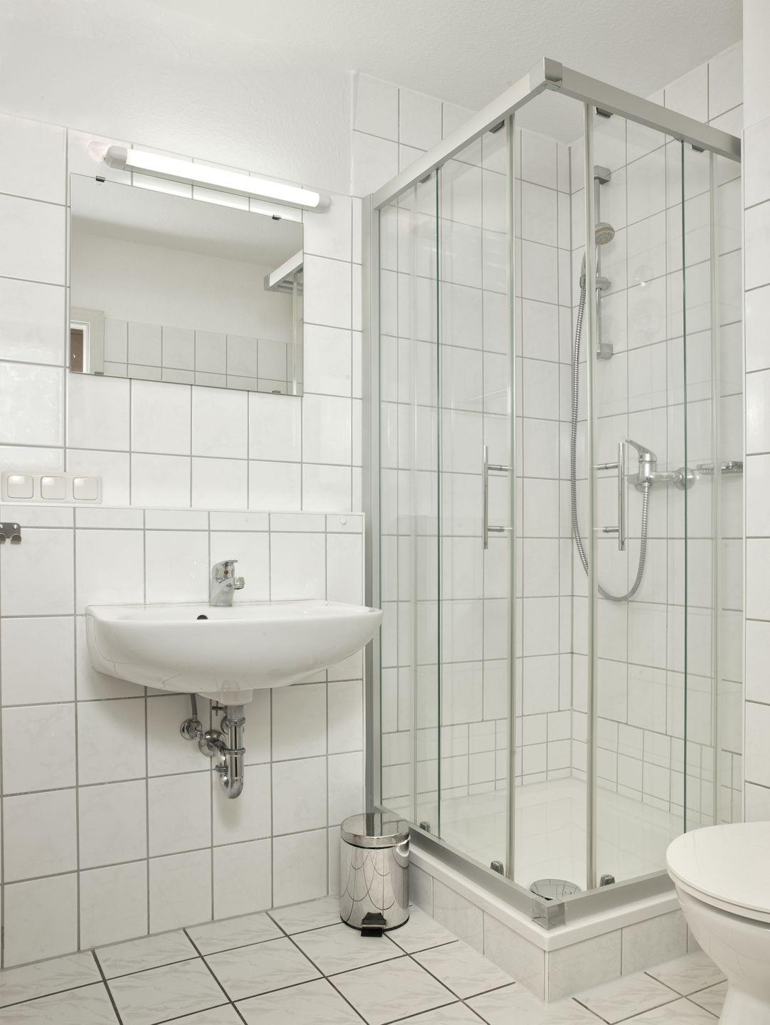 Das Bad verfügt über WC, Dusche und Waschbecken.