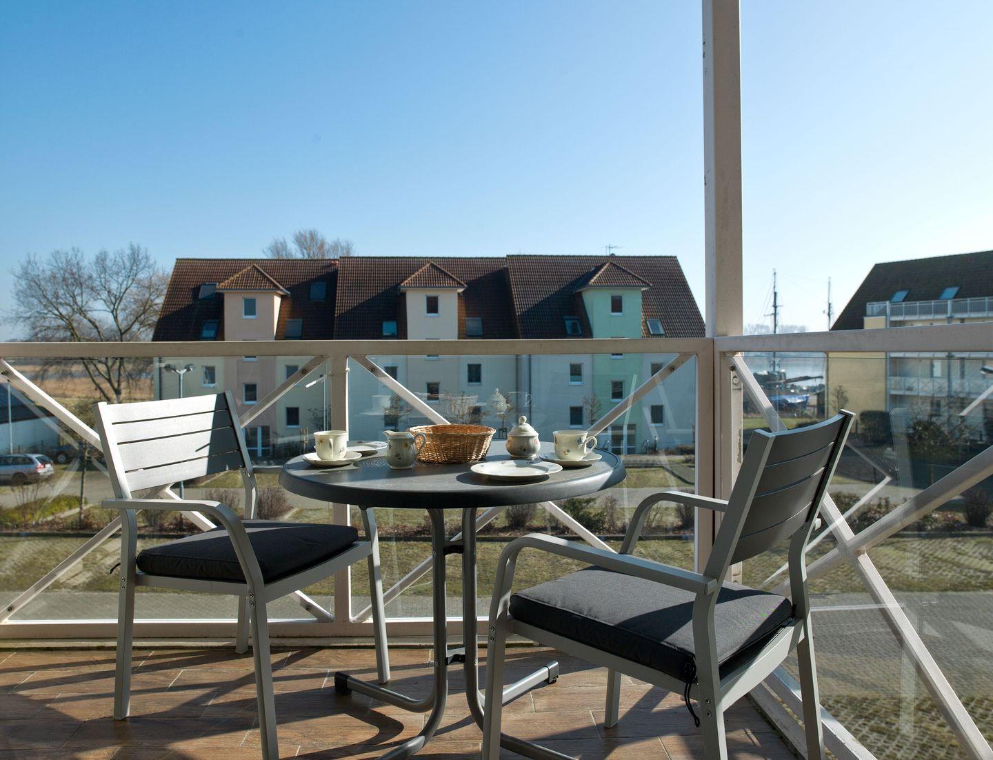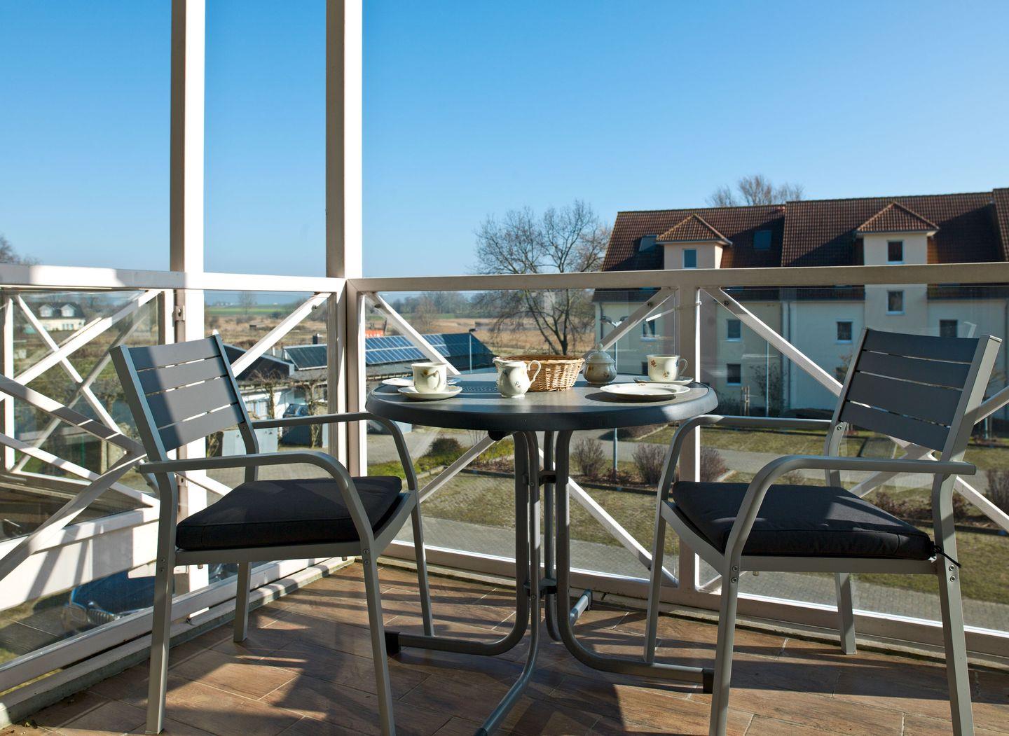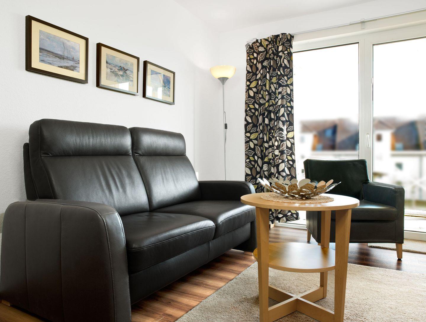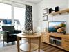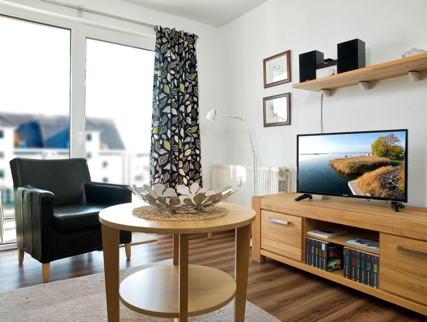 Das Wohnzimmer mit einer gemütlichen Couch, Fernseher und einem schönen Balkon mit neuen Balkonmöbeln macht den Urlaub rundum gelungen. Vom Balkon haben Sie seitlich