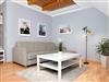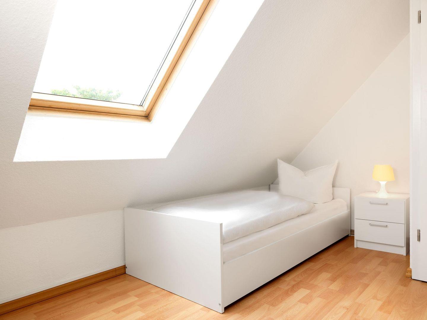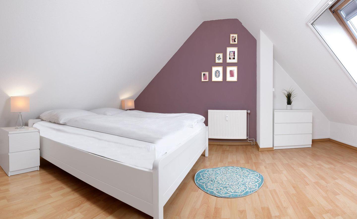 Das großzügige Schlafzimmer liegt im Spitzboden über dem Wohnzimmer.