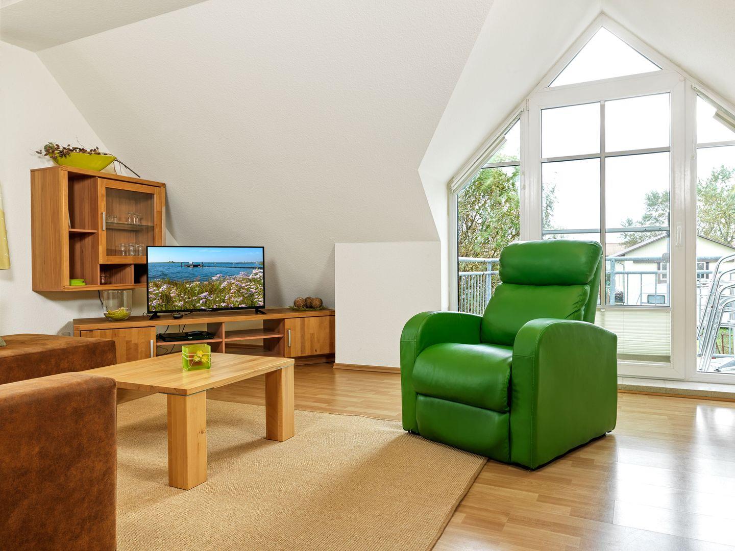 Kuscheliges Wohnzimmer mit Kabel-TV und Blick ins Grüne. Von dort aus gelangen Sie auf den schönen Balkon, der mit Gartenmöbeln ausgestattet ist.